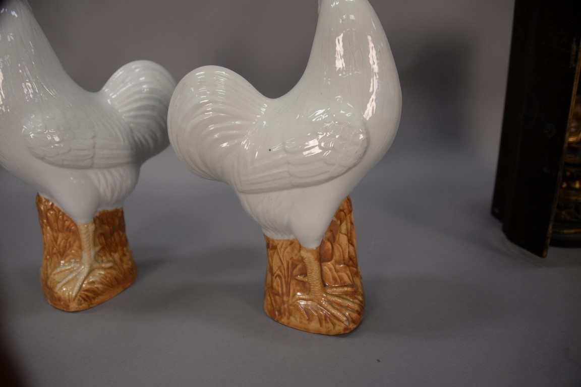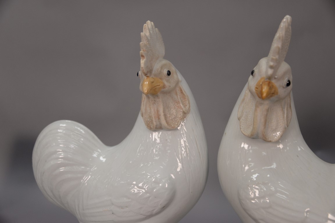 Lot 477: Pair of Chinese porcelain roosters having a white glazed body, salt glazed head, and light brown glazed legs with seal mark on botto…