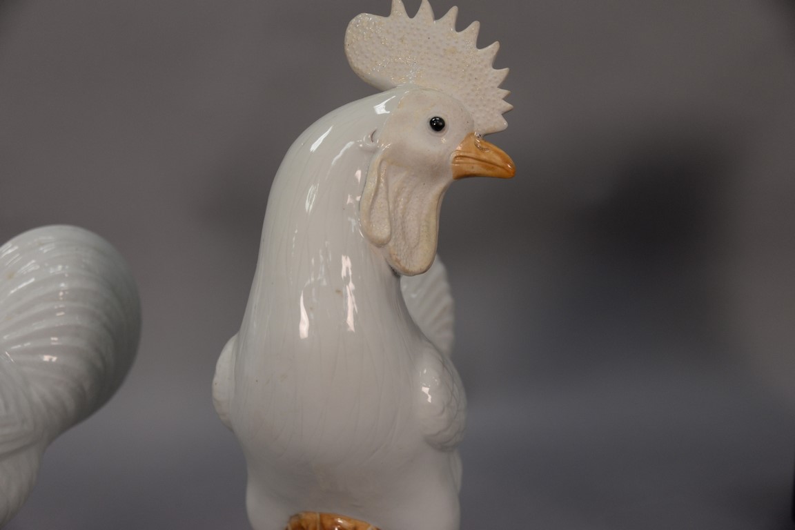 Pair of Chinese porcelain roosters having a white glazed body, salt glazed head, and light brown glazed legs with seal mark on bottom. ht. 16in.