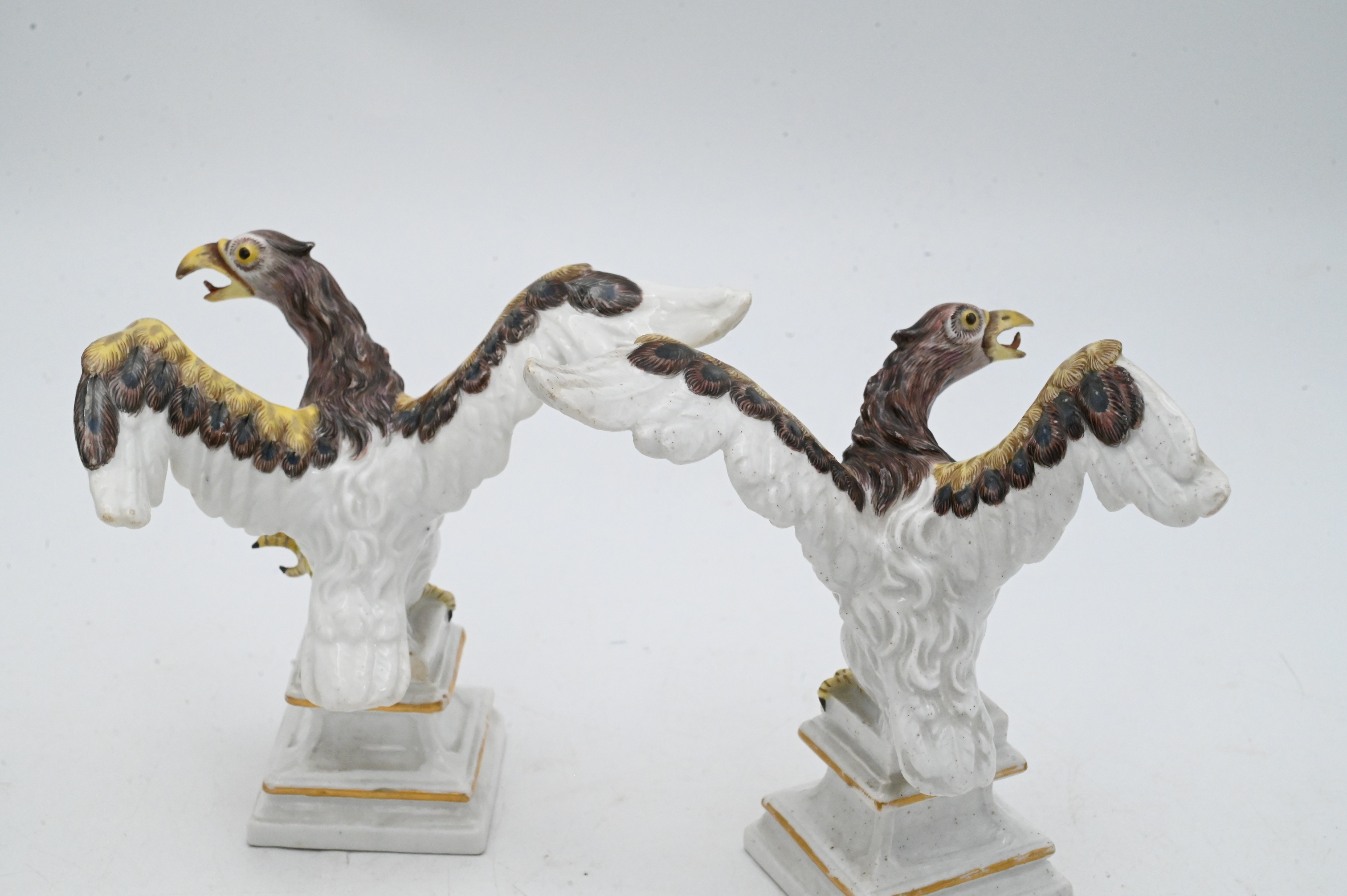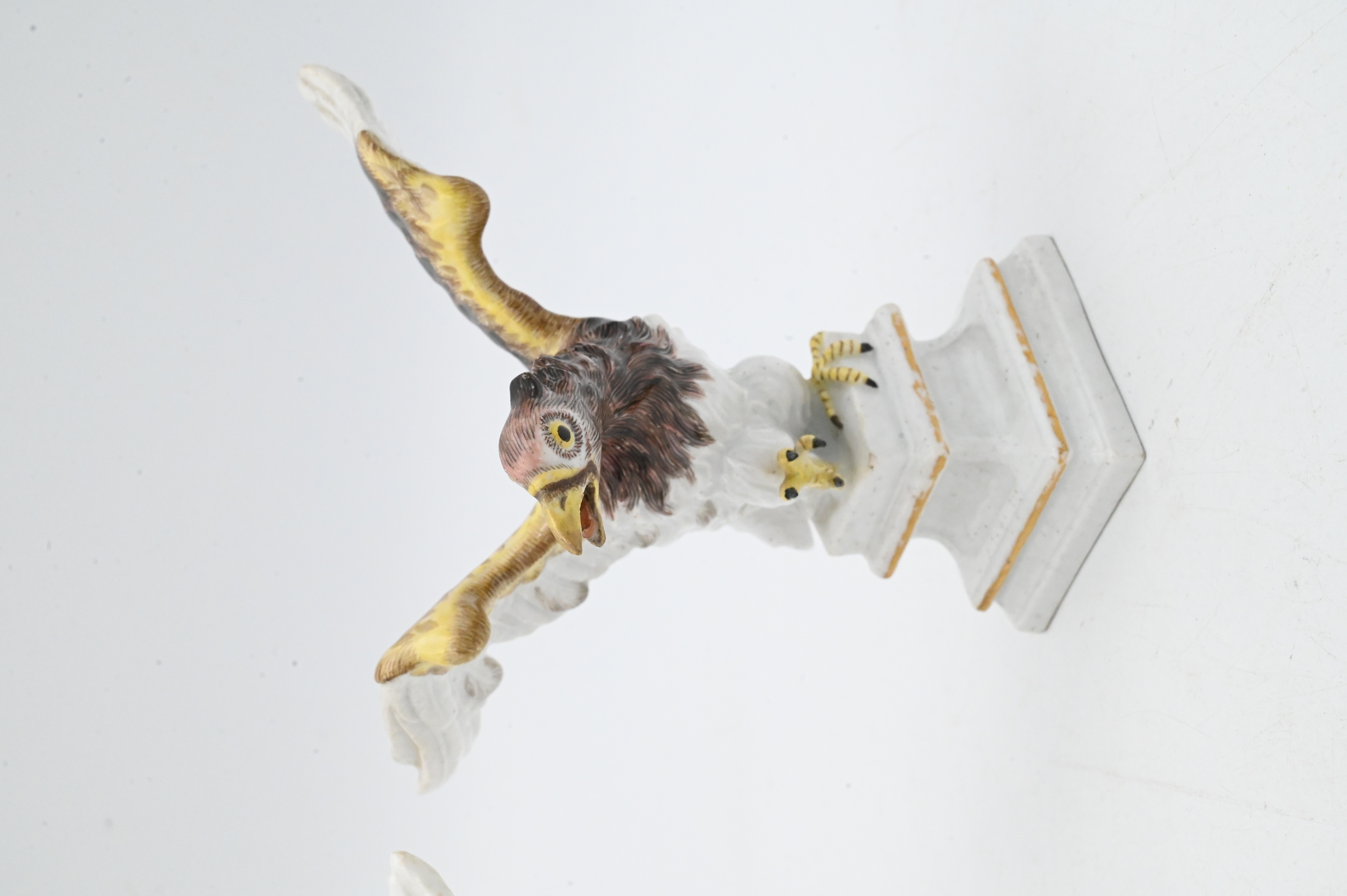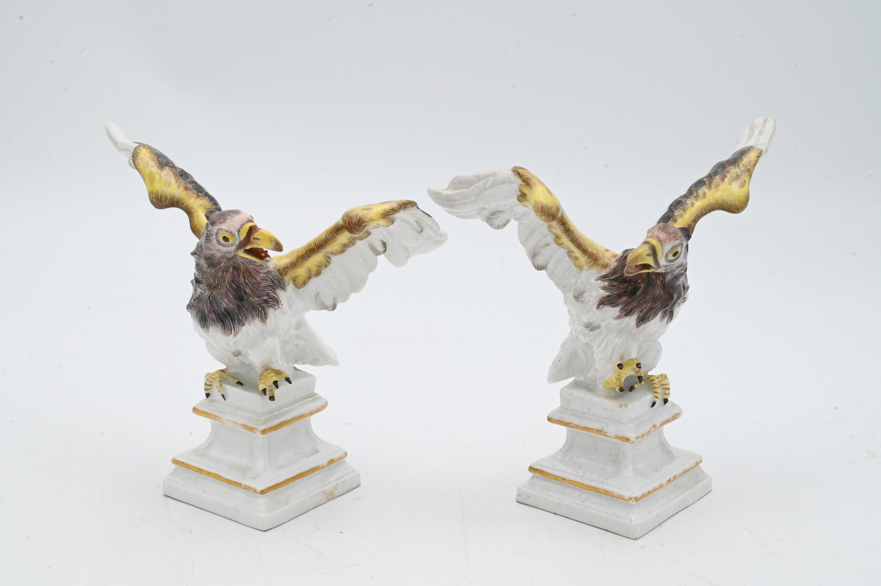Each modeled as an eagle with outstretched wings perched on a stepped square base, detailed in polychrome enamels and gilt highlights, possibly Meissen