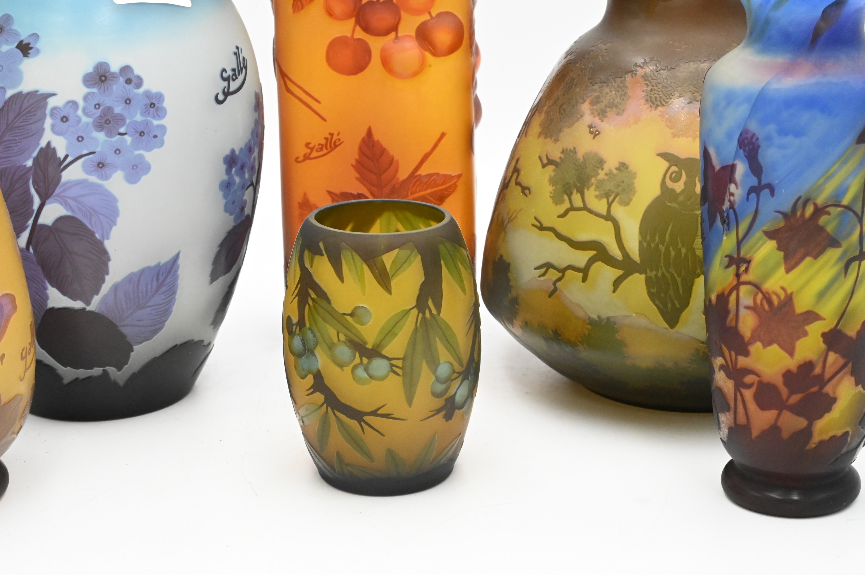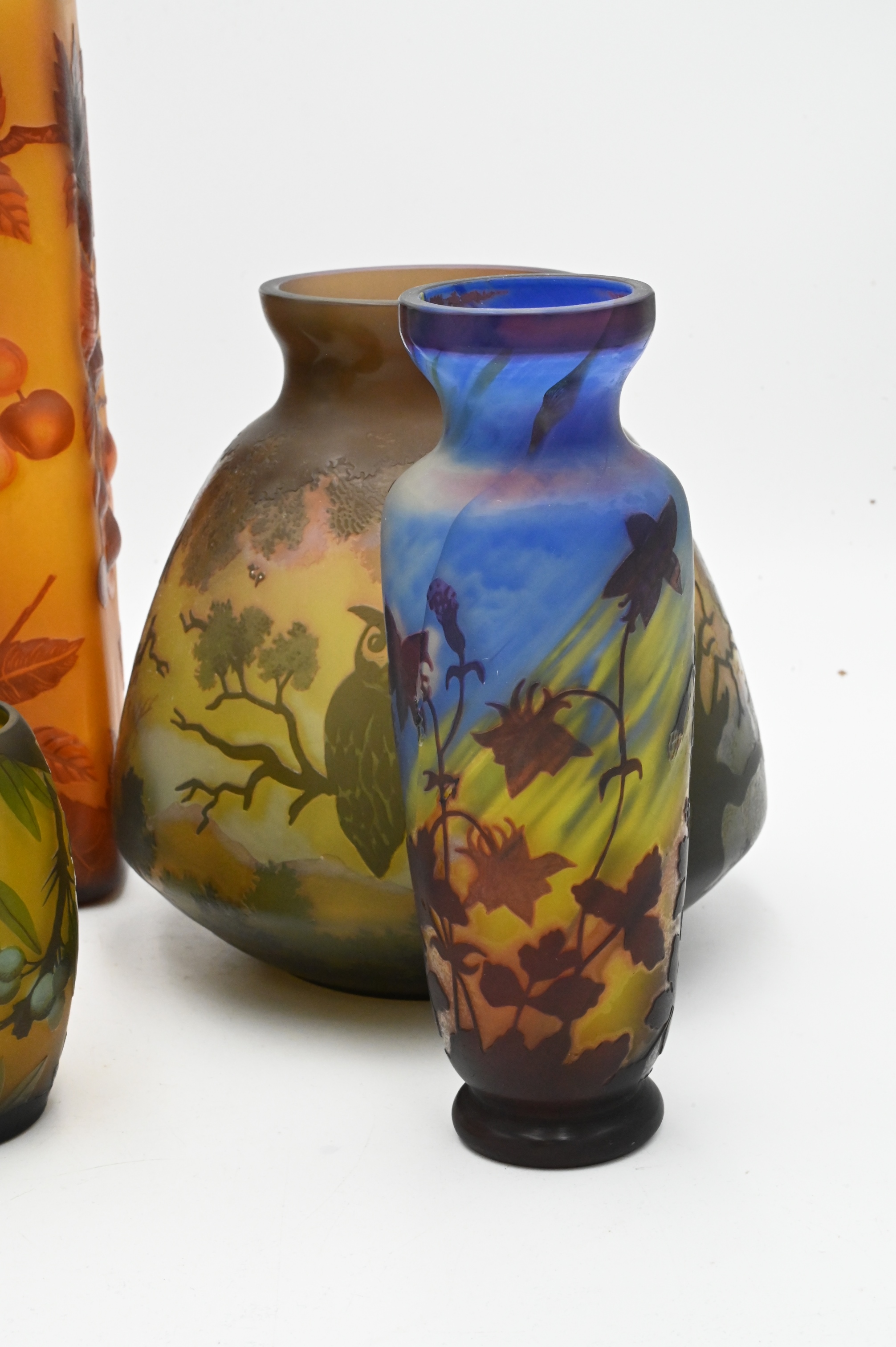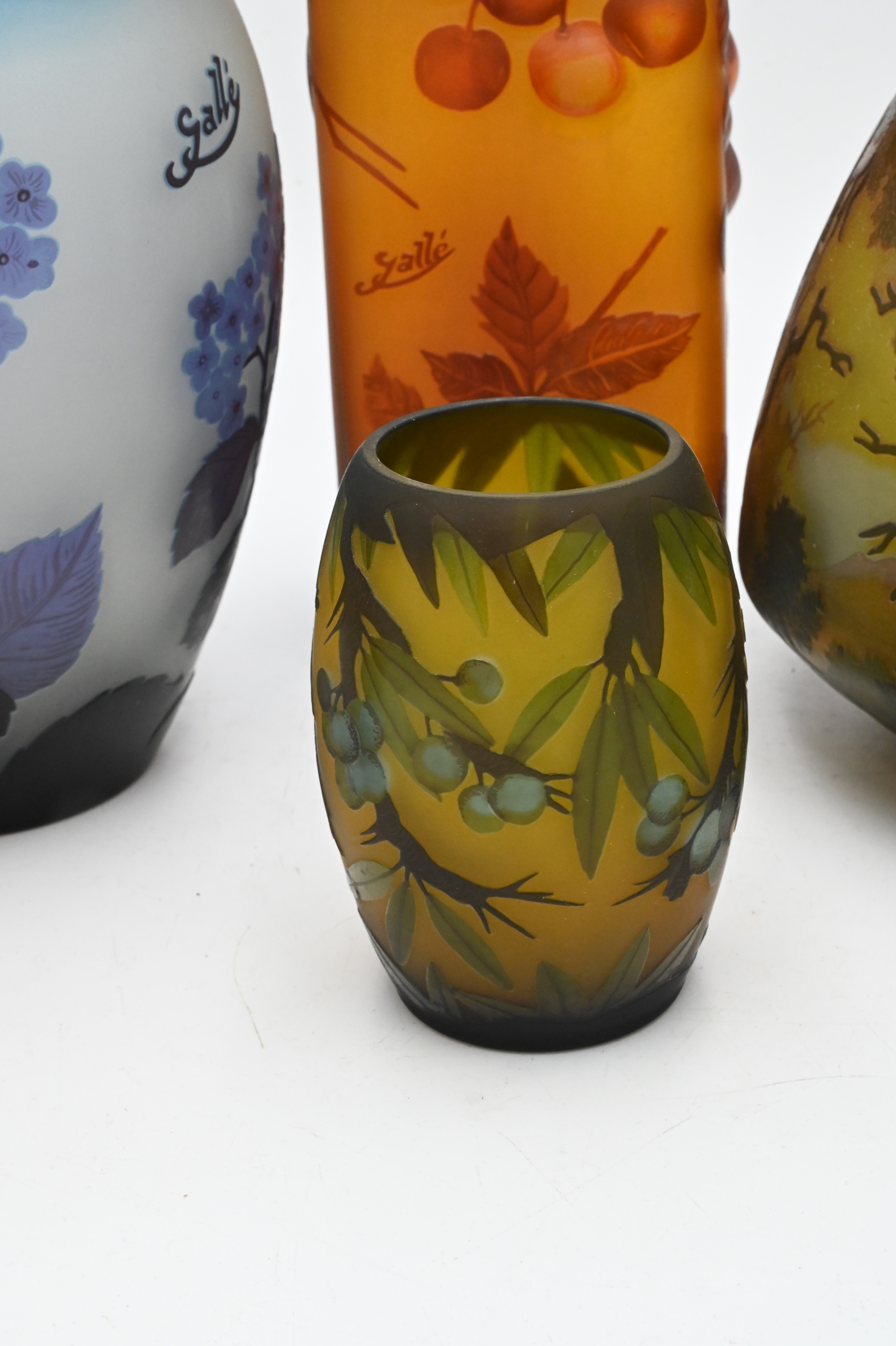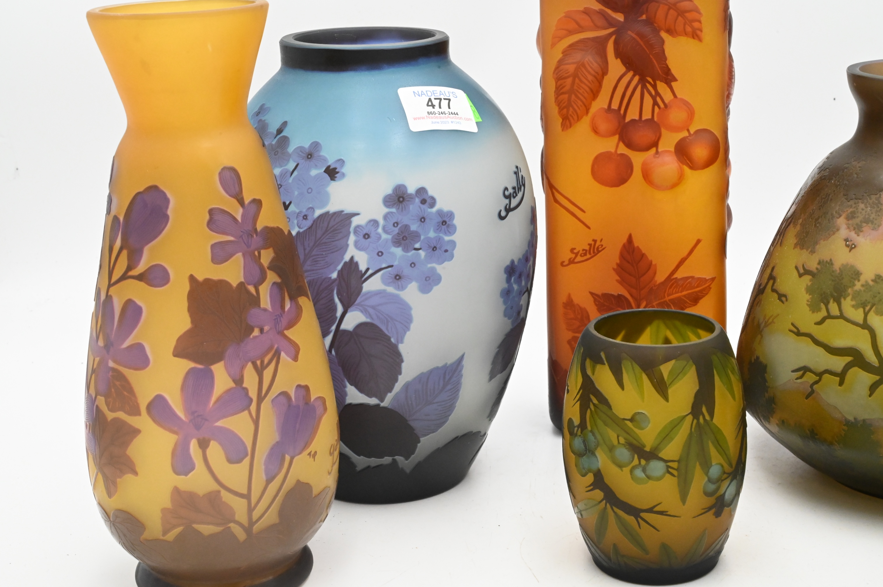 Six Acid Etched Vases, signed Galle, heights 4 1/2 inches – 12 inches, Provenance Estate of Peter Tillou, Litchfield, Connecticut.
