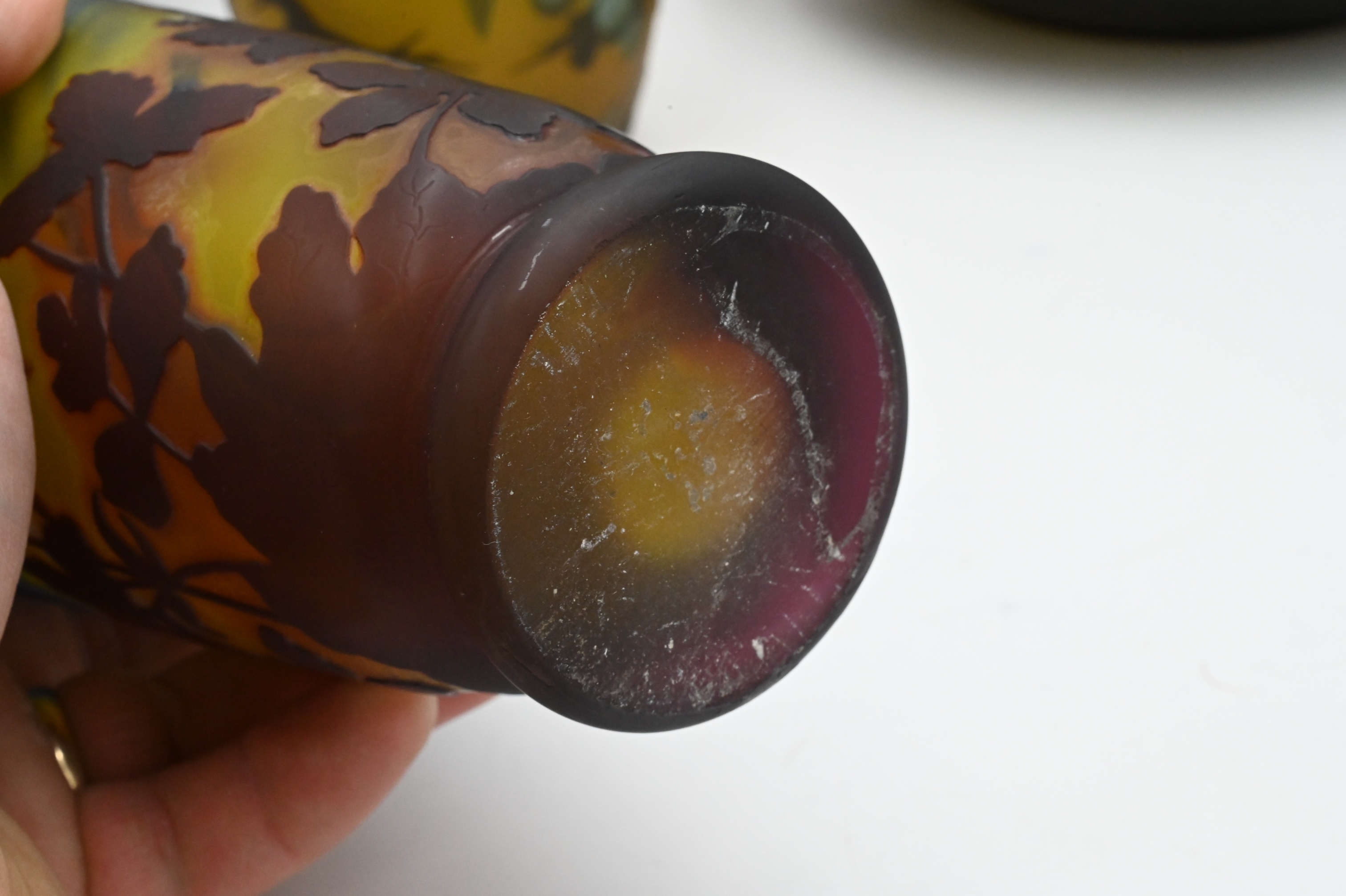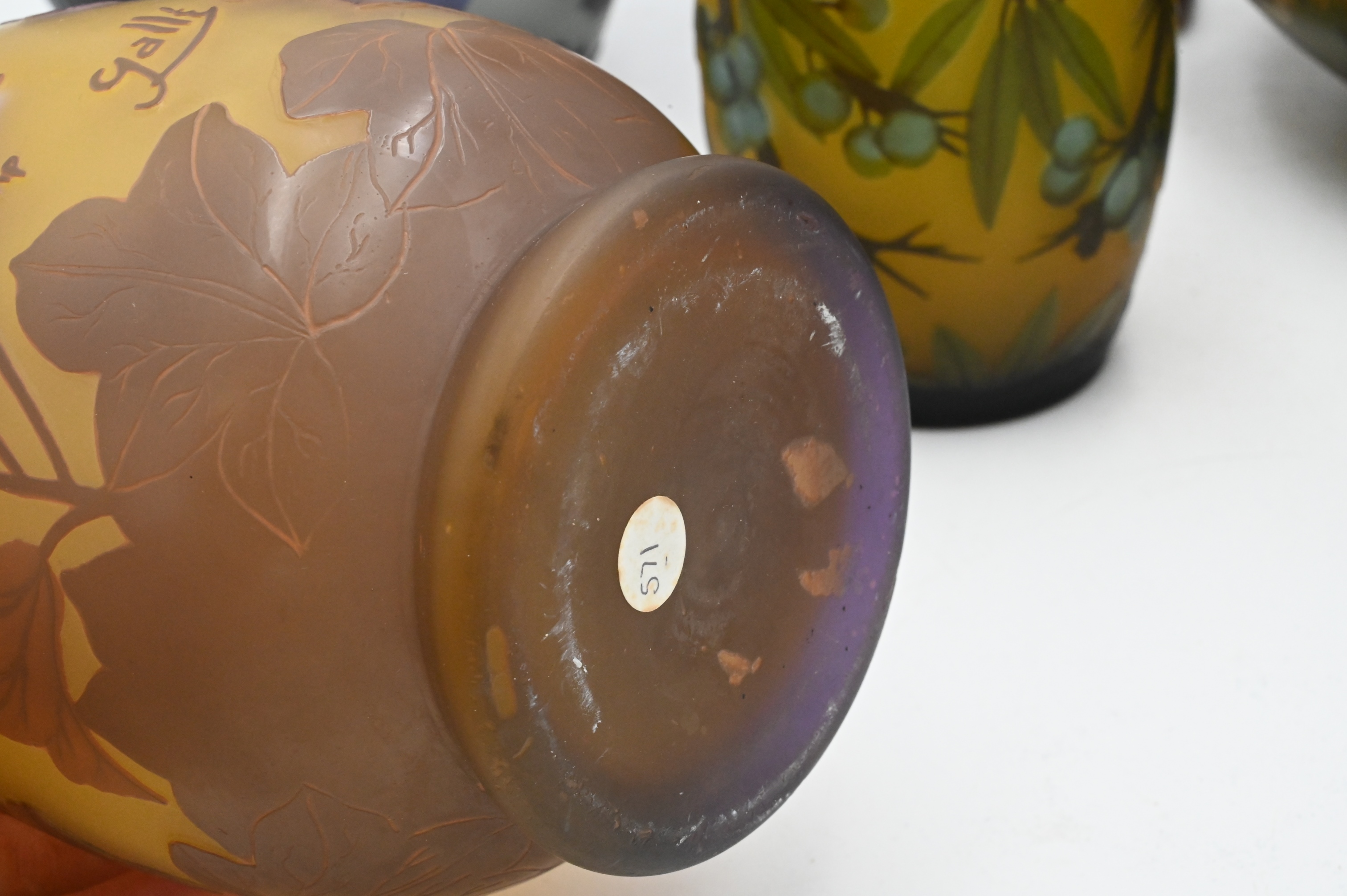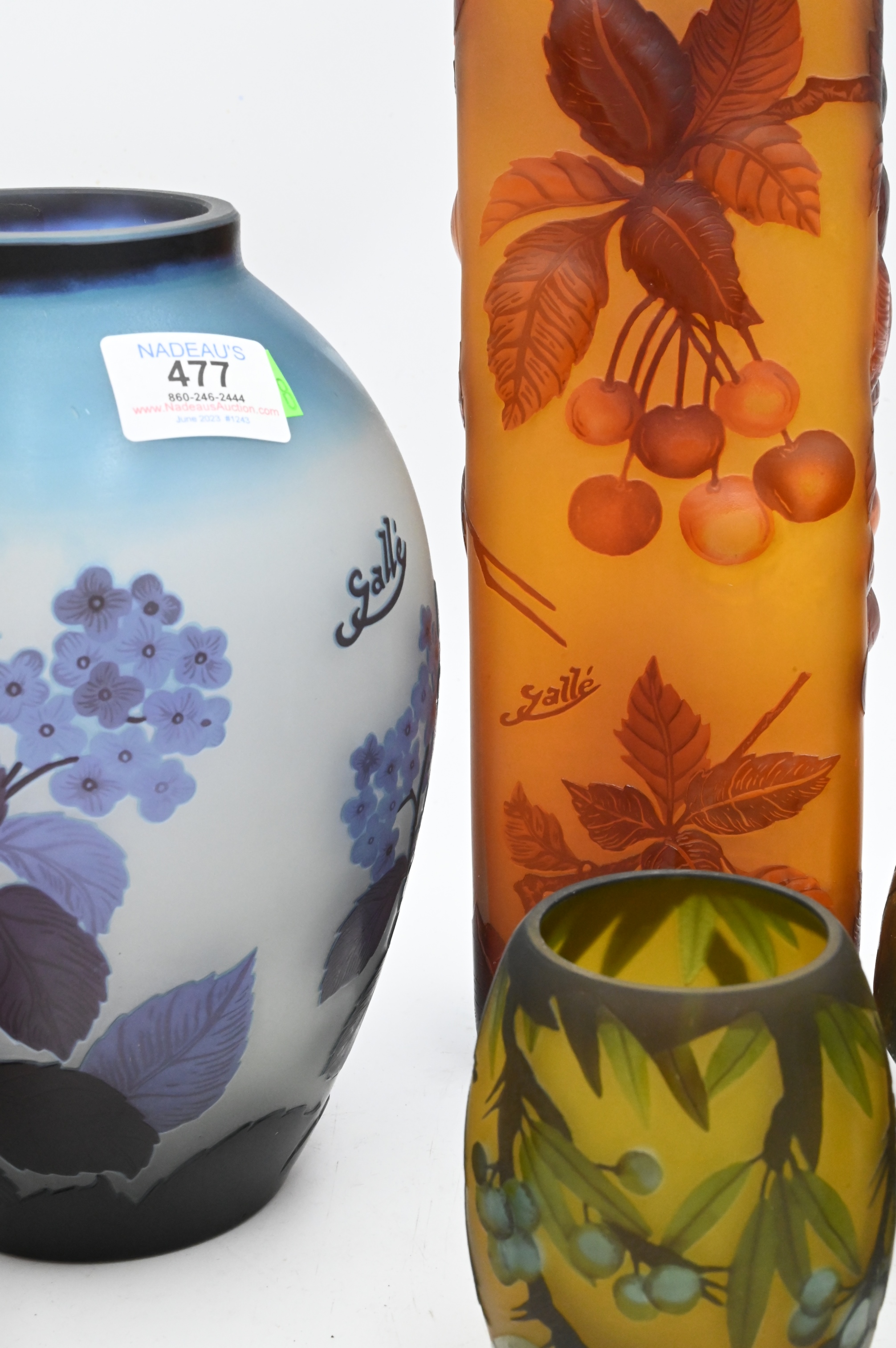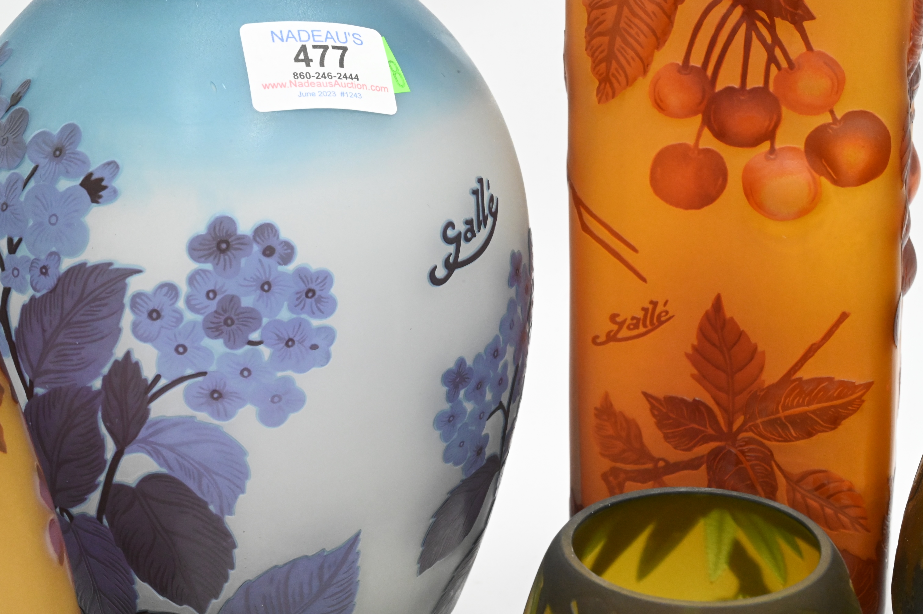 Six Acid Etched Vases, signed Galle, heights 4 1/2 inches – 12 inches, Provenance Estate of Peter Tillou, Litchfield, Connecticut.