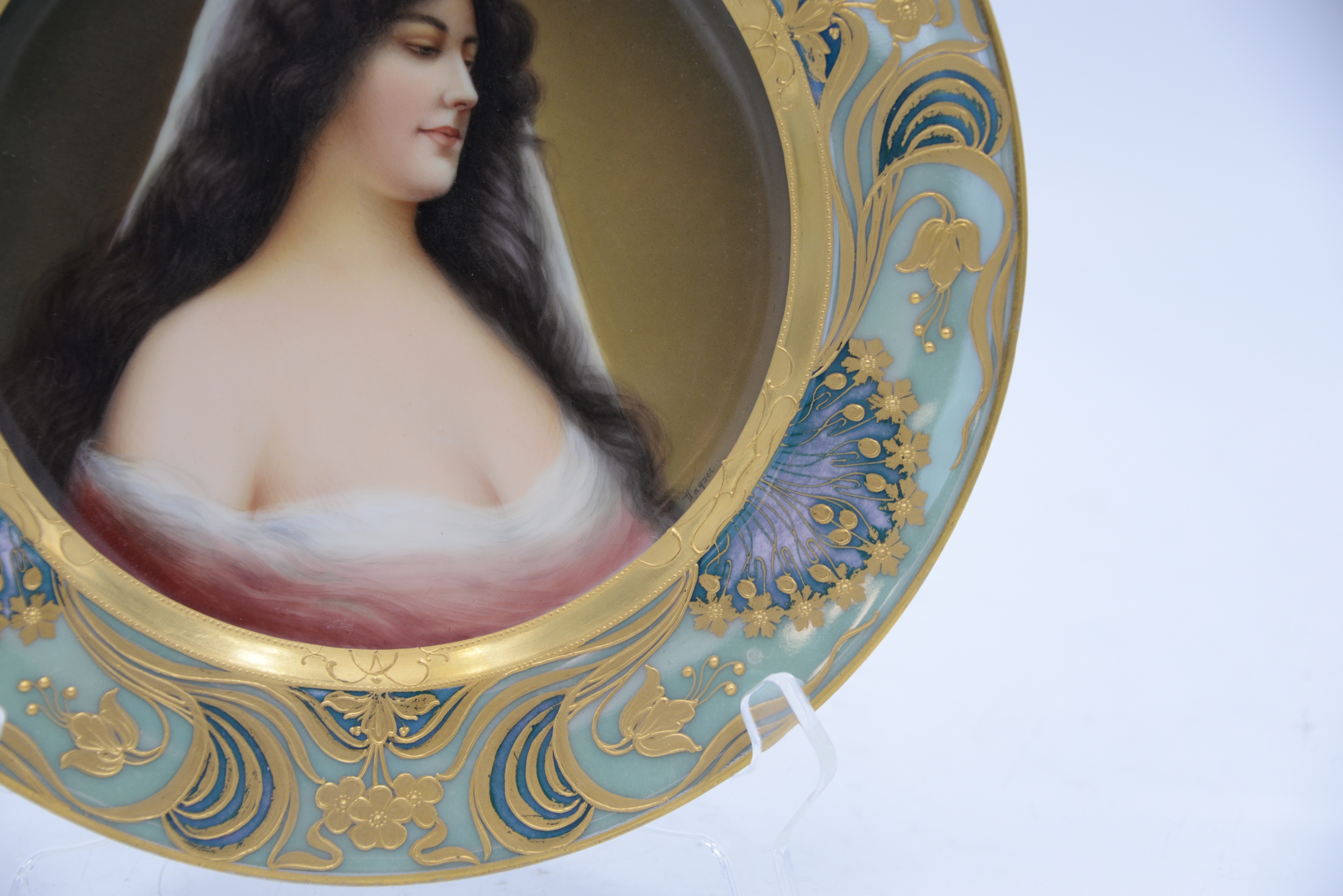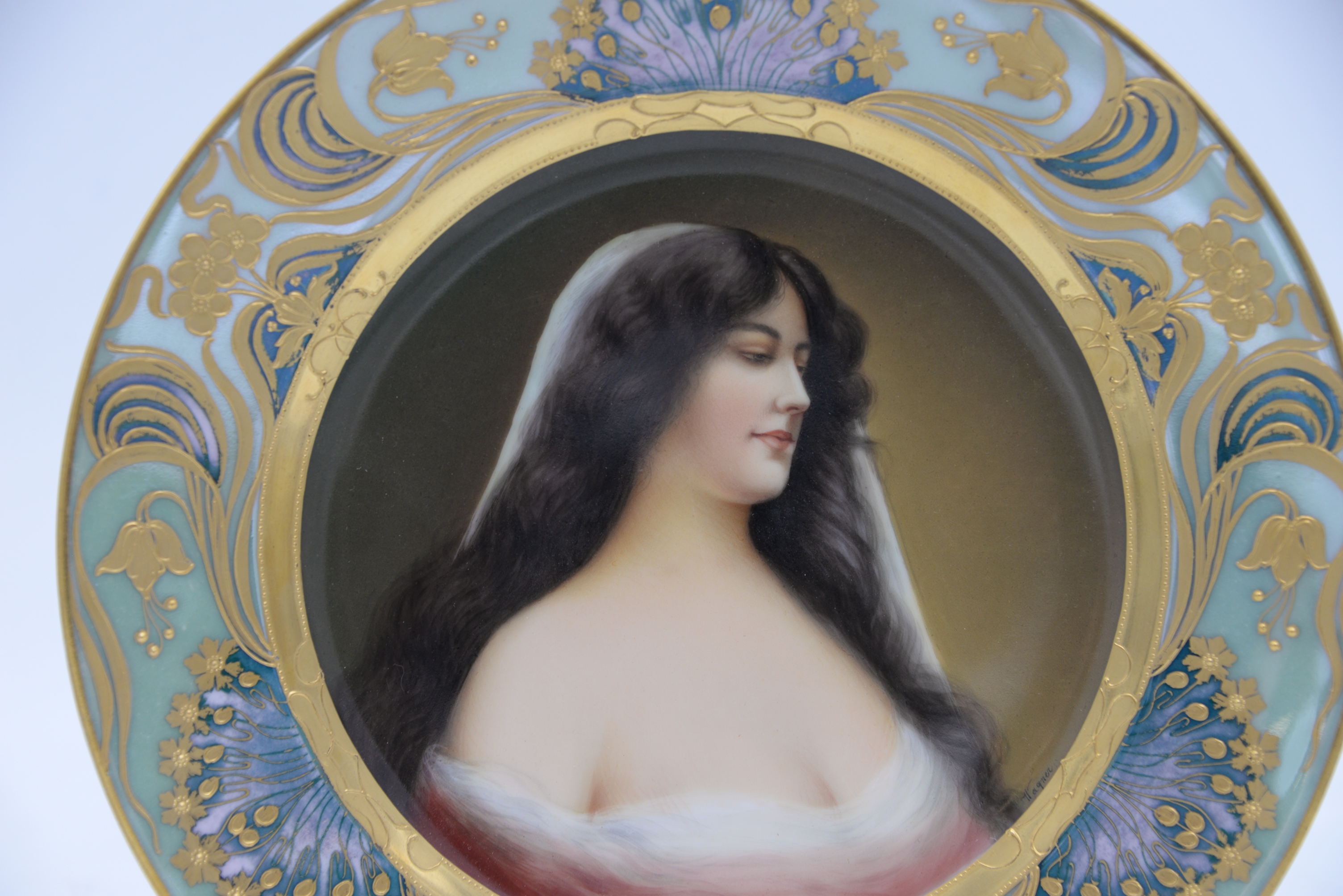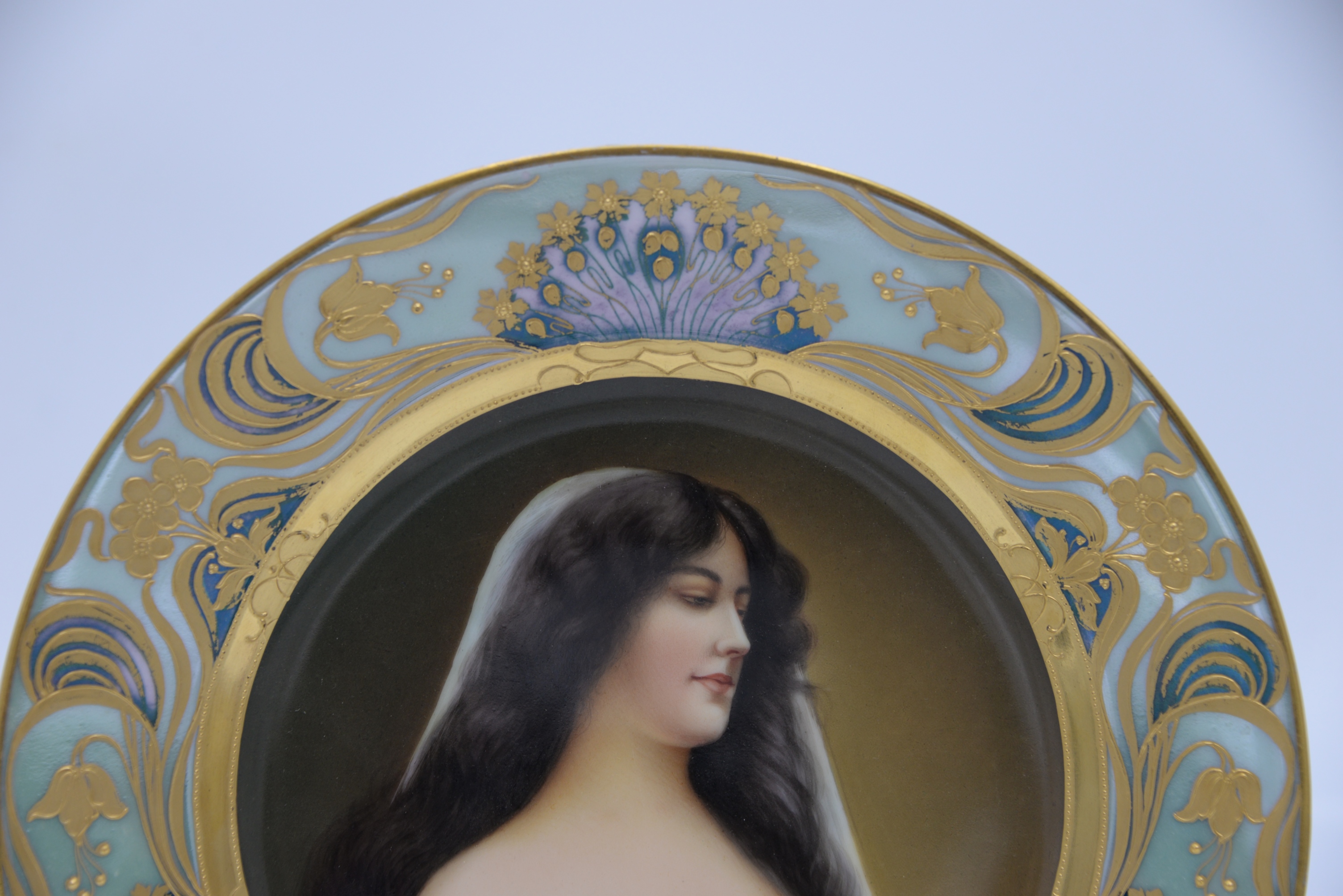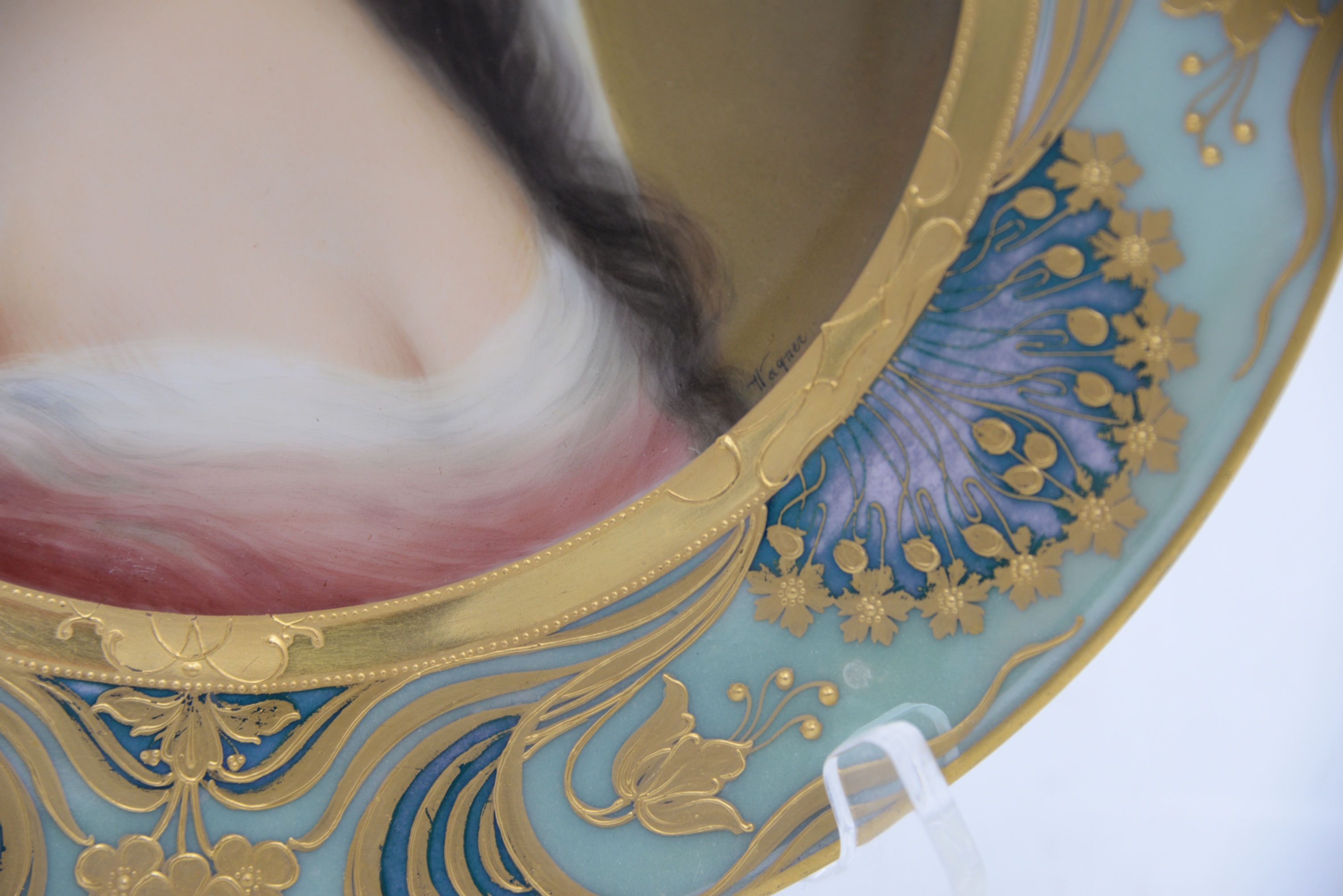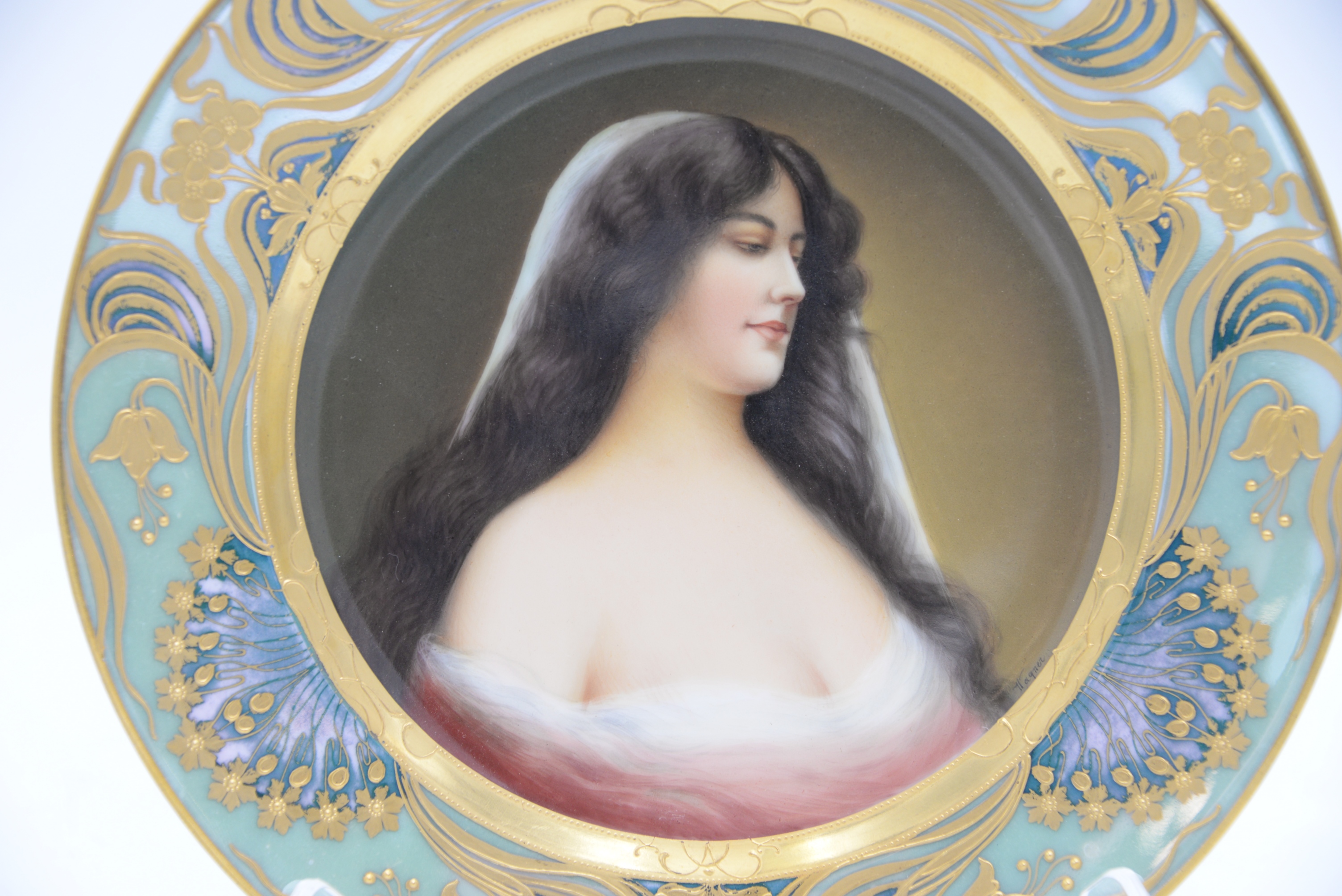 Wagner Royal Vienna Portrait Plate, young veiled woman, with high relief border, signed “Wagner” lower right, stamped with Royal Vienna beehive on reverse, diameter 9 3/4 inches.