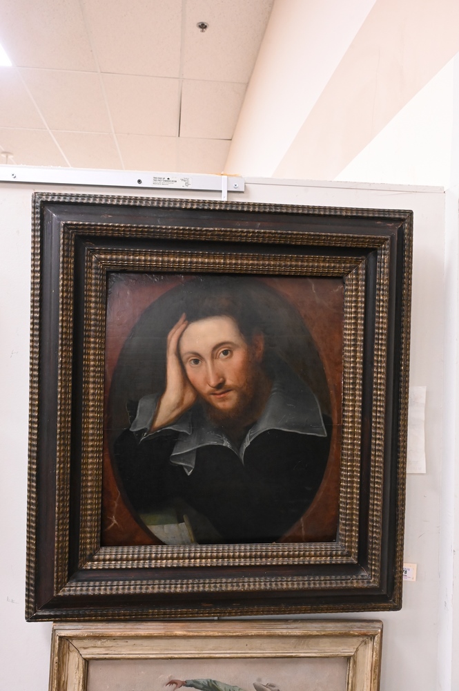 Lot 478: Artist Unknown, English school, 16th/17th century, portrait of a bearded young man, Mark A Van Dijk; W. Shakespeare on back, in a Salvatore Rosa frame, 20 5/8″ x 18 1/8″. Provenance: Sold at House of Heydenryk, 1993. Estate of Wallace Bradway, New Haven, CT.