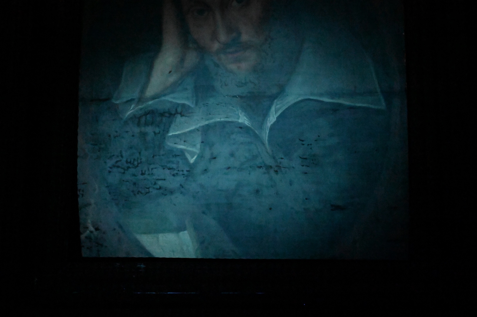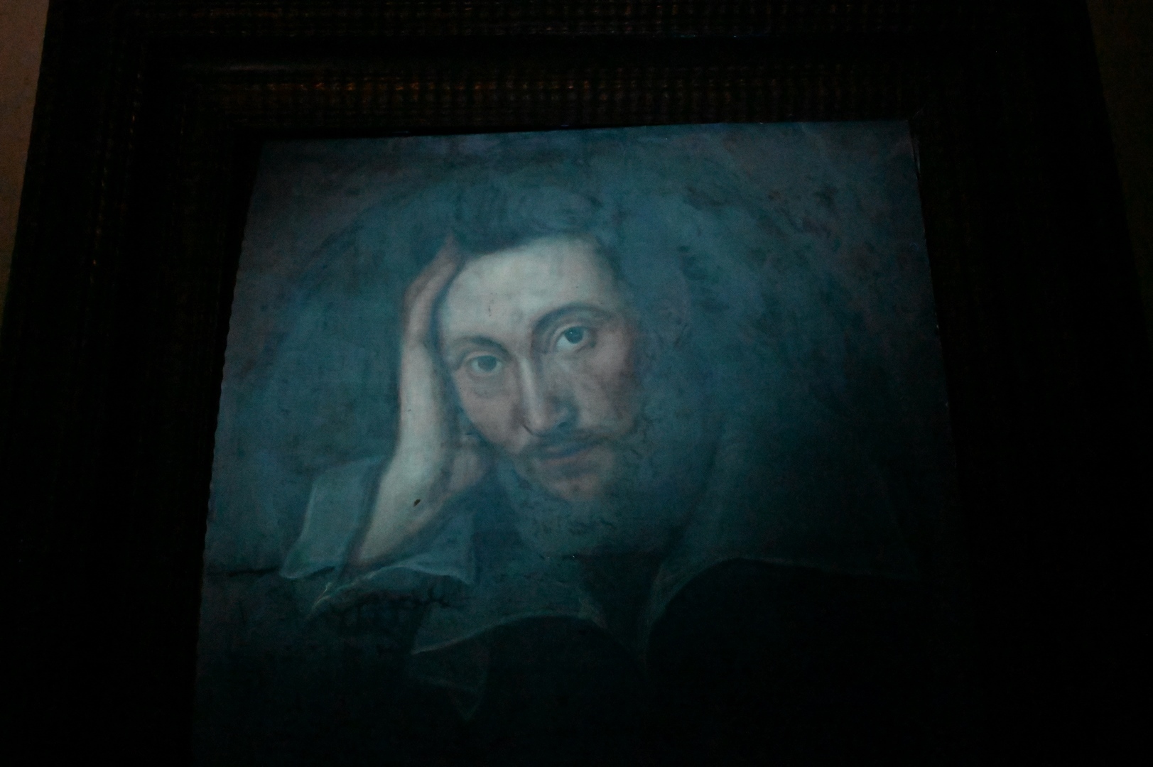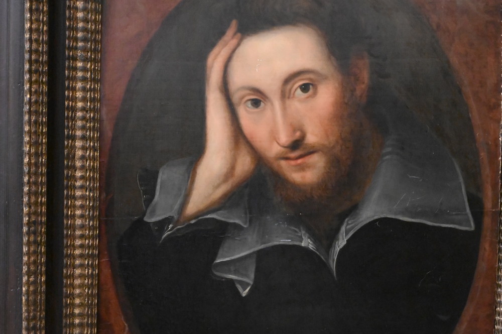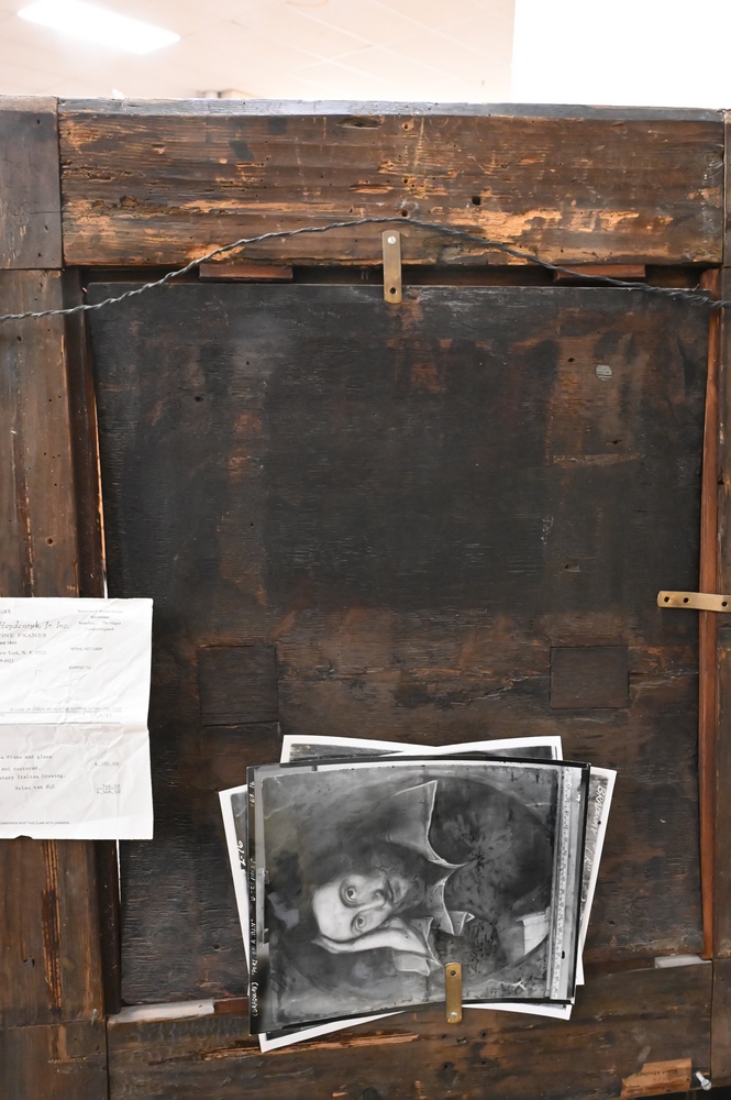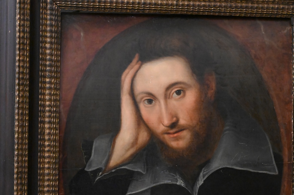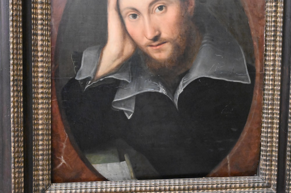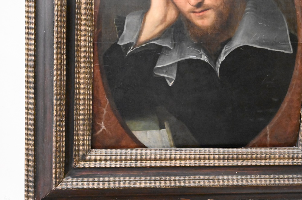 Artist Unknown, English school, 16th/17th century, portrait of a bearded young man, Mark A Van Dijk; W. Shakespeare on back, in a Salvatore Rosa frame, 20 5/8″ x 18 1/8″. Provenance: Sold at House of Heydenryk, 1993. Estate of Wallace Bradway, New Haven, CT.