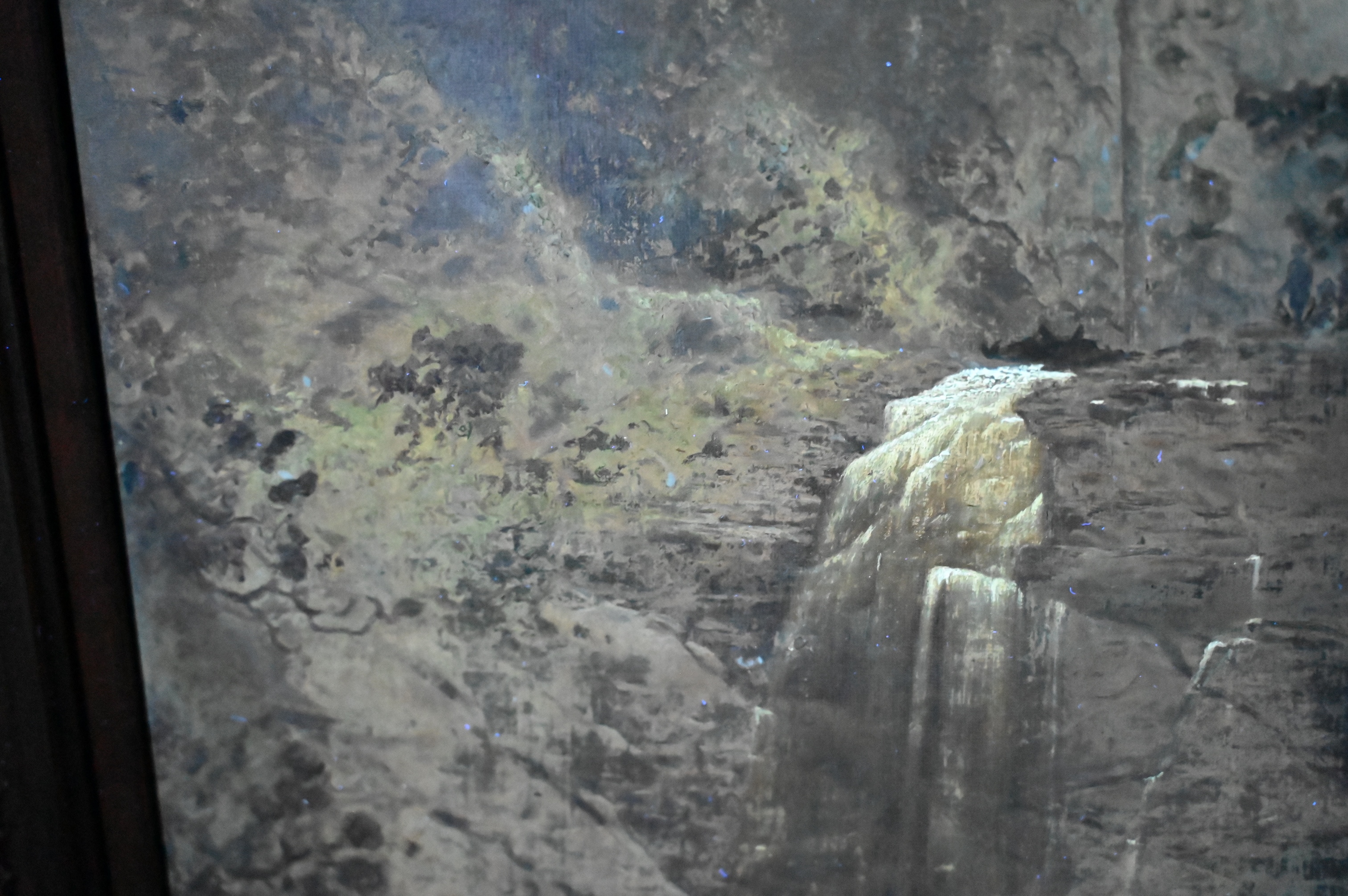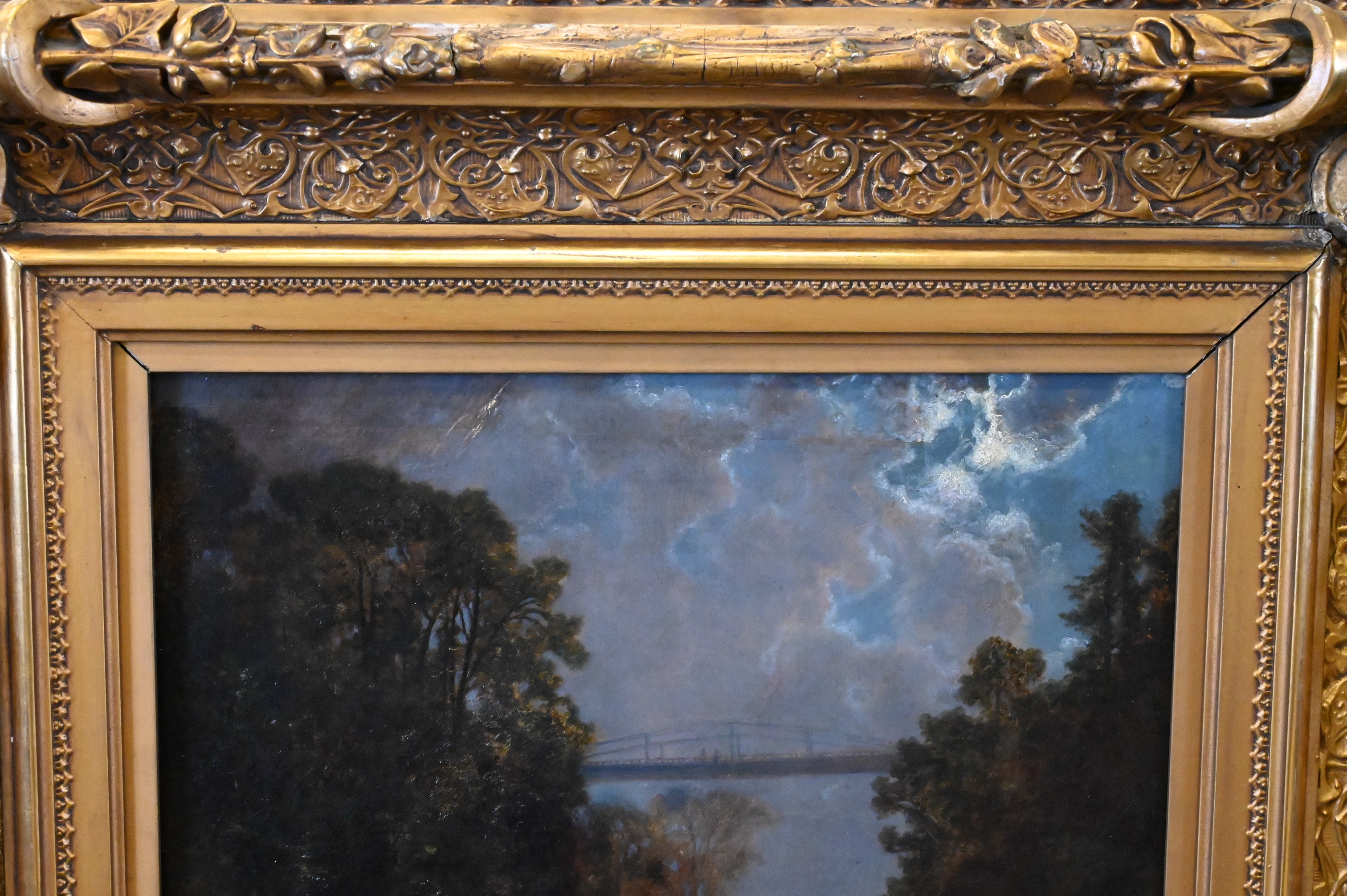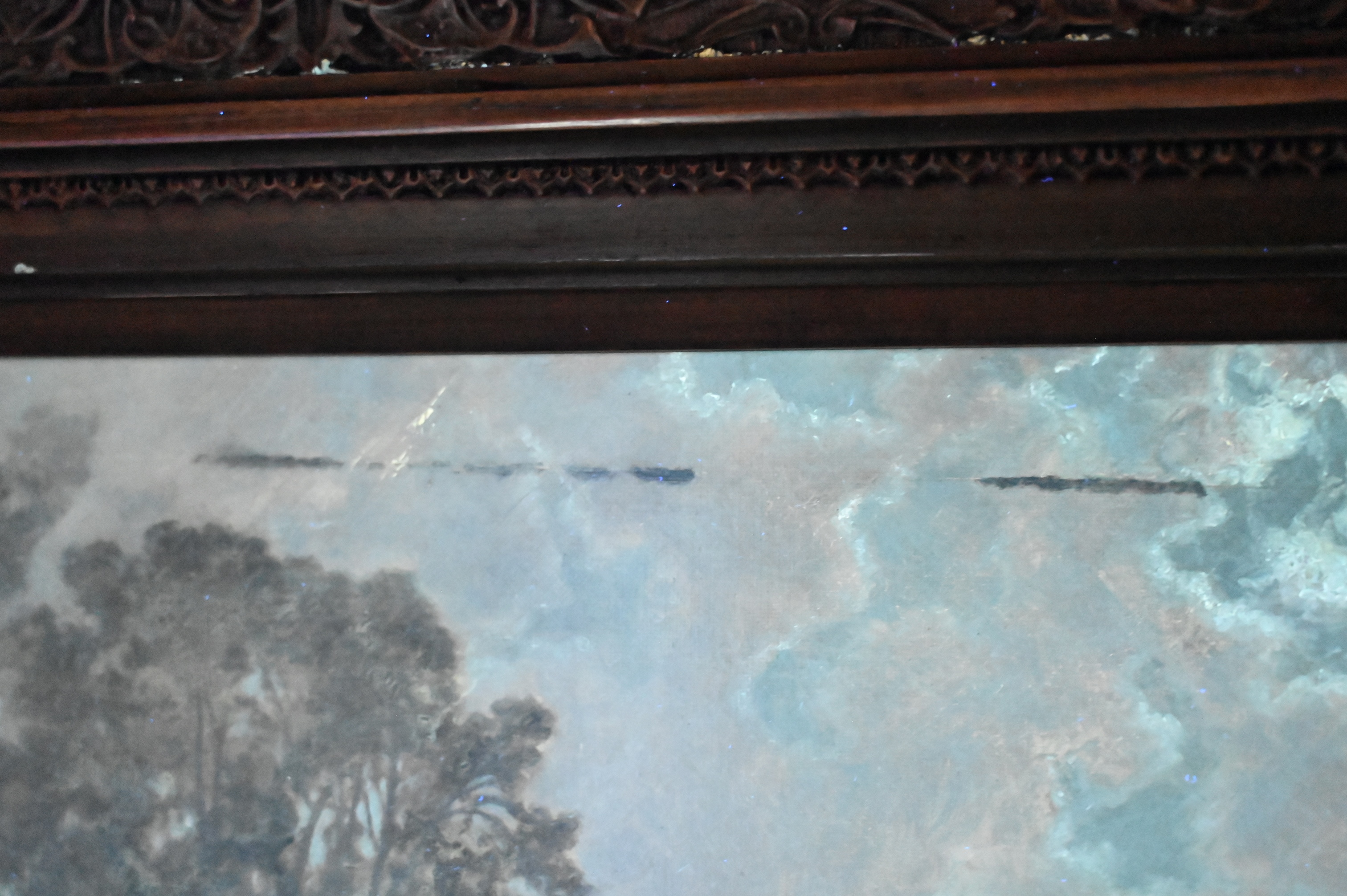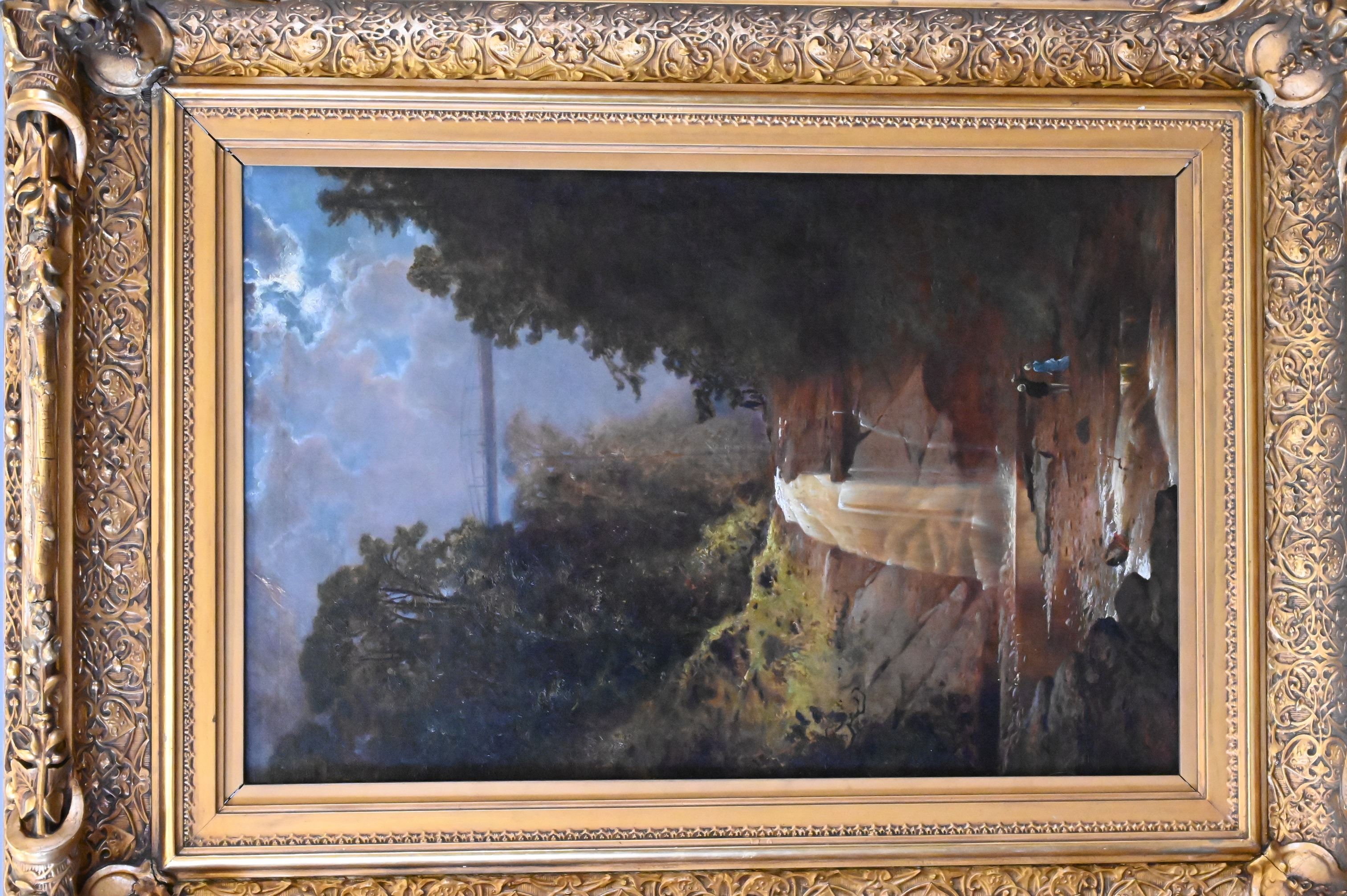 Condition: presents well, relined and restretched canvas, craquelure throughout, heavy varnish, inpainting visible under black light, inpainting concentrating along borders, upper left border, horizontal repair to sky with inpainting, lower right rock area