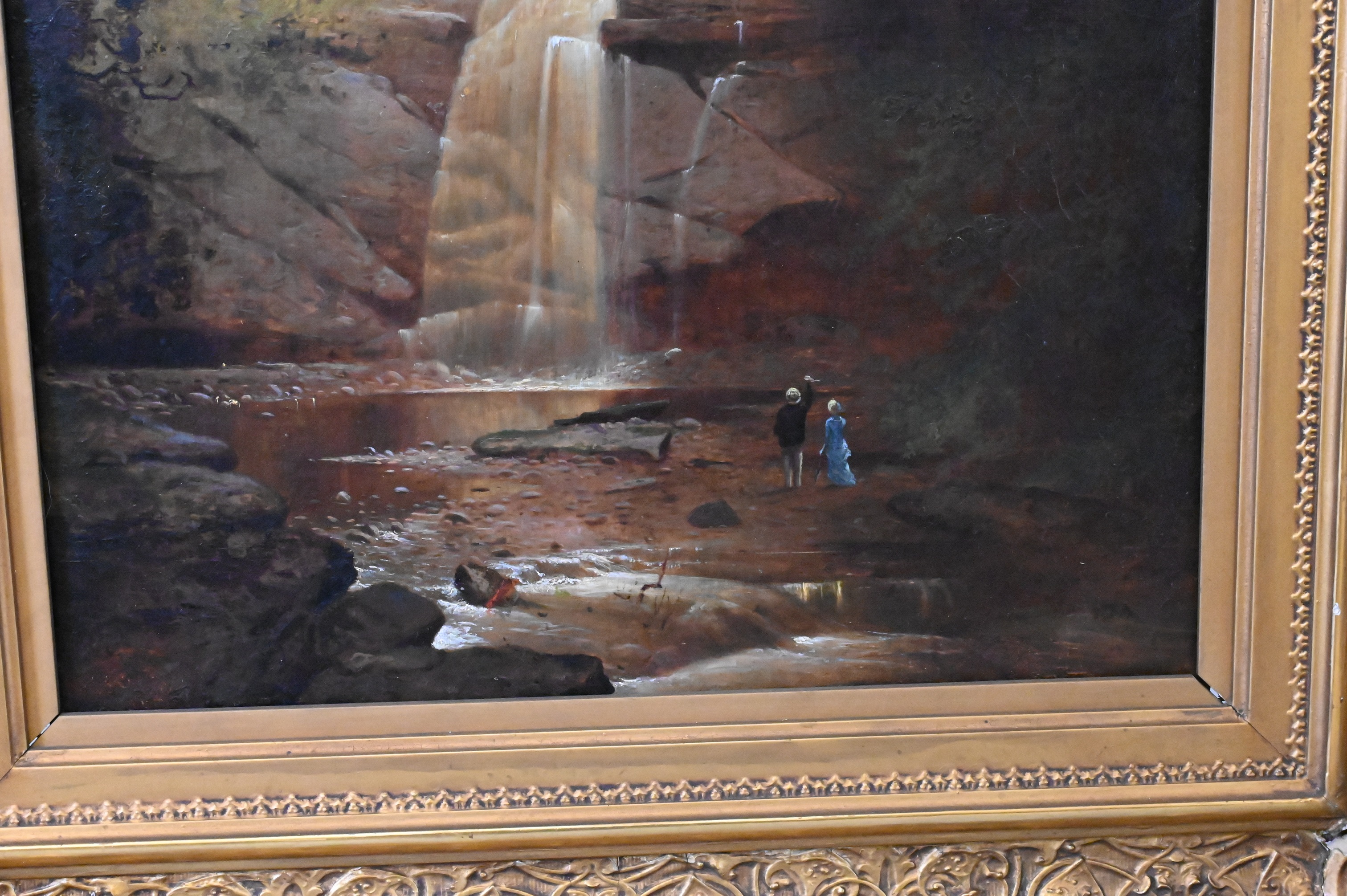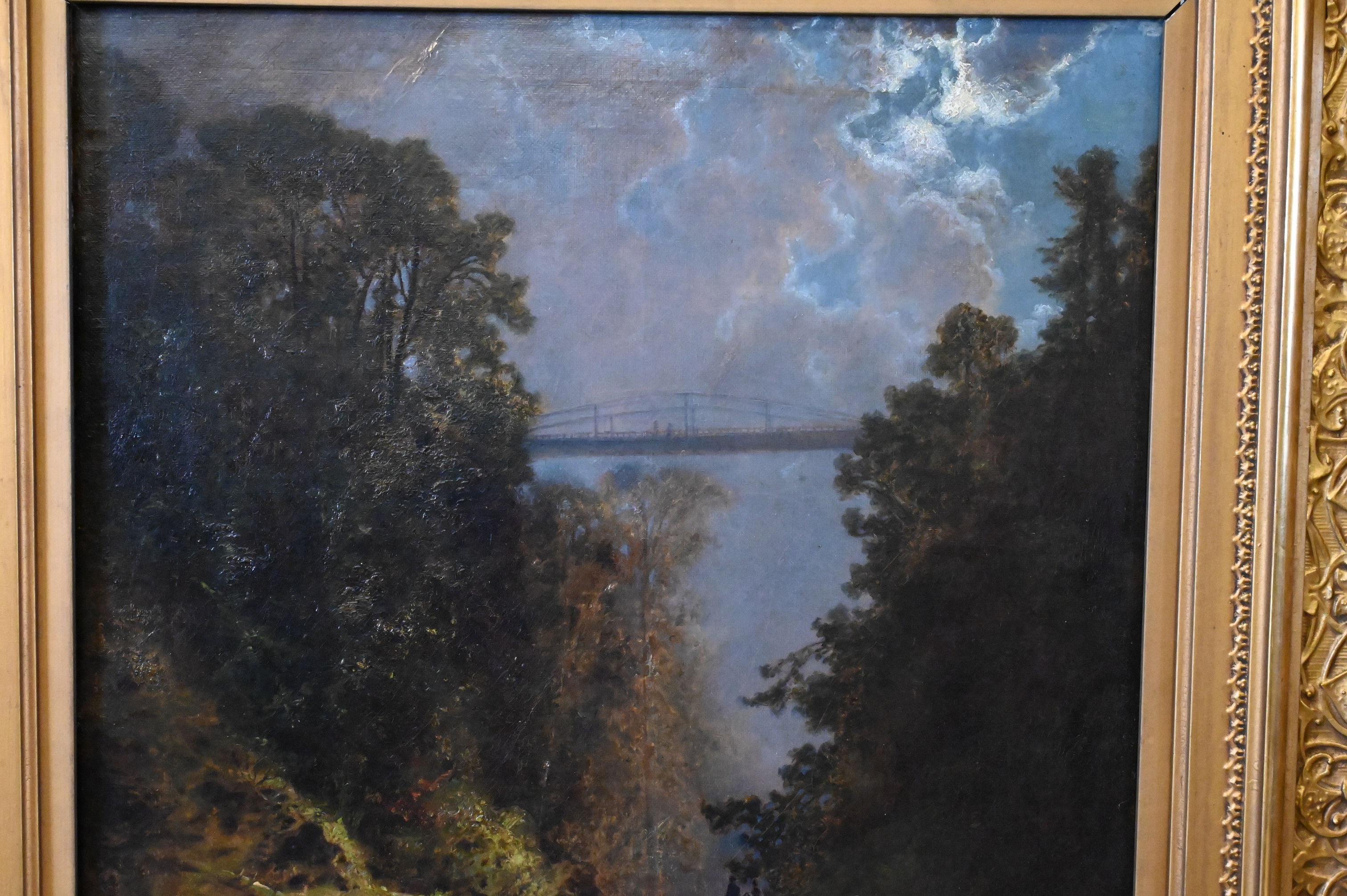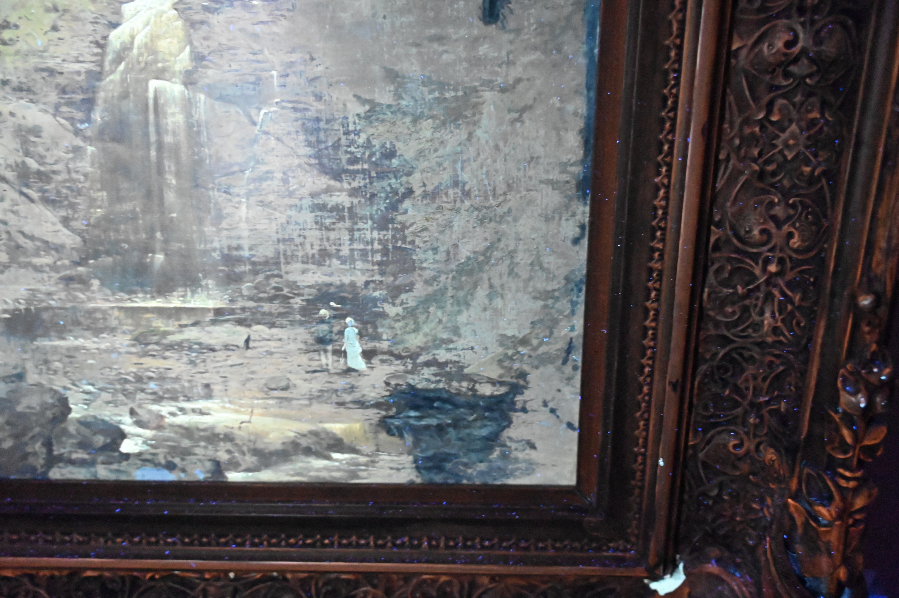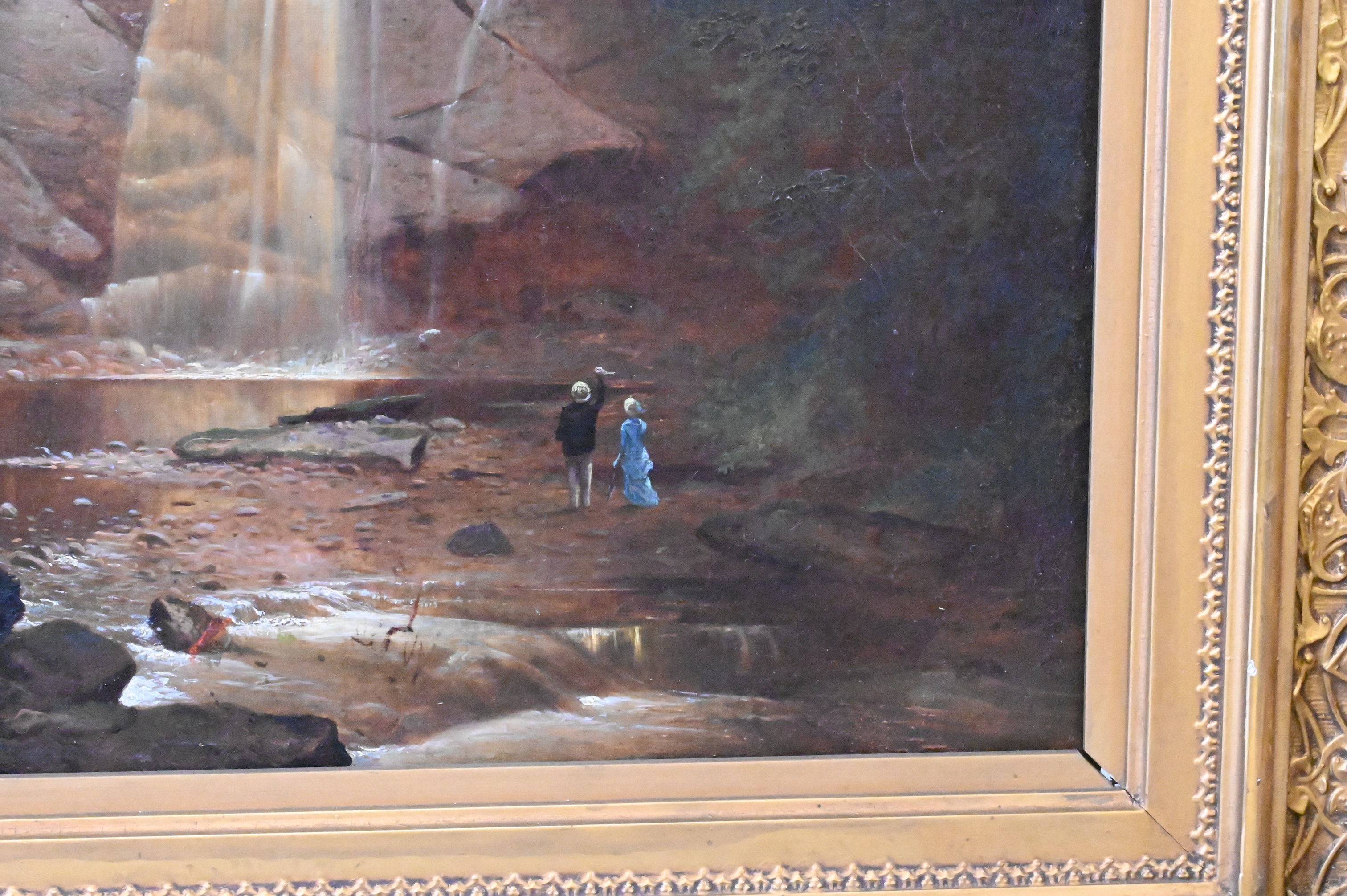 Condition: presents well, relined and restretched canvas, craquelure throughout, heavy varnish, inpainting visible under black light, inpainting concentrating along borders, upper left border, horizontal repair to sky with inpainting, lower right rock area