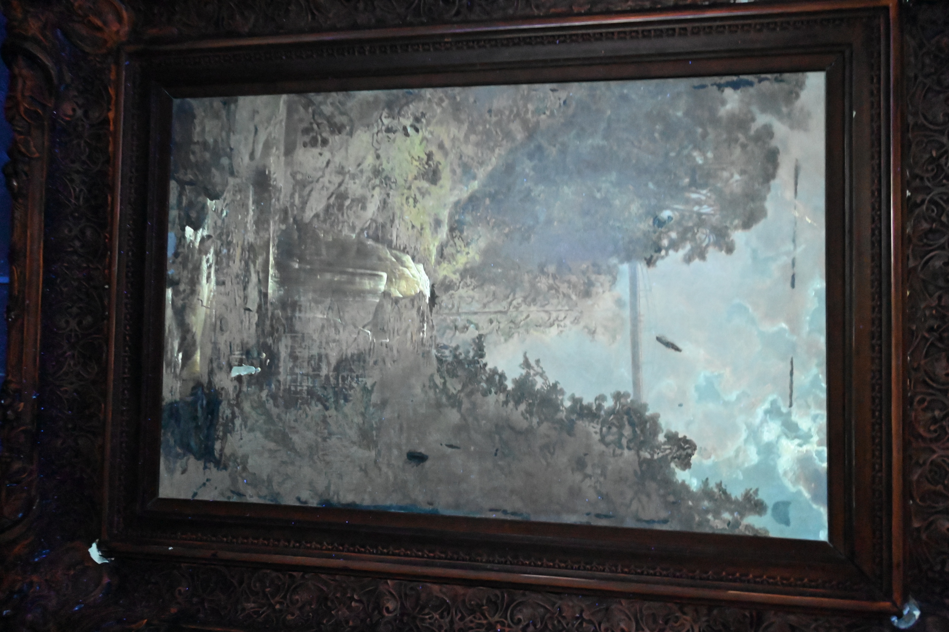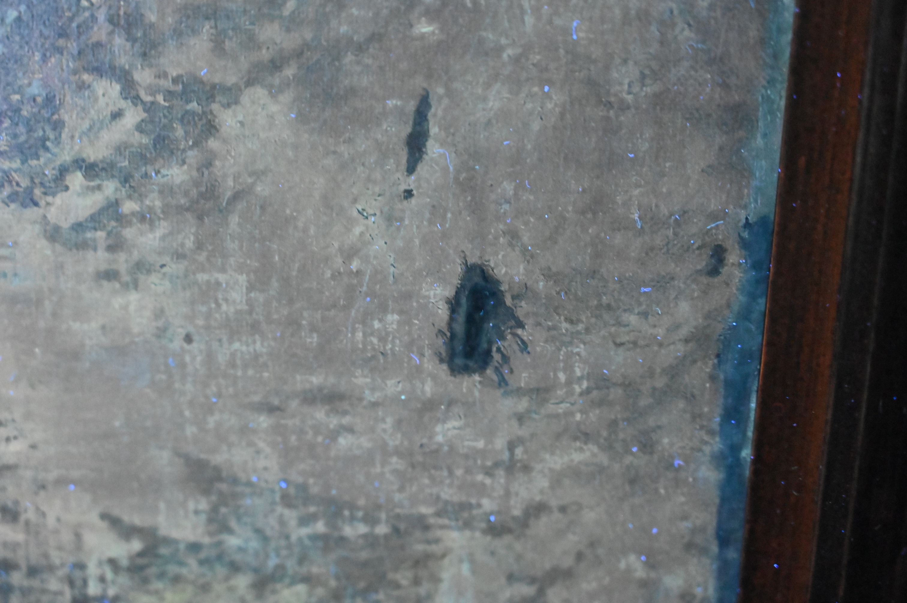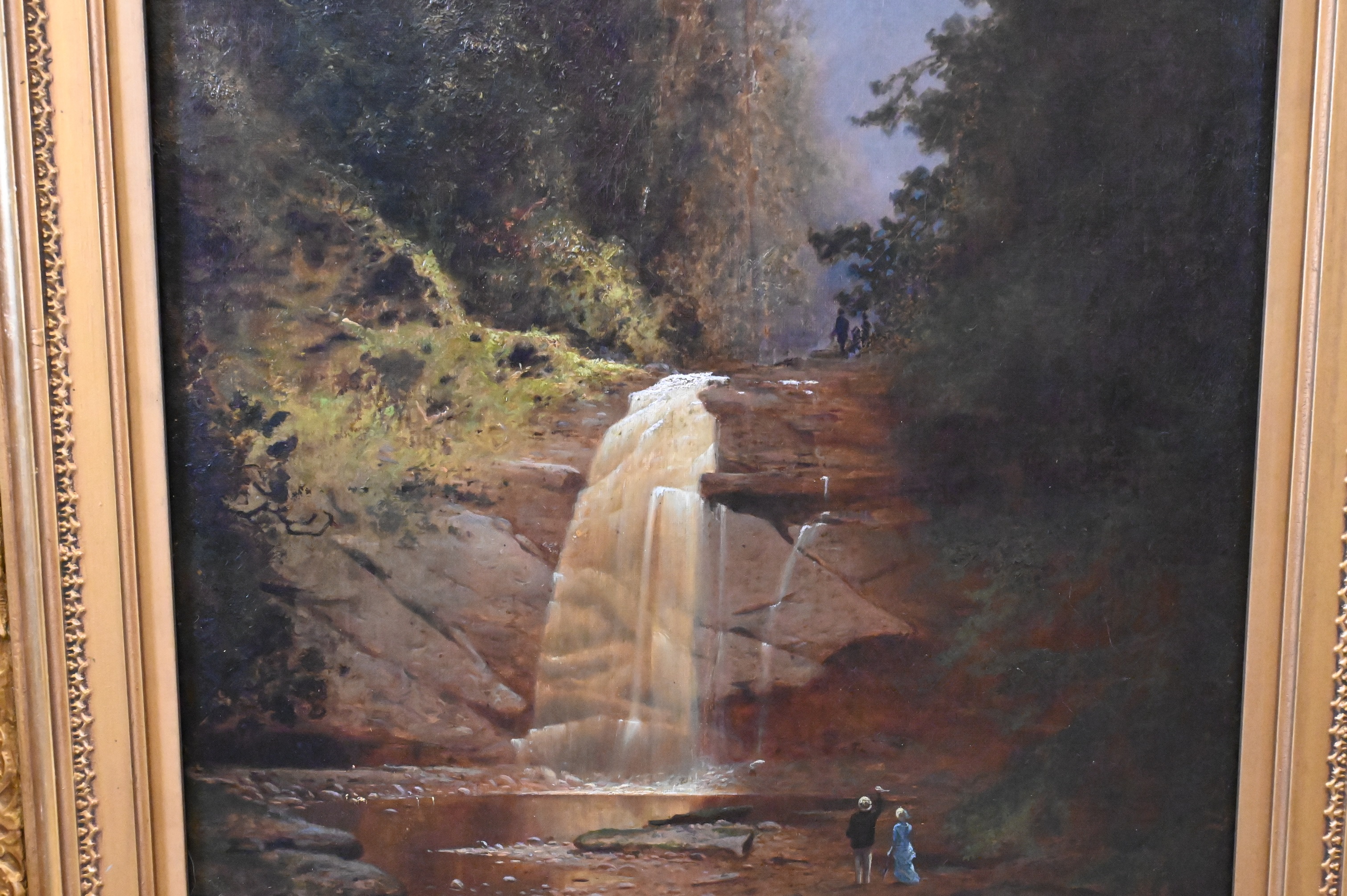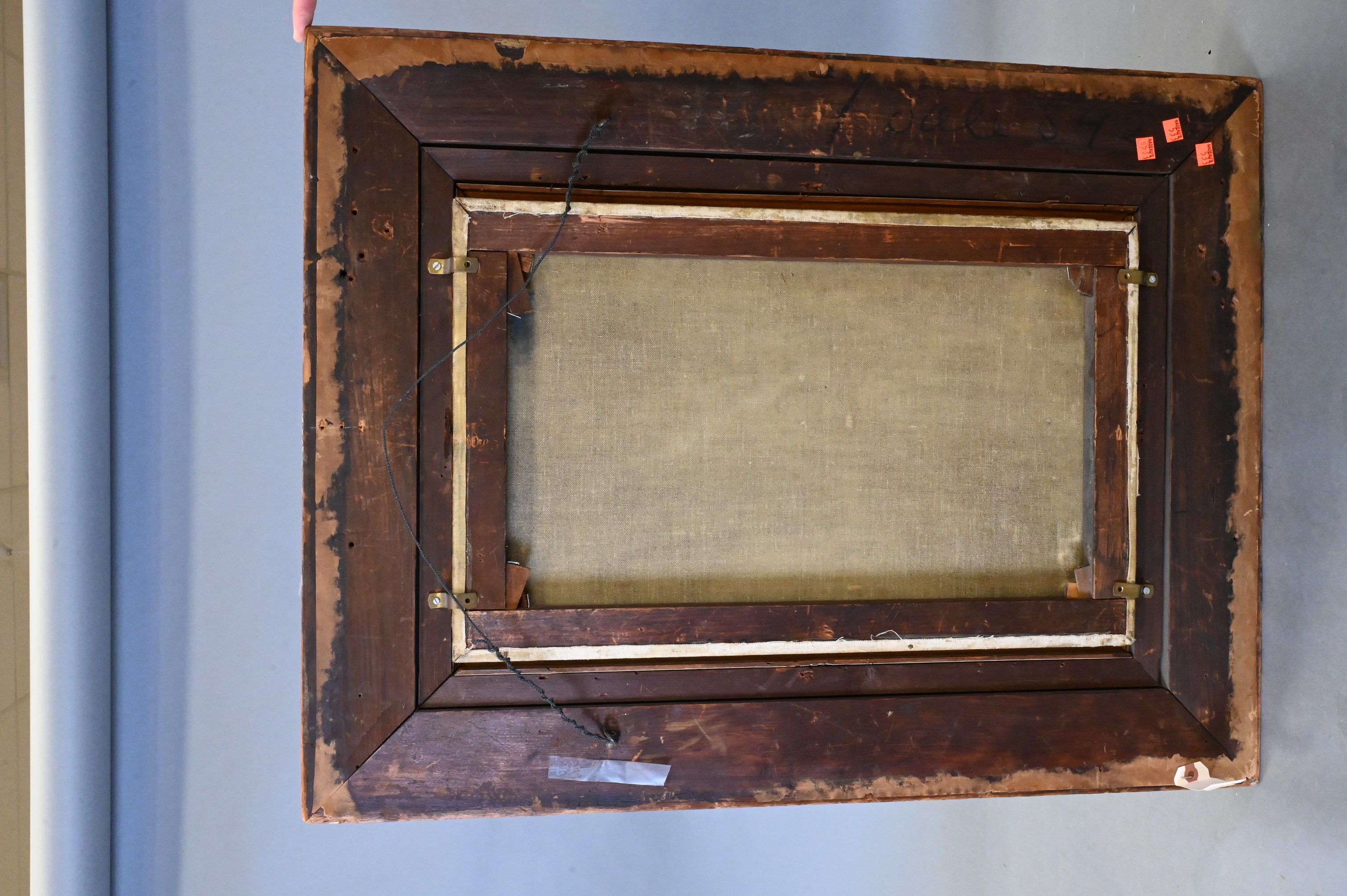 Condition: presents well, relined and restretched canvas, craquelure throughout, heavy varnish, inpainting visible under black light, inpainting concentrating along borders, upper left border, horizontal repair to sky with inpainting, lower right rock area