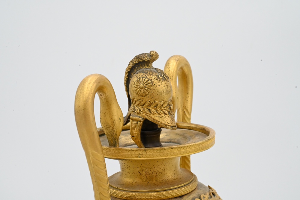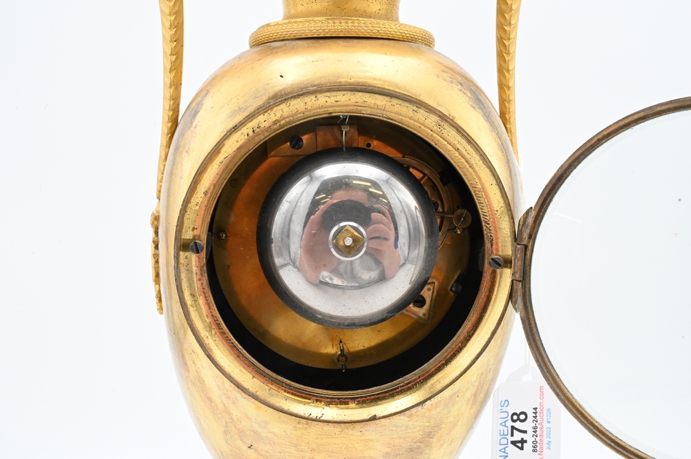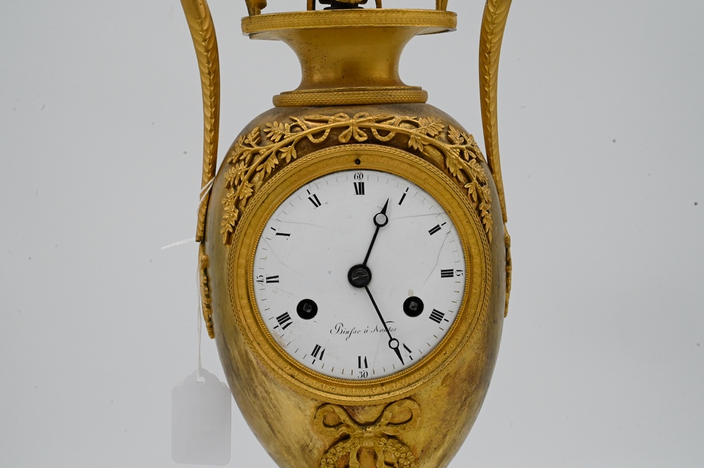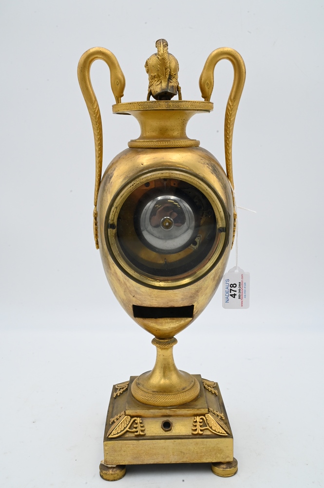 French Bronze Urn Mantle Clock, urn form with swan neck handles enameled, dial marked “Nantes”, height 16 inches.