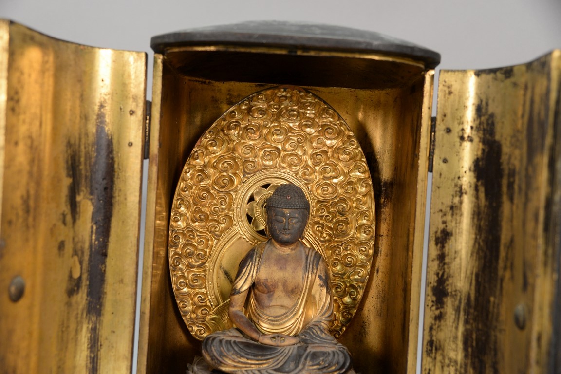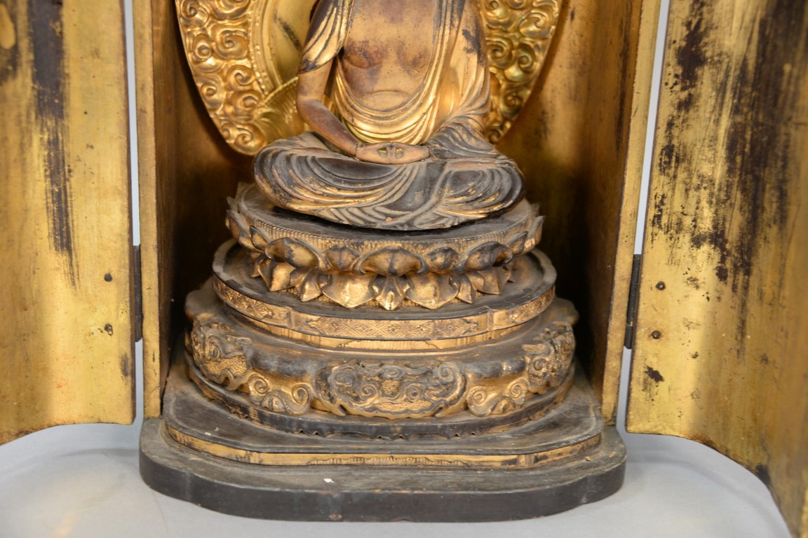 Lot 478: Japanese shrine with two doors and seated deity inside, seated on lotus base. ht. 15 1/4in., wd. 9in.