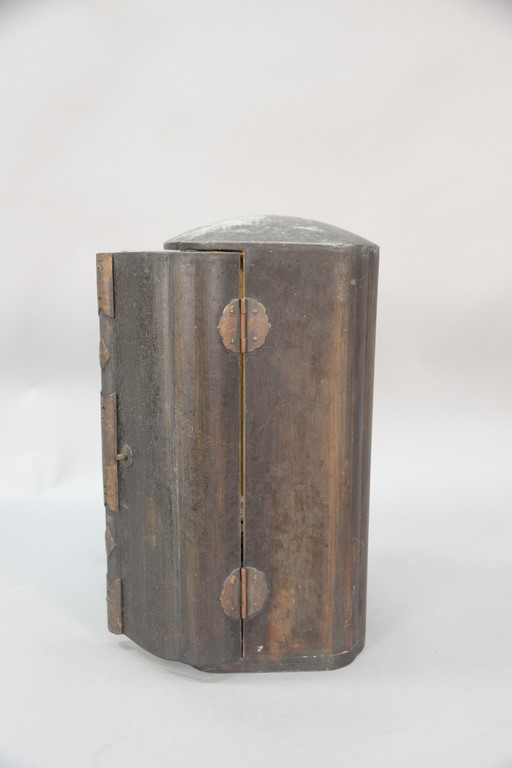 Japanese shrine with two doors and seated deity inside, seated on lotus base. ht. 15 1/4in., wd. 9in.