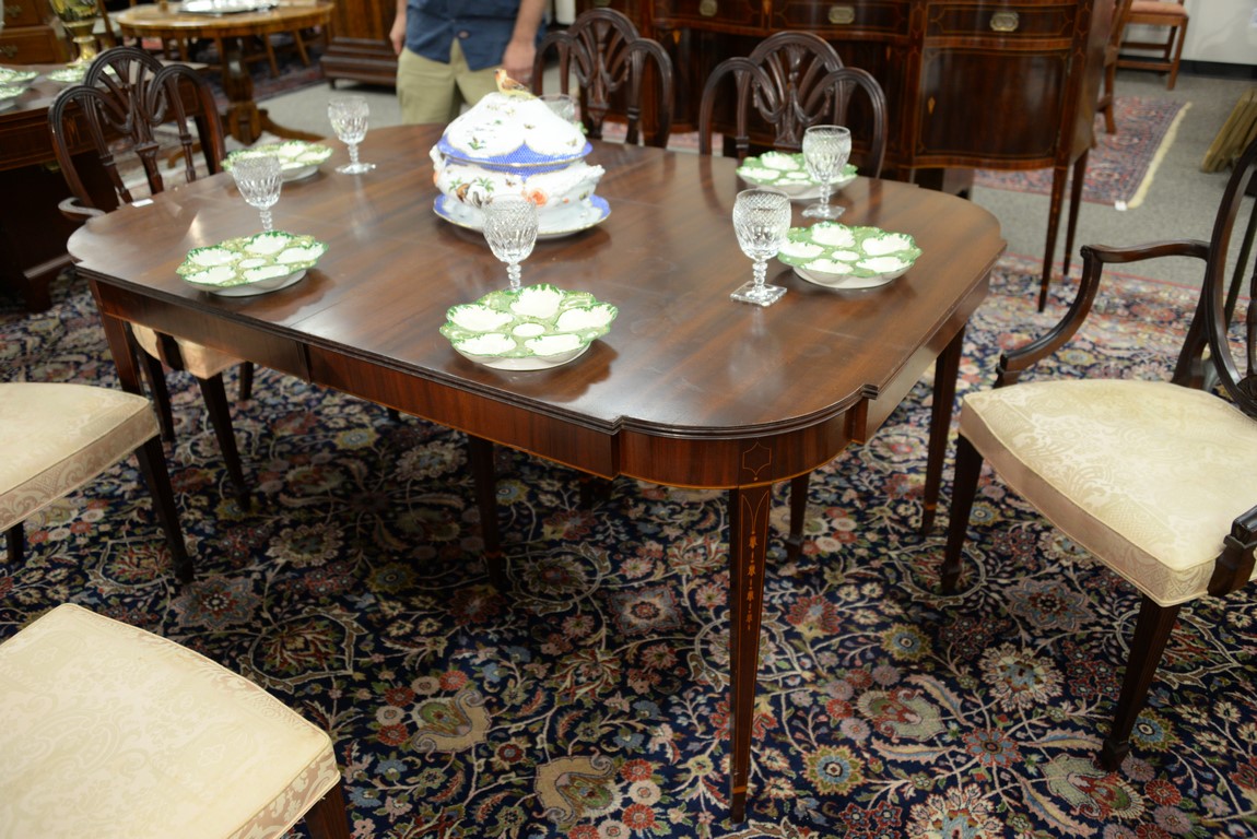 Margolis mahogany Federal style table with D shape ends on square tapered legs with line and bellflower inlays have three leaves. lg. 66in. wd. 45in. ht. 30in. two leaves 24in. each, total length 114in.