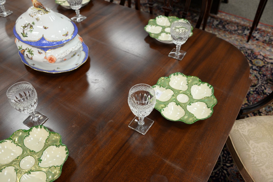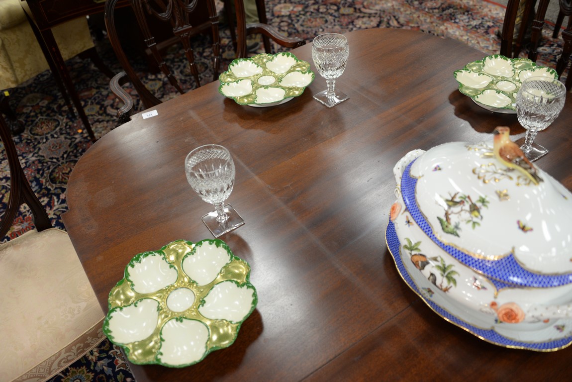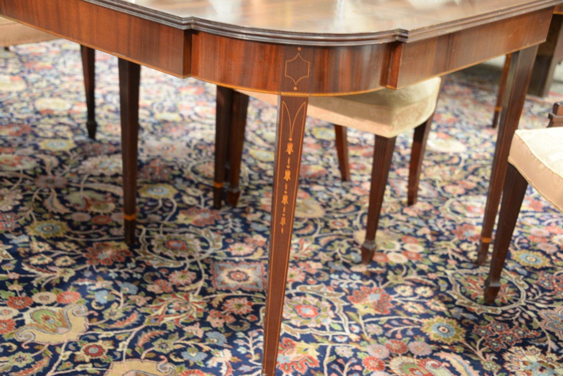Lot 478: Margolis mahogany Federal style table with D shape ends on square tapered legs with line and bellflower inlays have three leaves