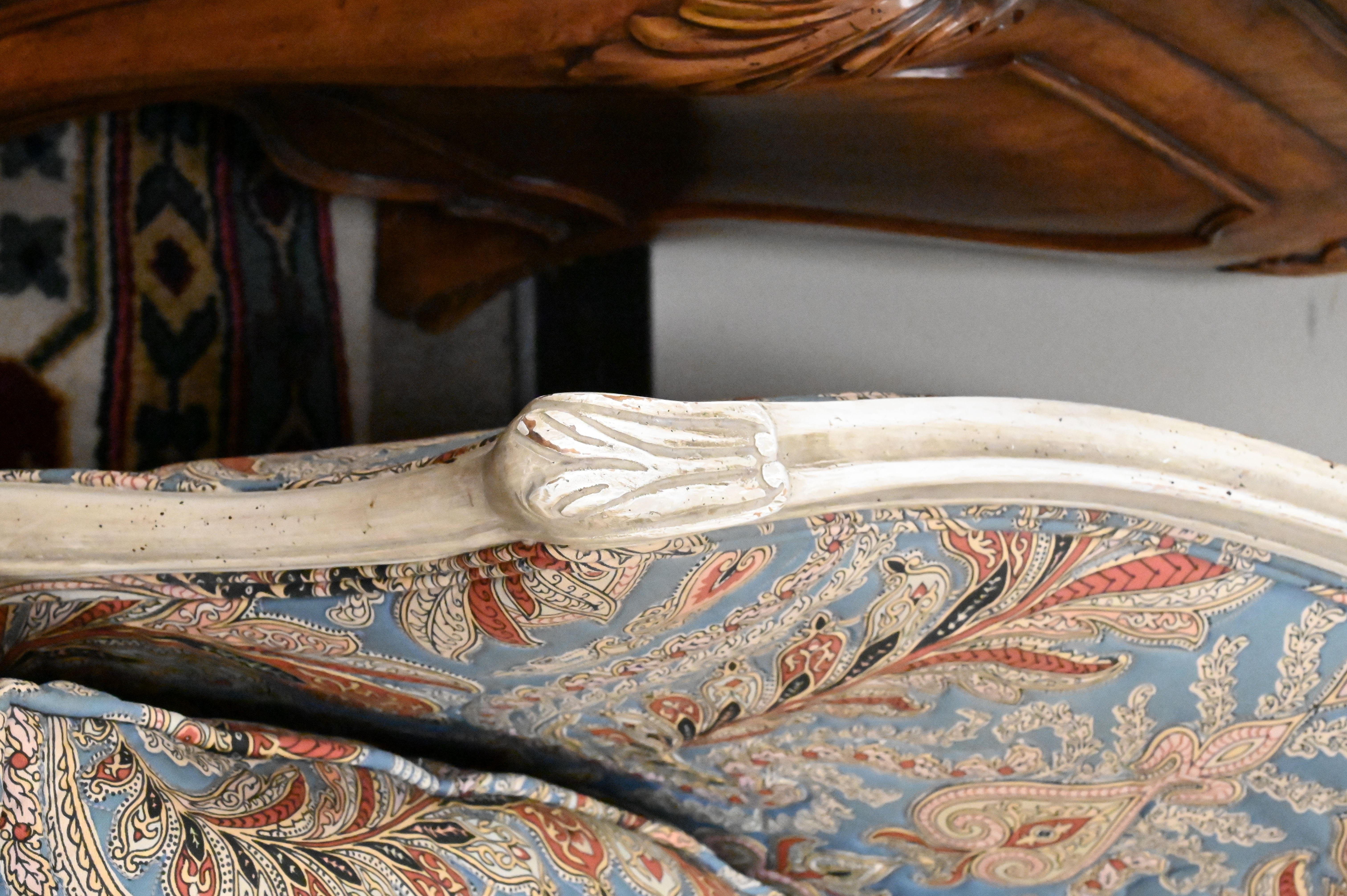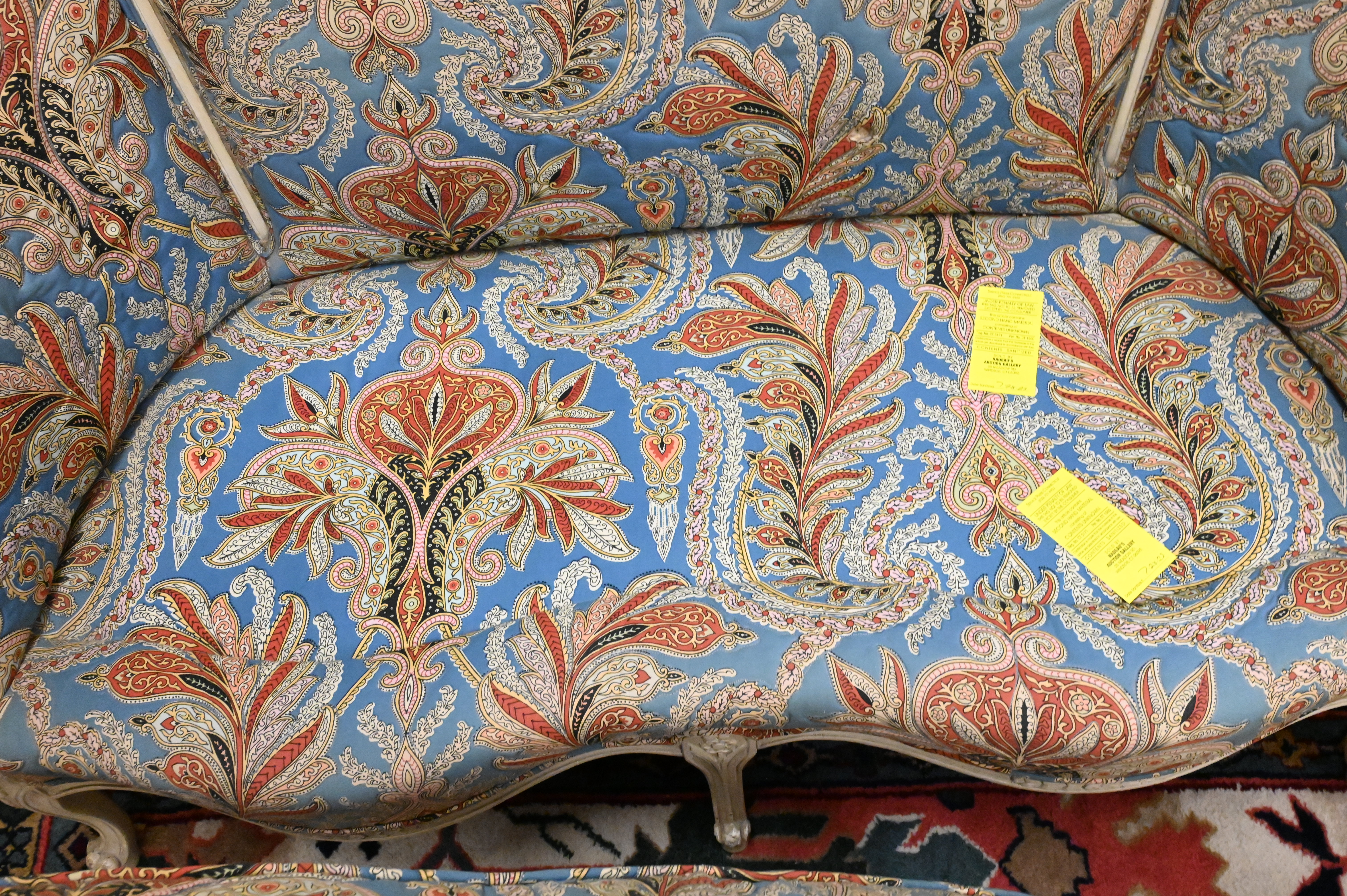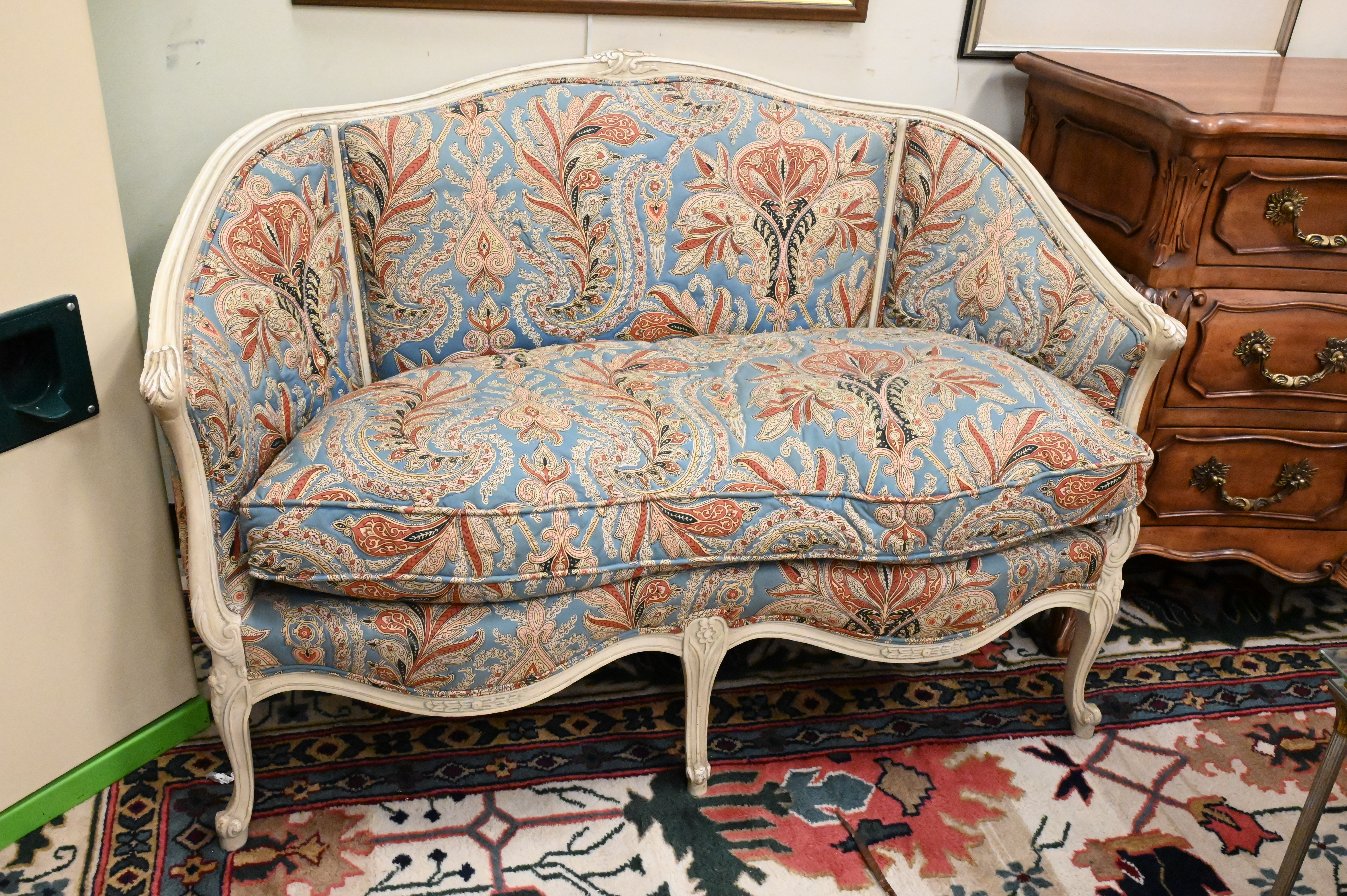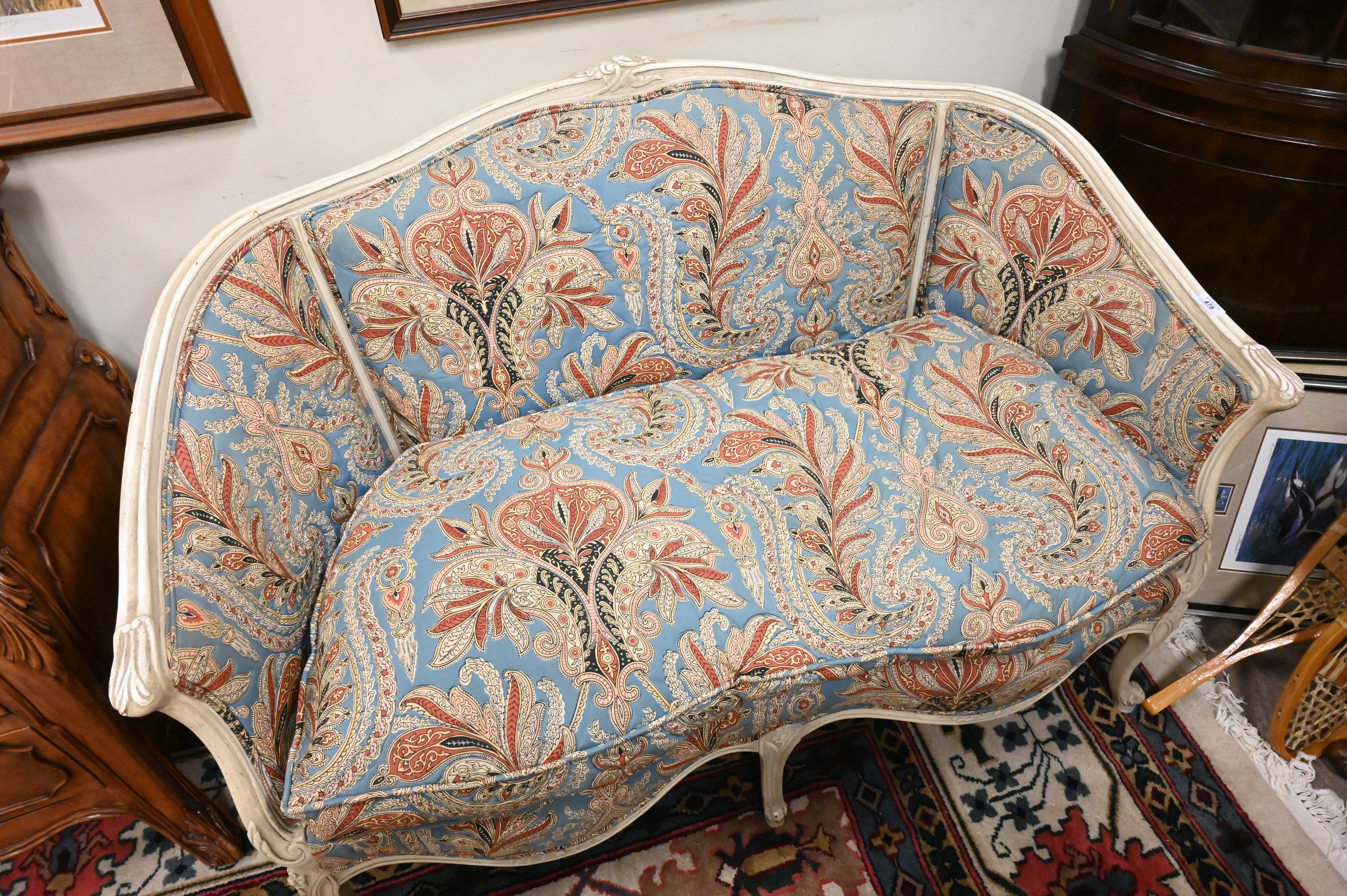 Pair of Louis XV Style Upholstered Loveseats, height 34 inches, length 50 1/2 inches.