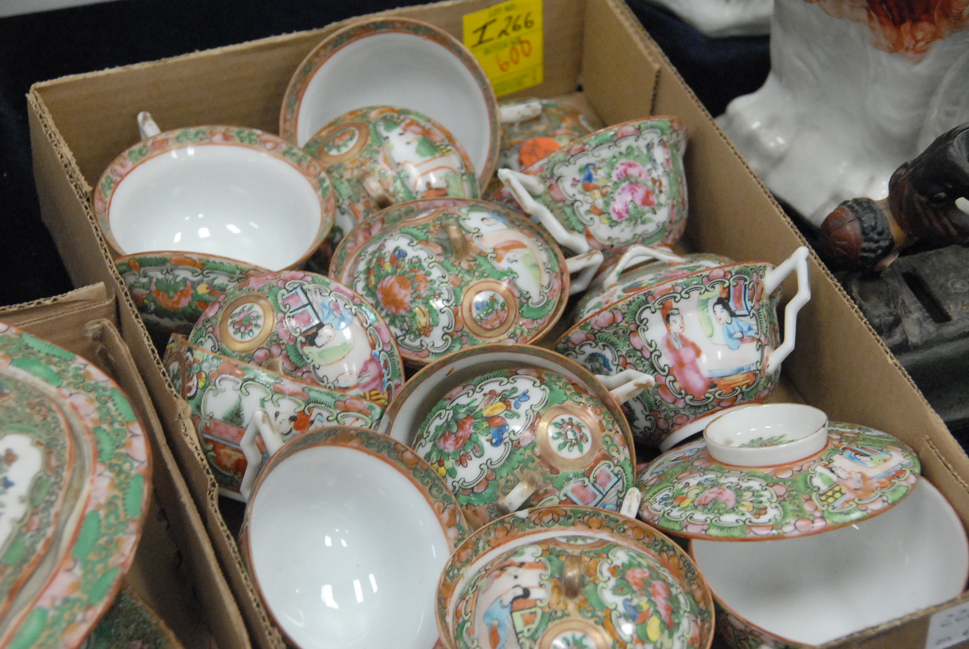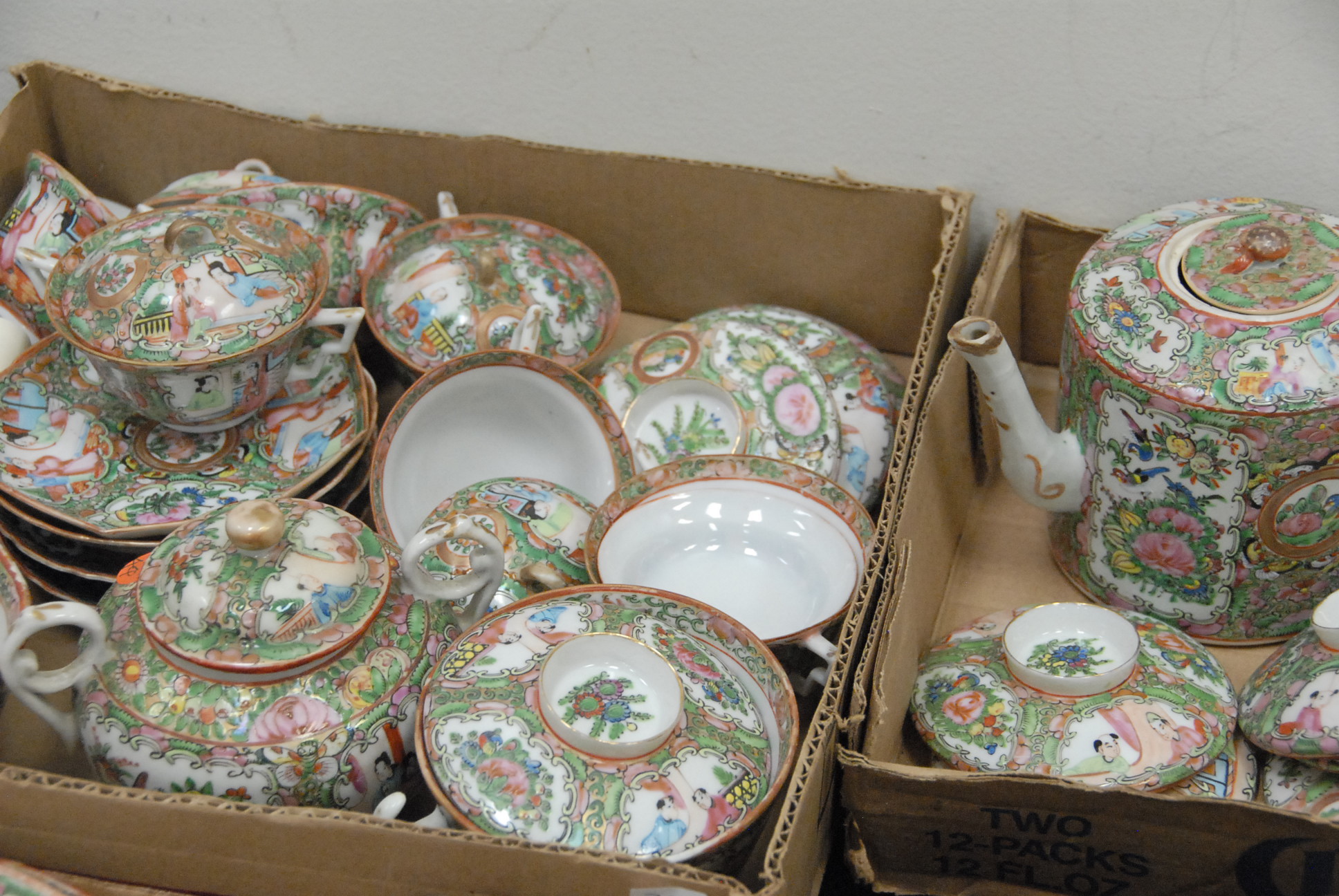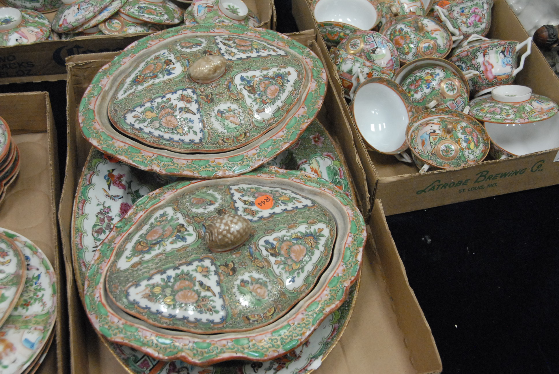 Partial setting of famille rose including two covered vegetable dishes, platter, teapot, sauce dish, various plates, cups, saucers 90 total pieces, covers not original.