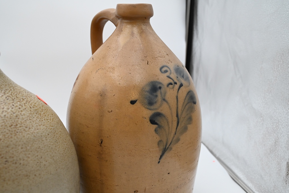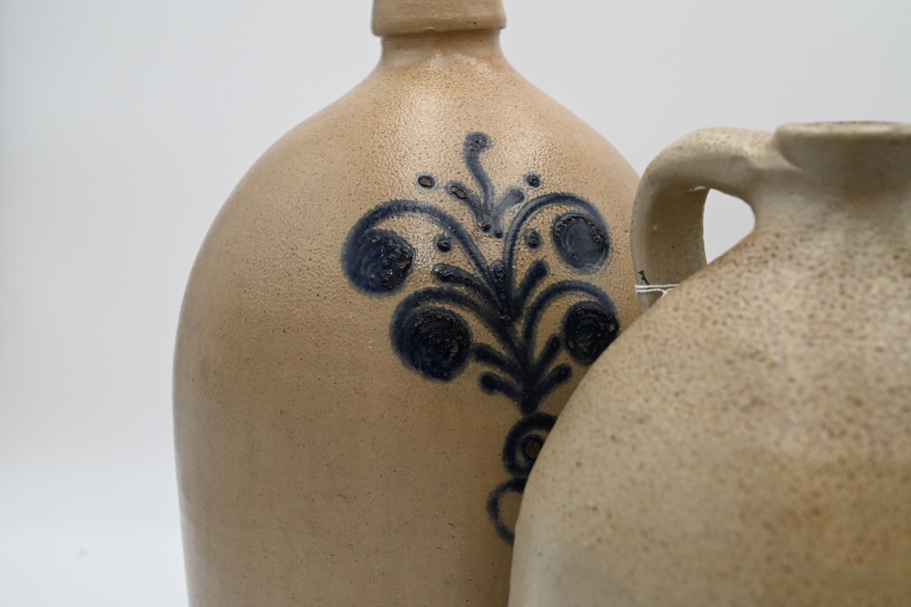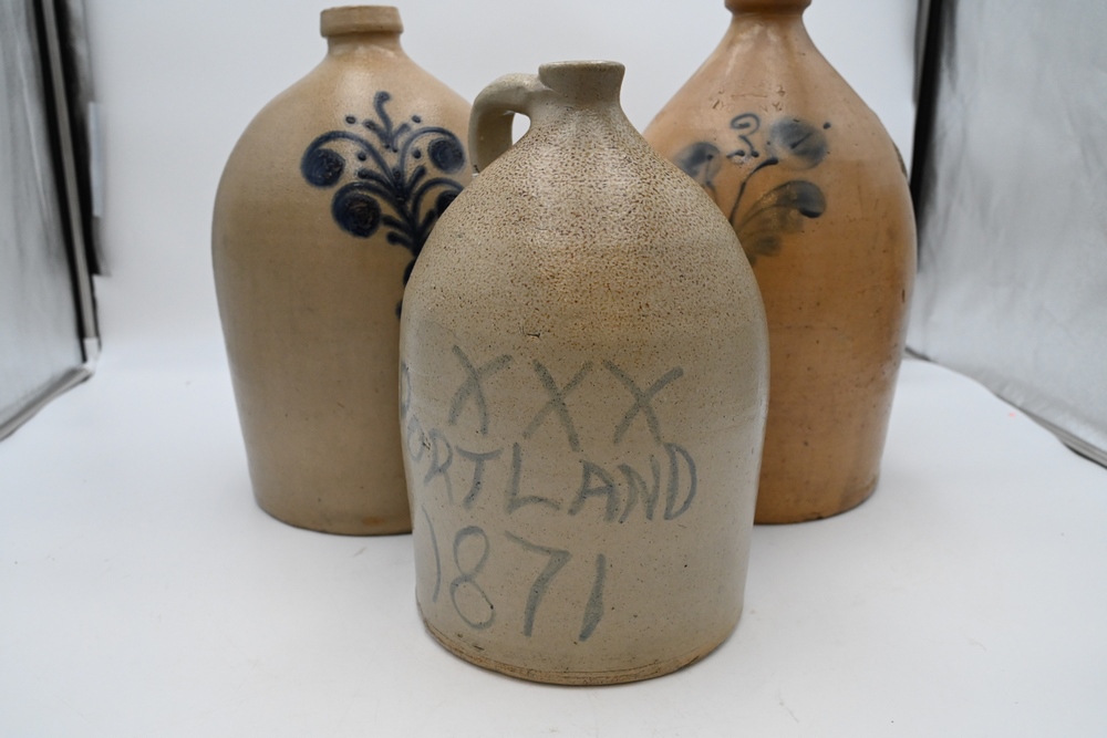Lot 478: Three Stoneware Jugs one marked Portland, 1871, XXX two having blue decoration designs tallest height 16 1/2 inches Provenance: Estate of Bruce Sasalla, East Hartford, Connecticut.