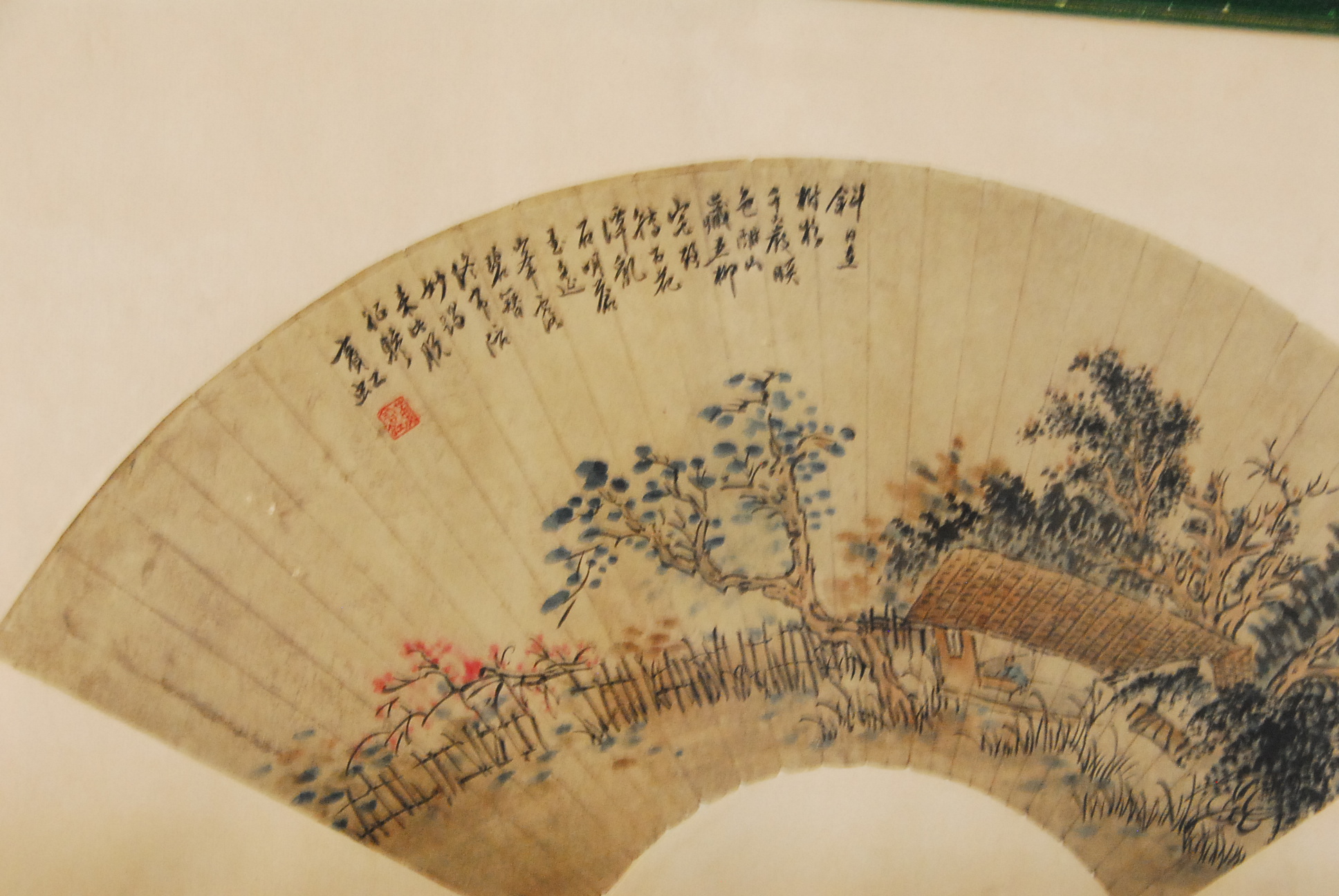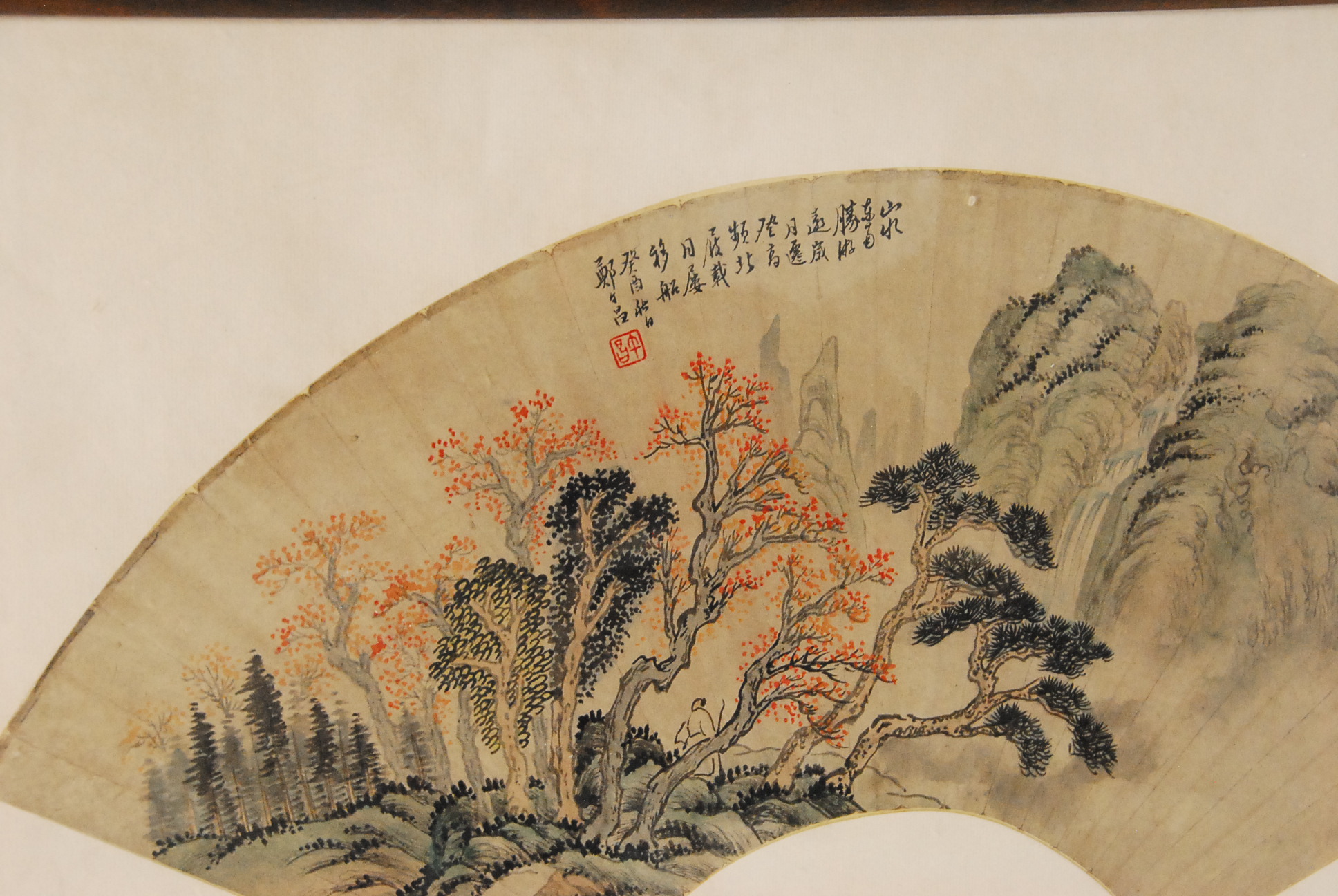 Two framed oriental fans with painted landscape scene, lg. 20.