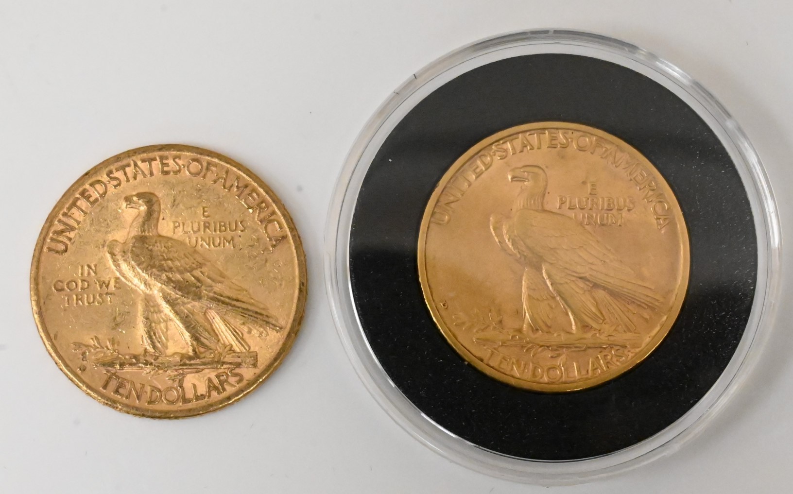 Two Ten Dollar Gold Indian Coins, to include a 1908-D ten dollar gold Indian XF, along with 1910-S ten dollar Indian XF/AU