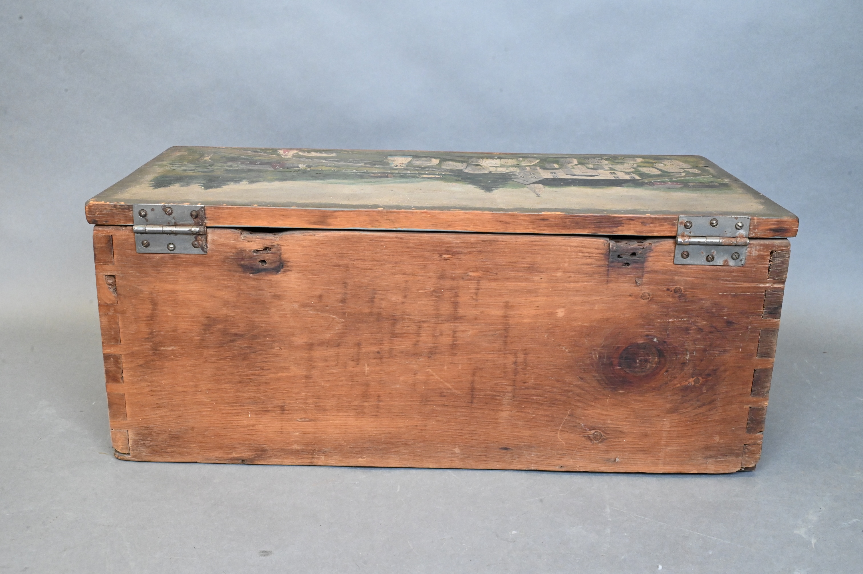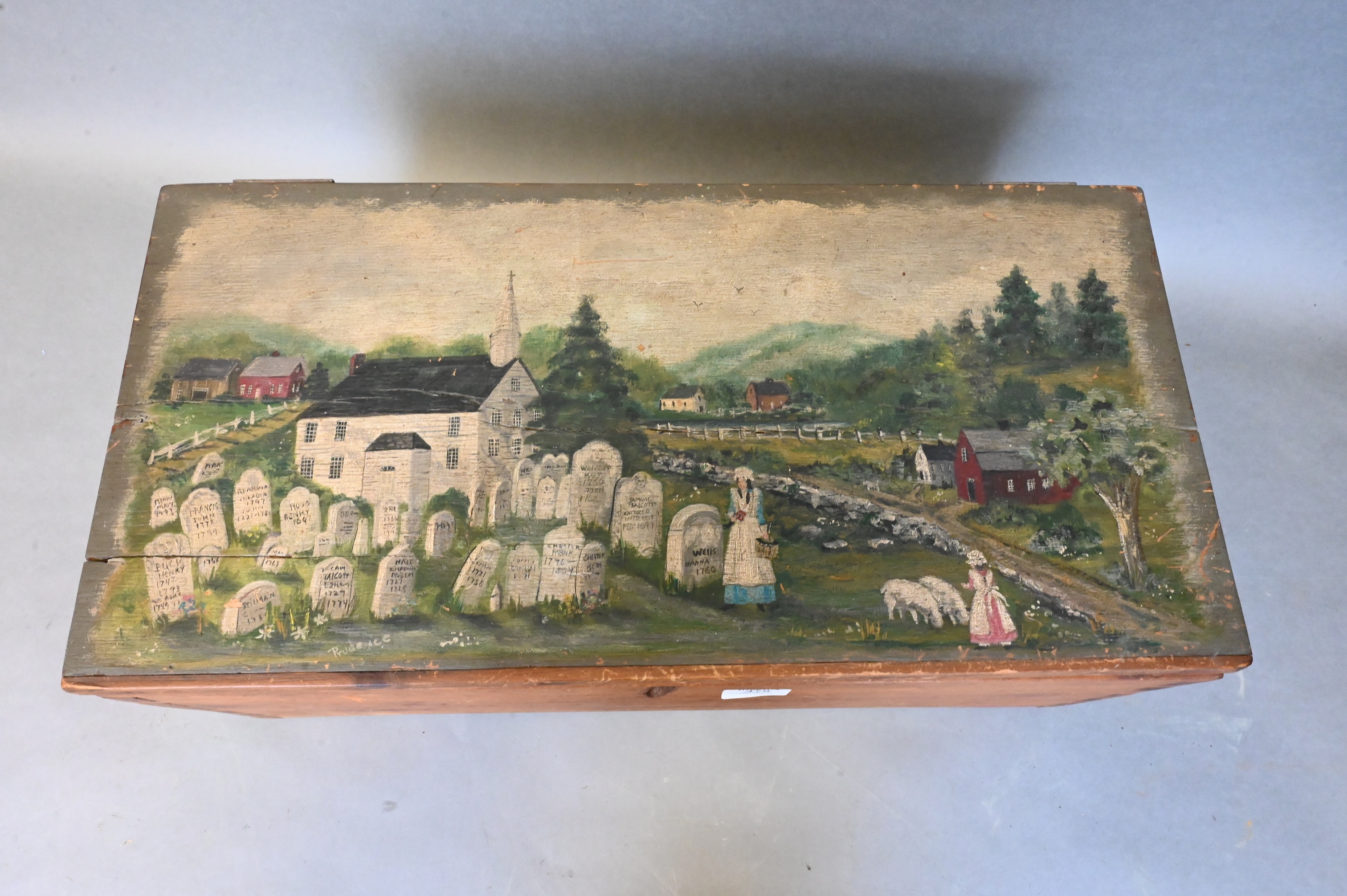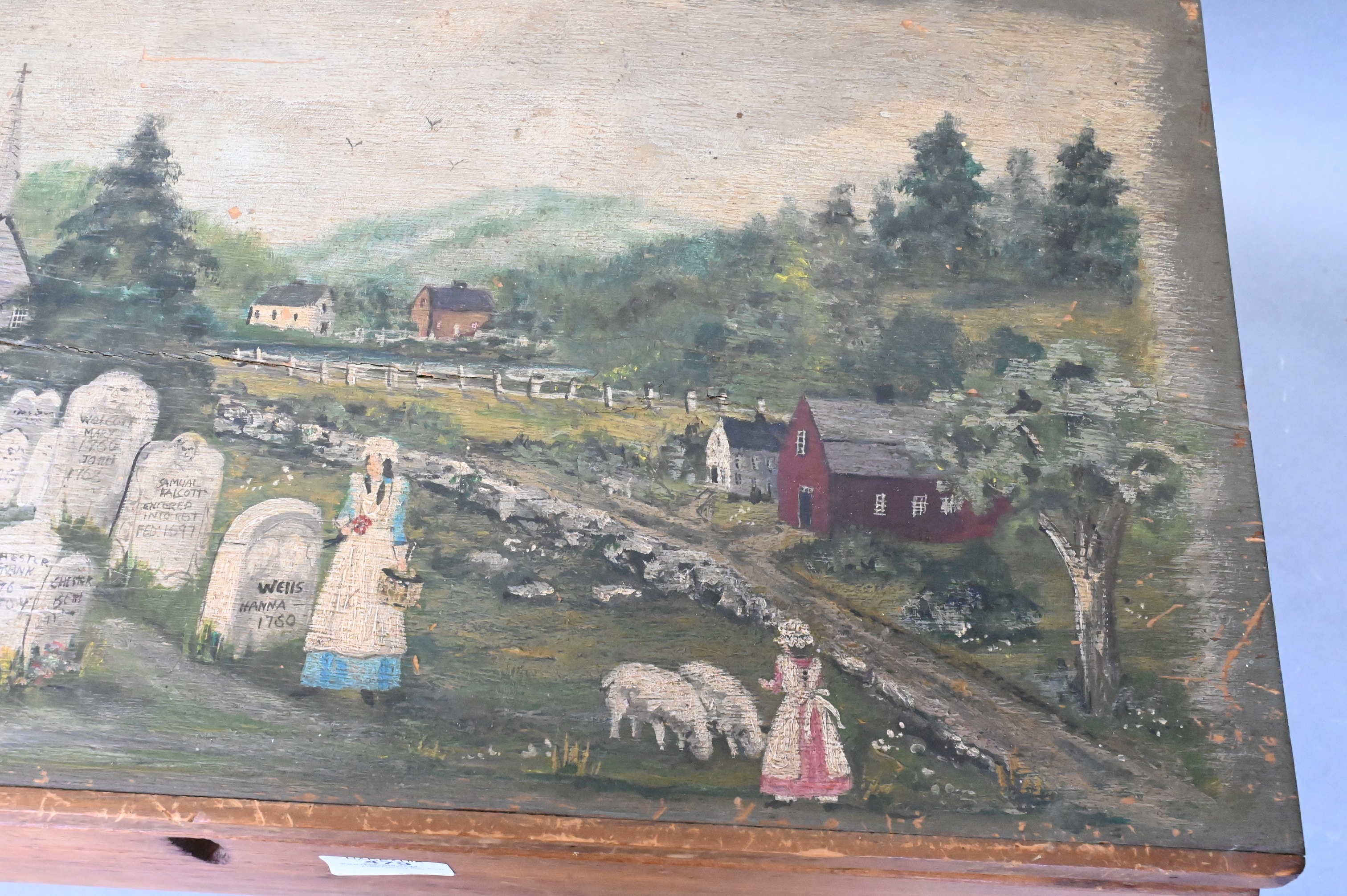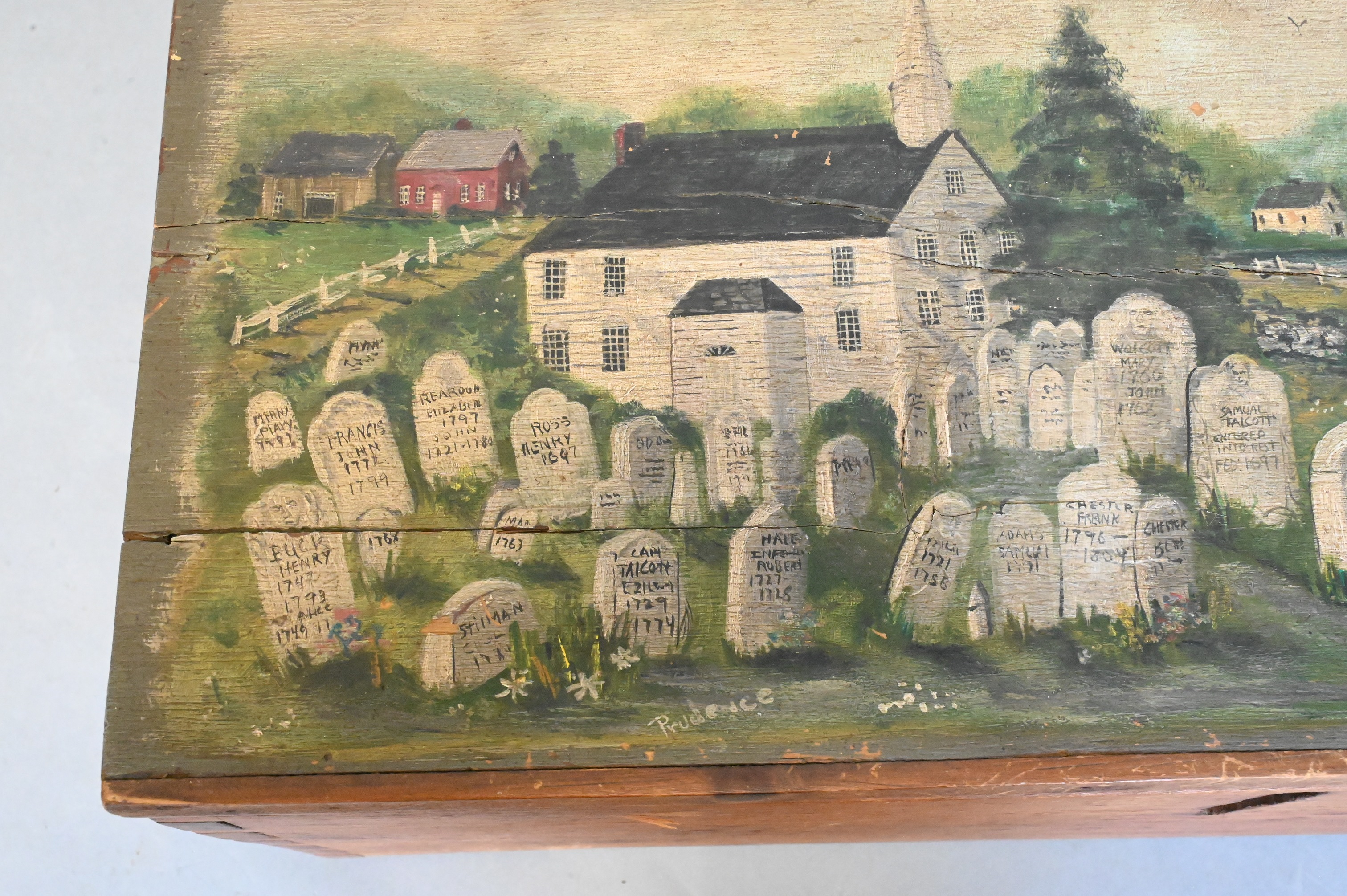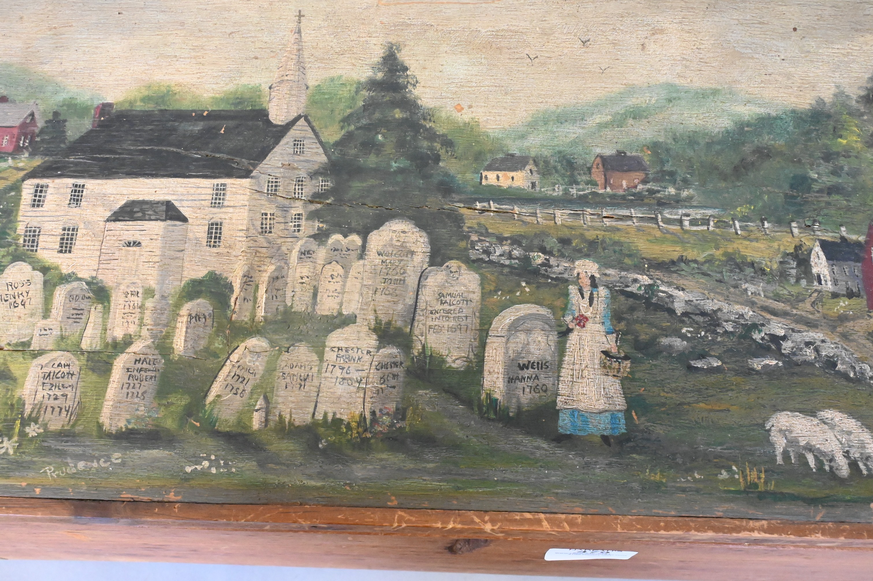 featuring a primitive landscape of a white church and graveyard with two girls bringing flowers to a tombstone, signed lower left Prudence, 19th century