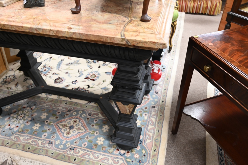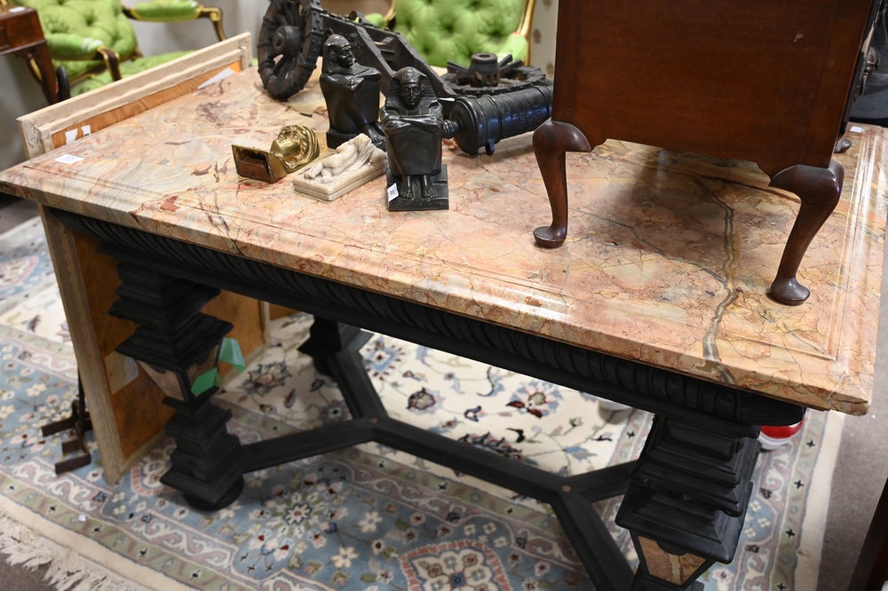 Baroque Style Table, having molded inset marble top on heavy base with inlaid marble panels, face carved ends, height 31 inches, top 32″ x 49″.