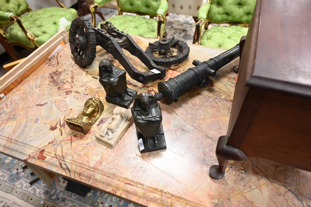 Lot 479: Baroque Style Table, having molded inset marble top on heavy base with inlaid marble panels, face carved ends, height 31 inches, top 32″ x 49″.