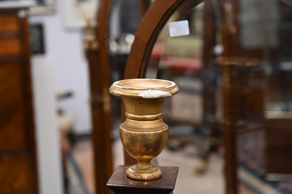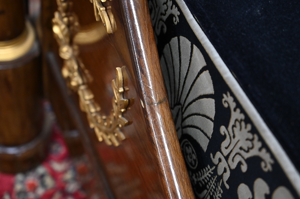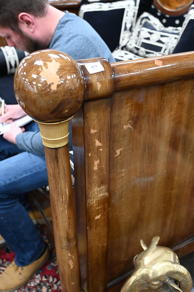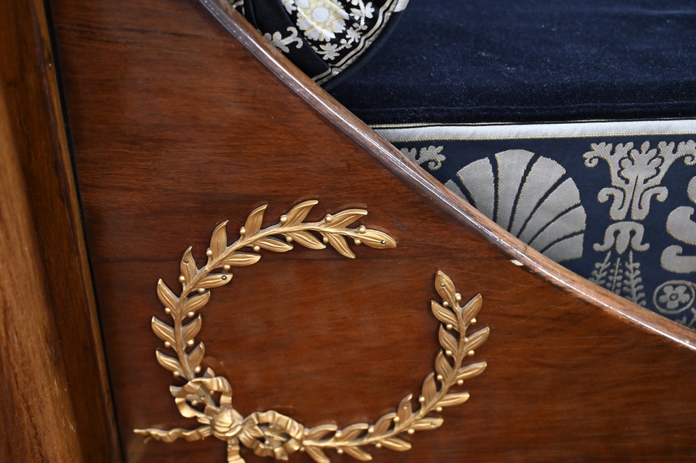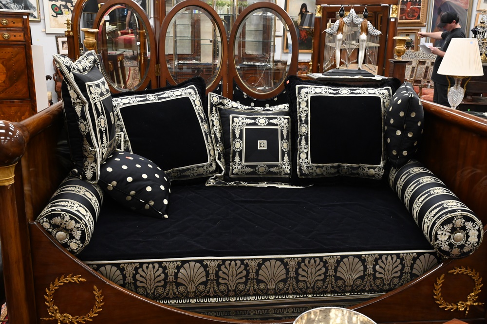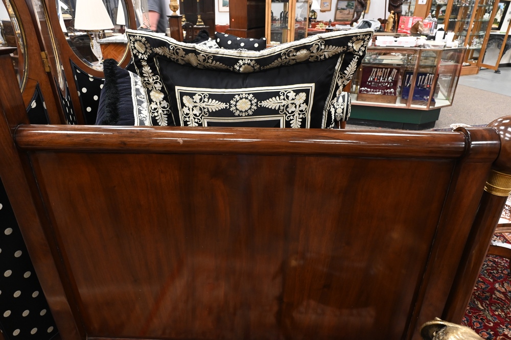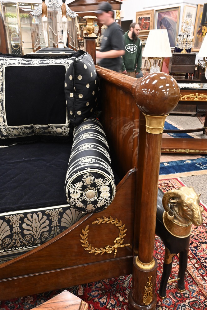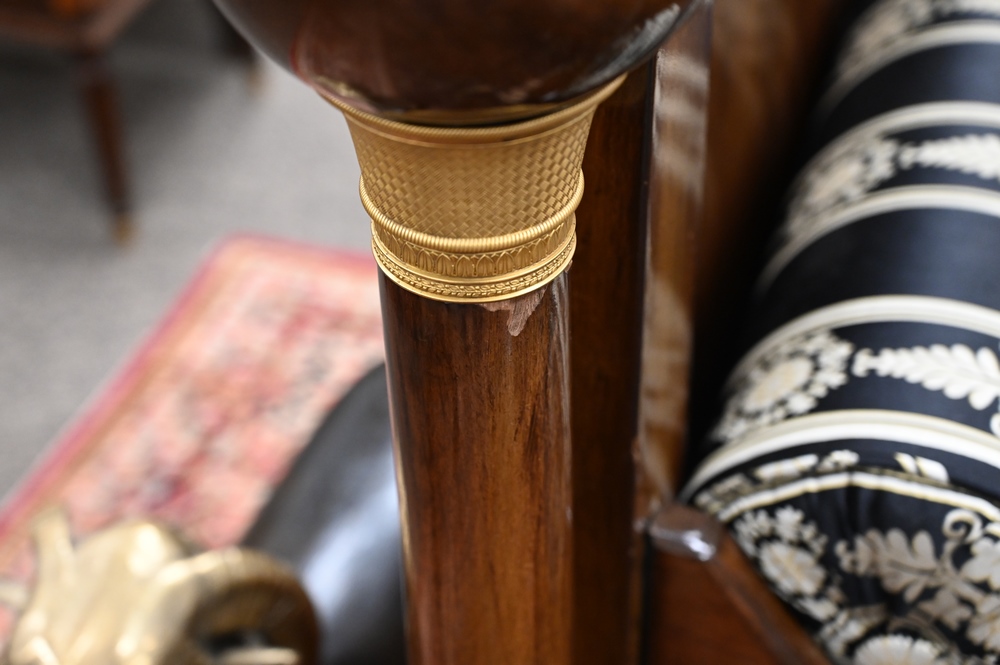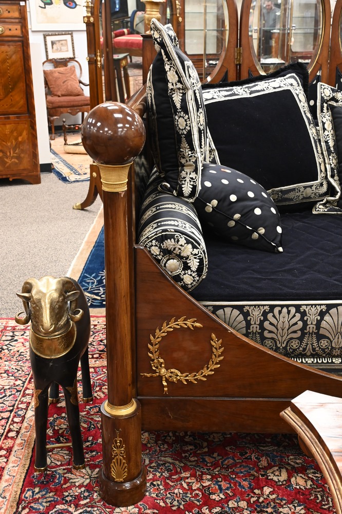 Lot 479: French Empire Mahogany Daybed, having gilt urns on top, bronze mounts and capitals, custom upholstered mattress, pillows and bolster…