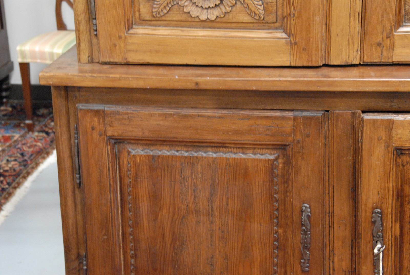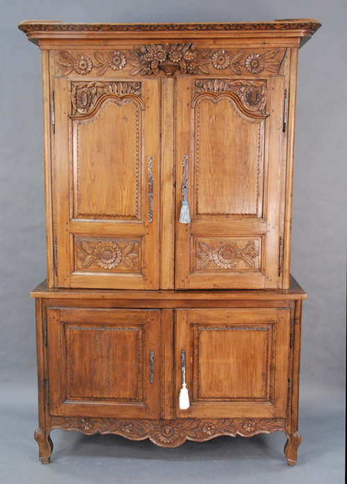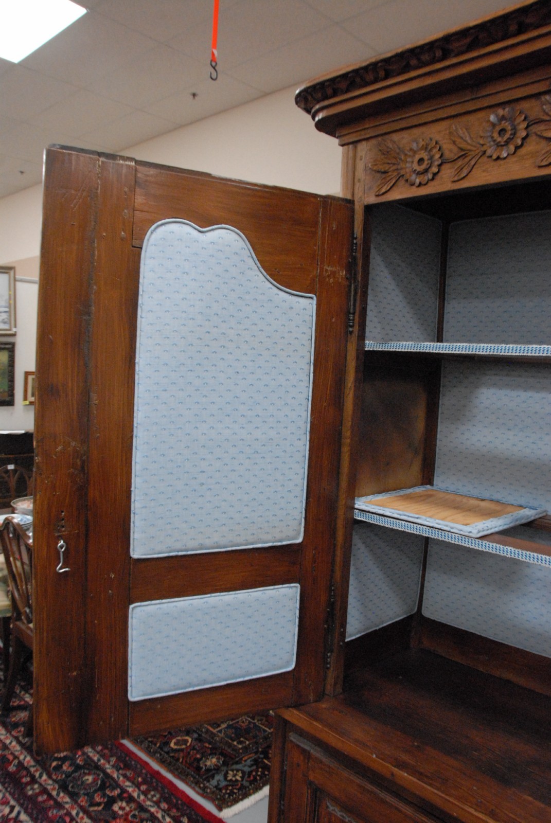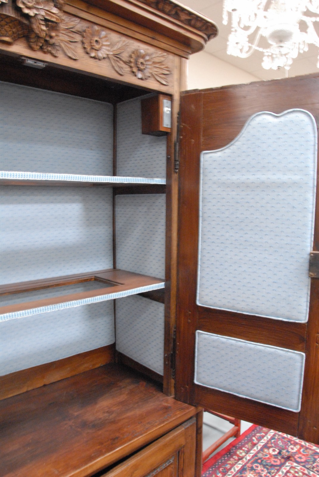 French Provincial two part cupboard, upper section with two doors upholstered back with glass shelf inserts, on lower section with two doors, interior with upholstered inserts on cabriole legs.