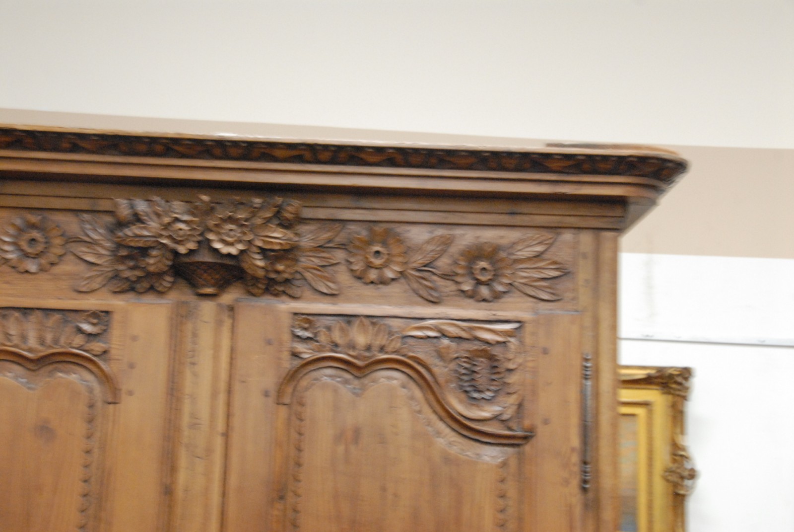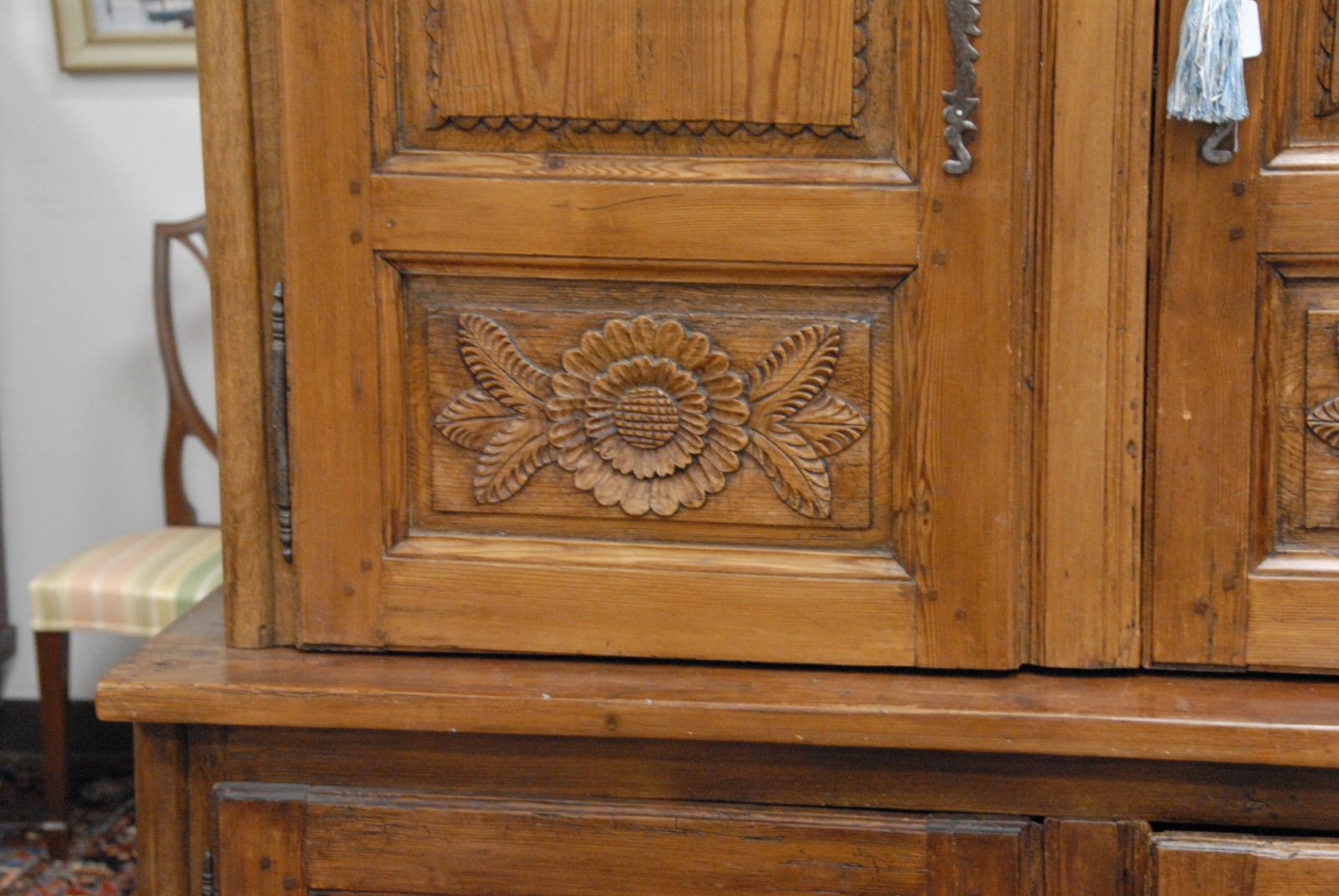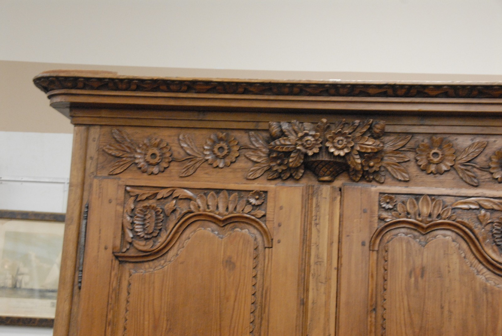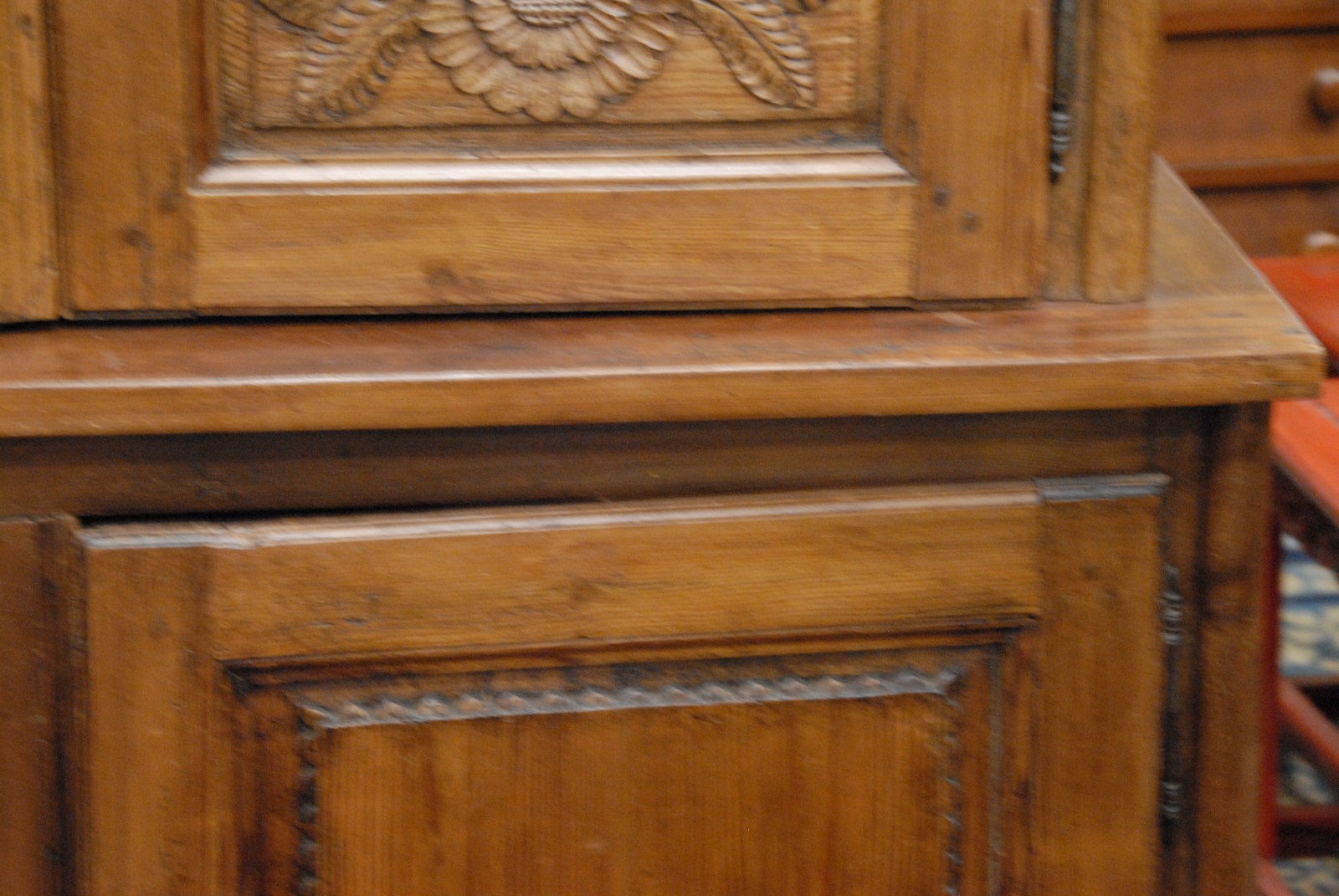 French Provincial two part cupboard, upper section with two doors upholstered back with glass shelf inserts, on lower section with two doors, interior with upholstered inserts on cabriole legs.