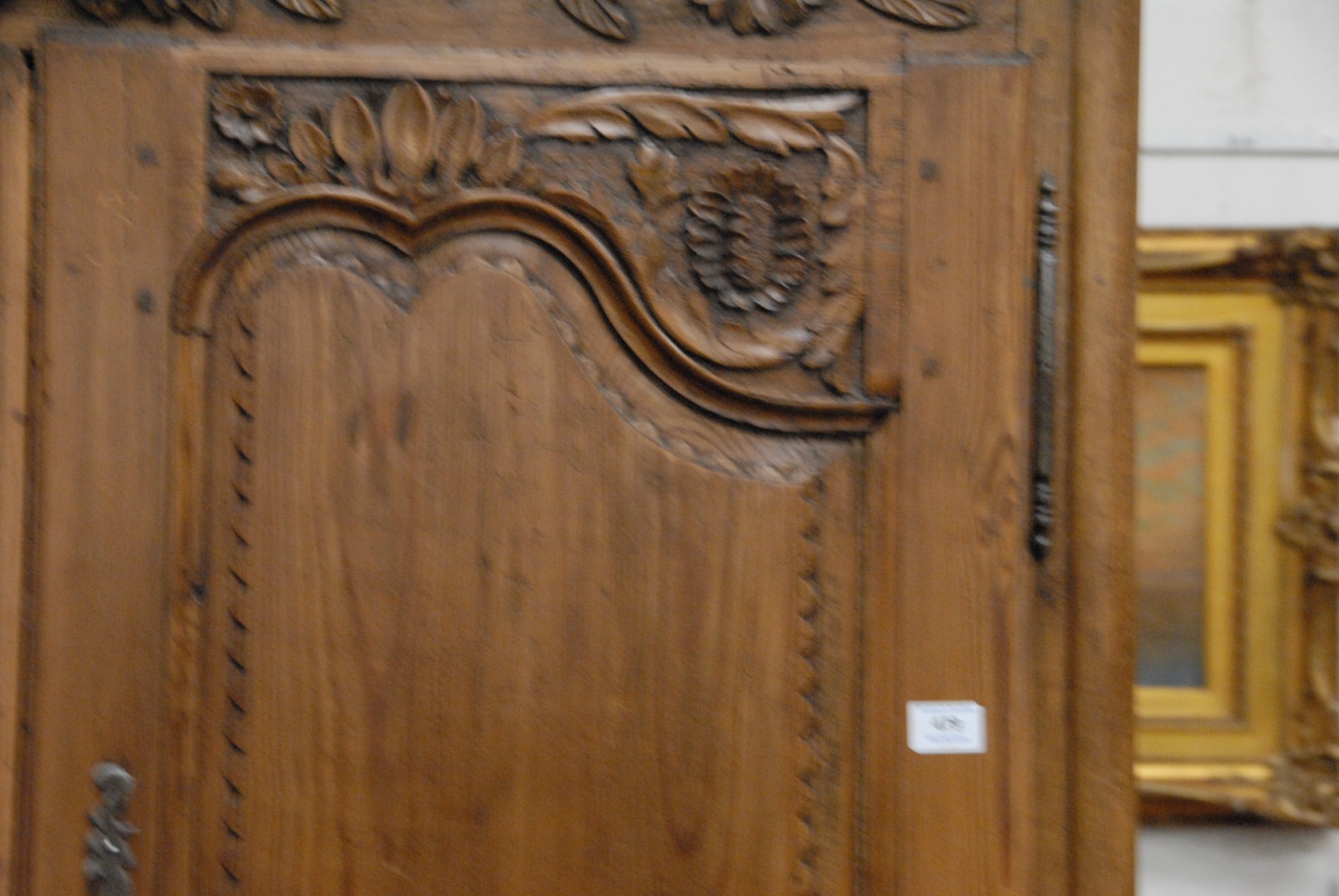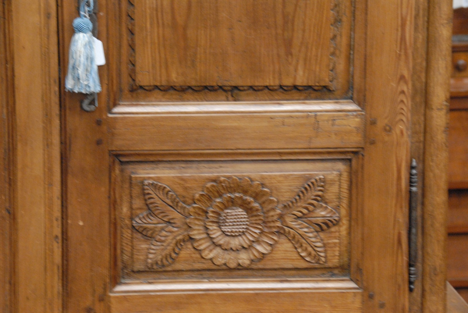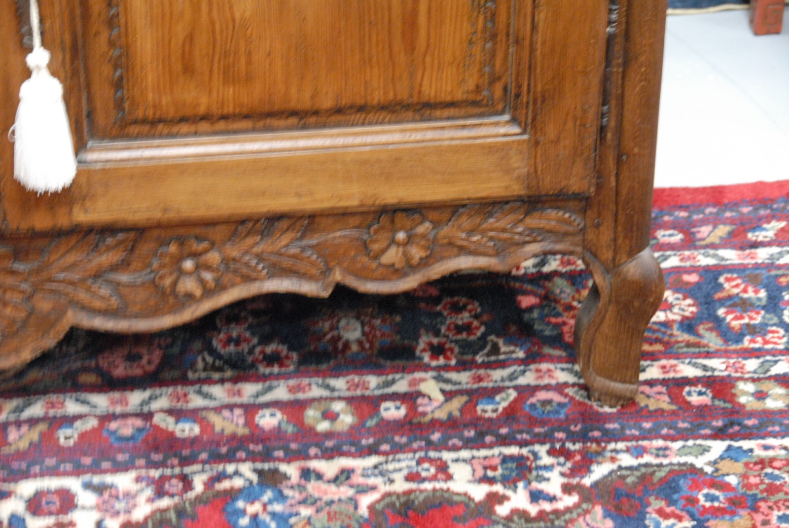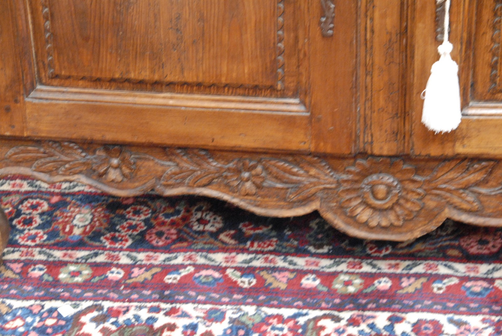 French Provincial two part cupboard, upper section with two doors upholstered back with glass shelf inserts, on lower section with two doors, interior with upholstered inserts on cabriole legs.