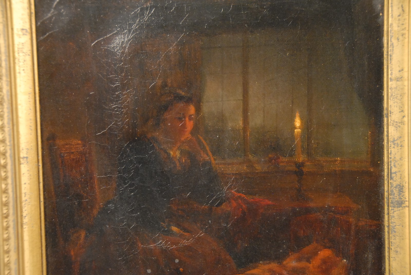 Lot 479: Interior Dutch Scene MOTHER WITH BABY BY WINDOW CANDLELIGHT oil on canvas unsigned 19th century 12 x 9