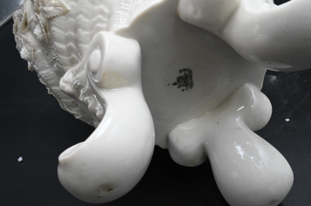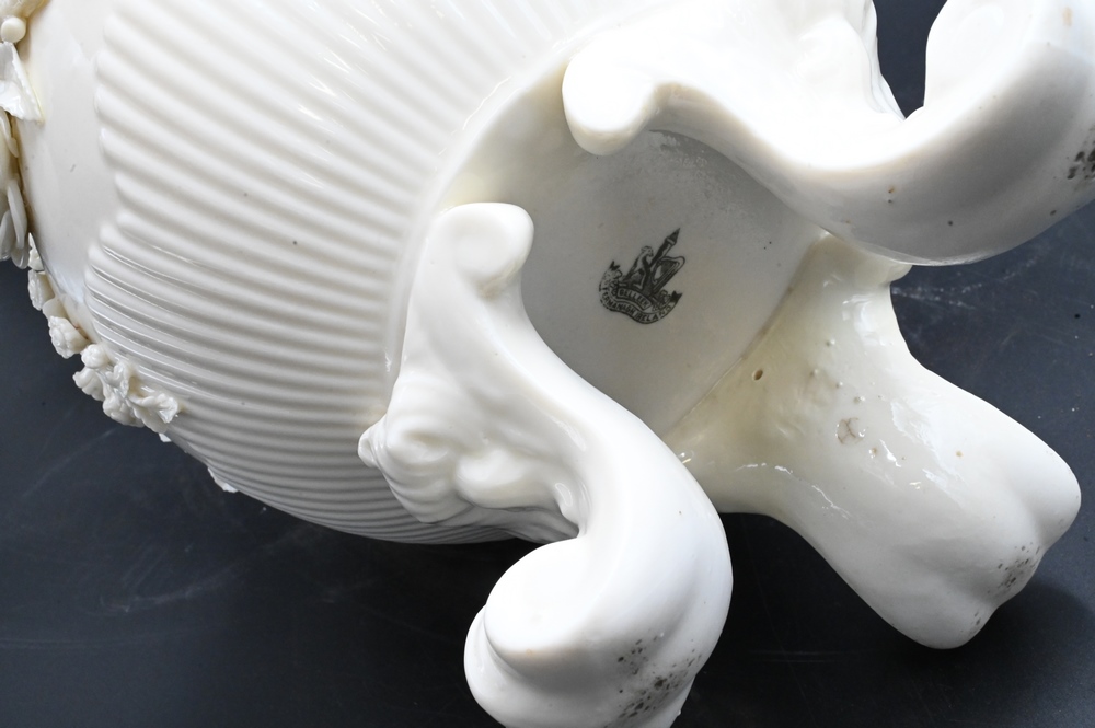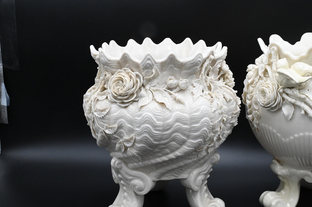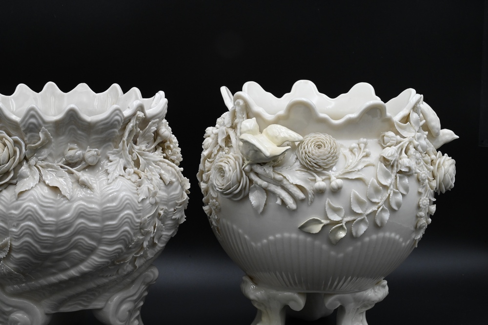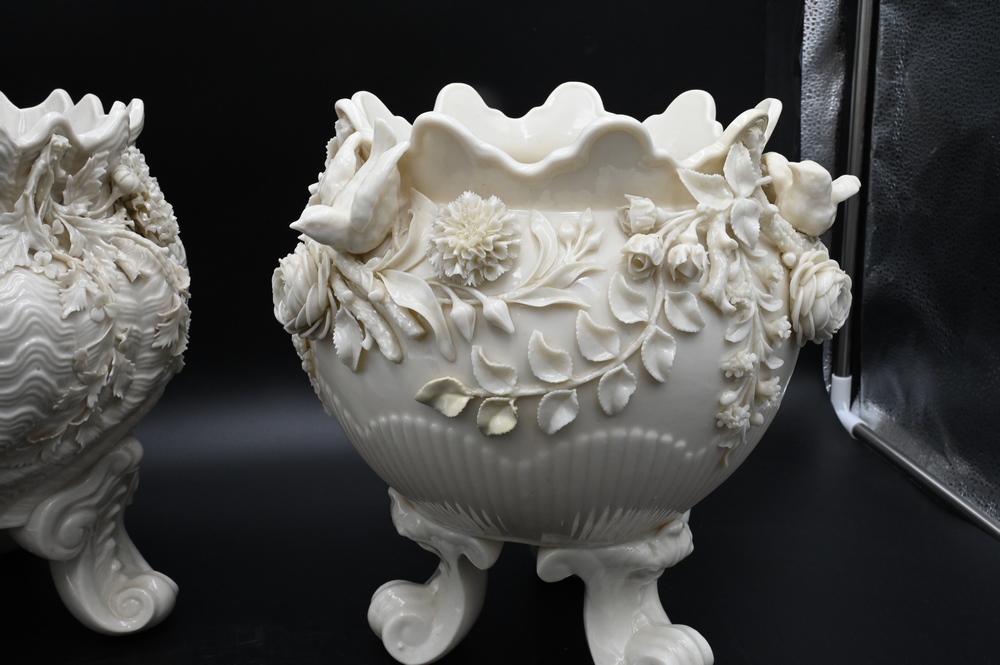 Lot 479: Two Large Belleek Jardinieres, one spiral having encrusted flower and shells, on three scroll footed base, black mark on bottom; along with one mounted with birds and encrusted flowers, black mark on bottom, (repaired), height 11 inches. Provenance: Collections of Norma Reilly, New Jersey.