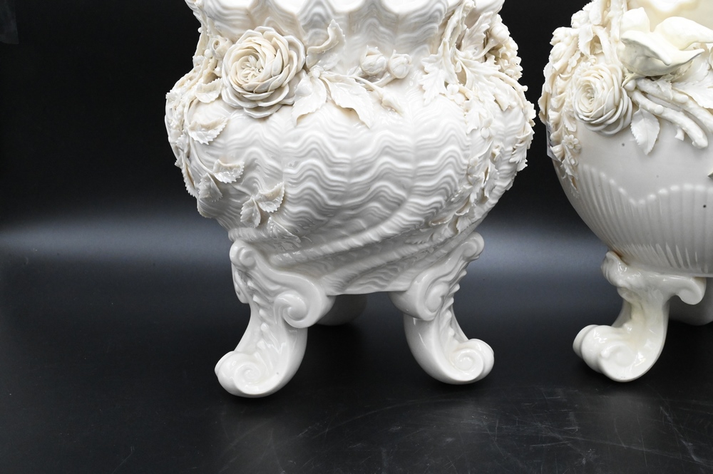 Two Large Belleek Jardinieres, one spiral having encrusted flower and shells, on three scroll footed base, black mark on bottom; along with one mounted with birds and encrusted flowers, black mark on bottom, (repaired), height 11 inches. Provenance: Collections of Norma Reilly, New Jersey.