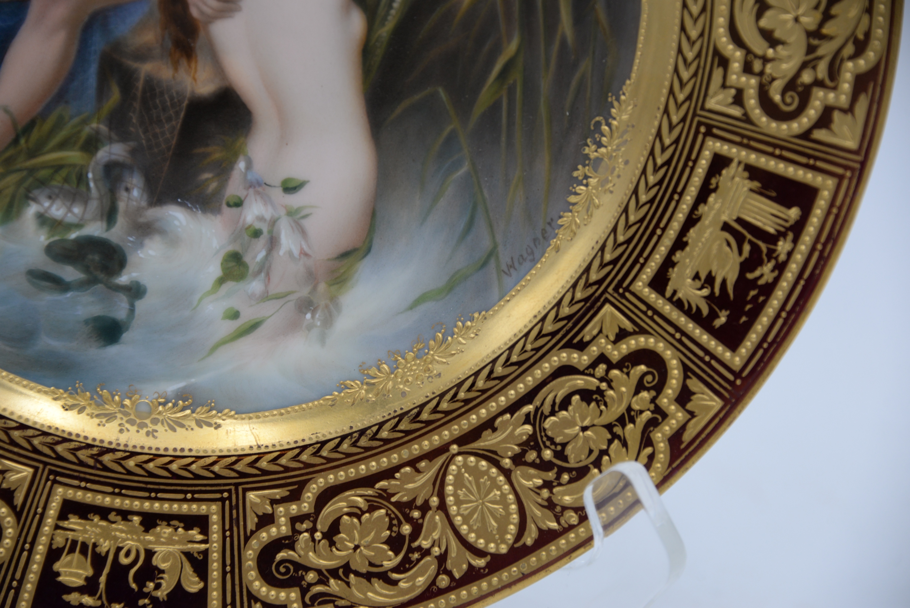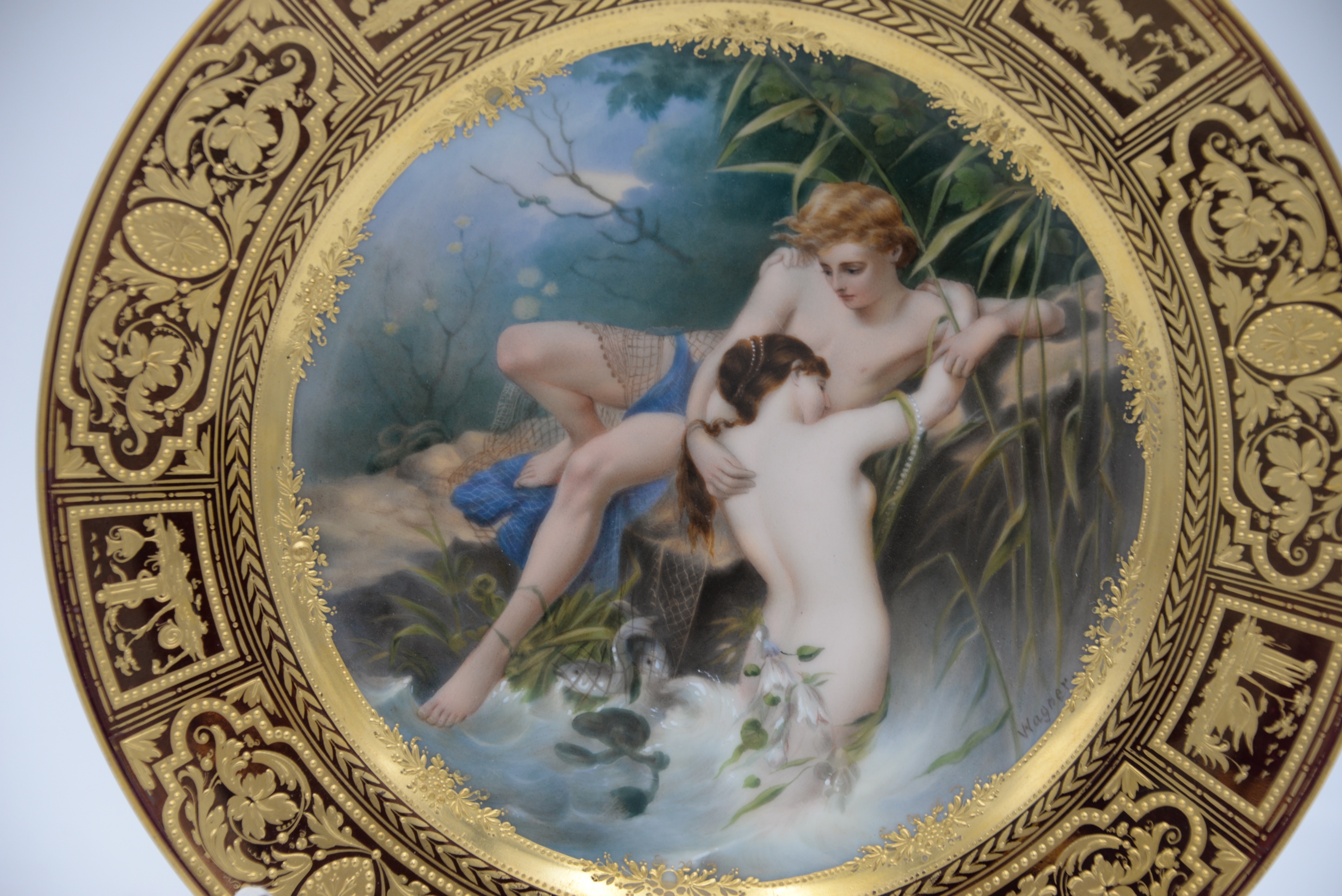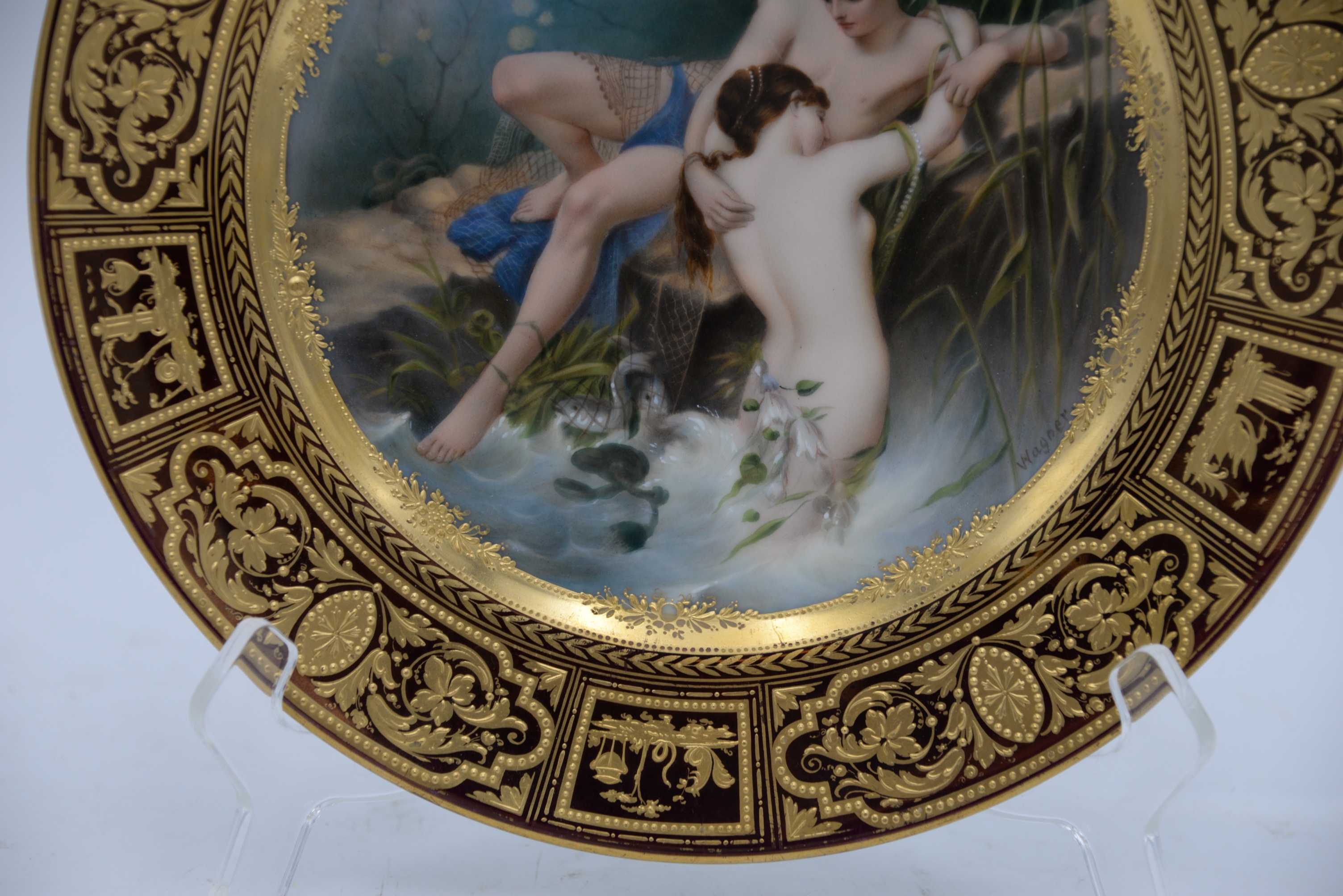Wagner Royal Vienna Portrait Plate, “Fischner und Nisce”, having high relief gold border with birds and carriage, signed Wagner, diameter 9 1/2 inches.