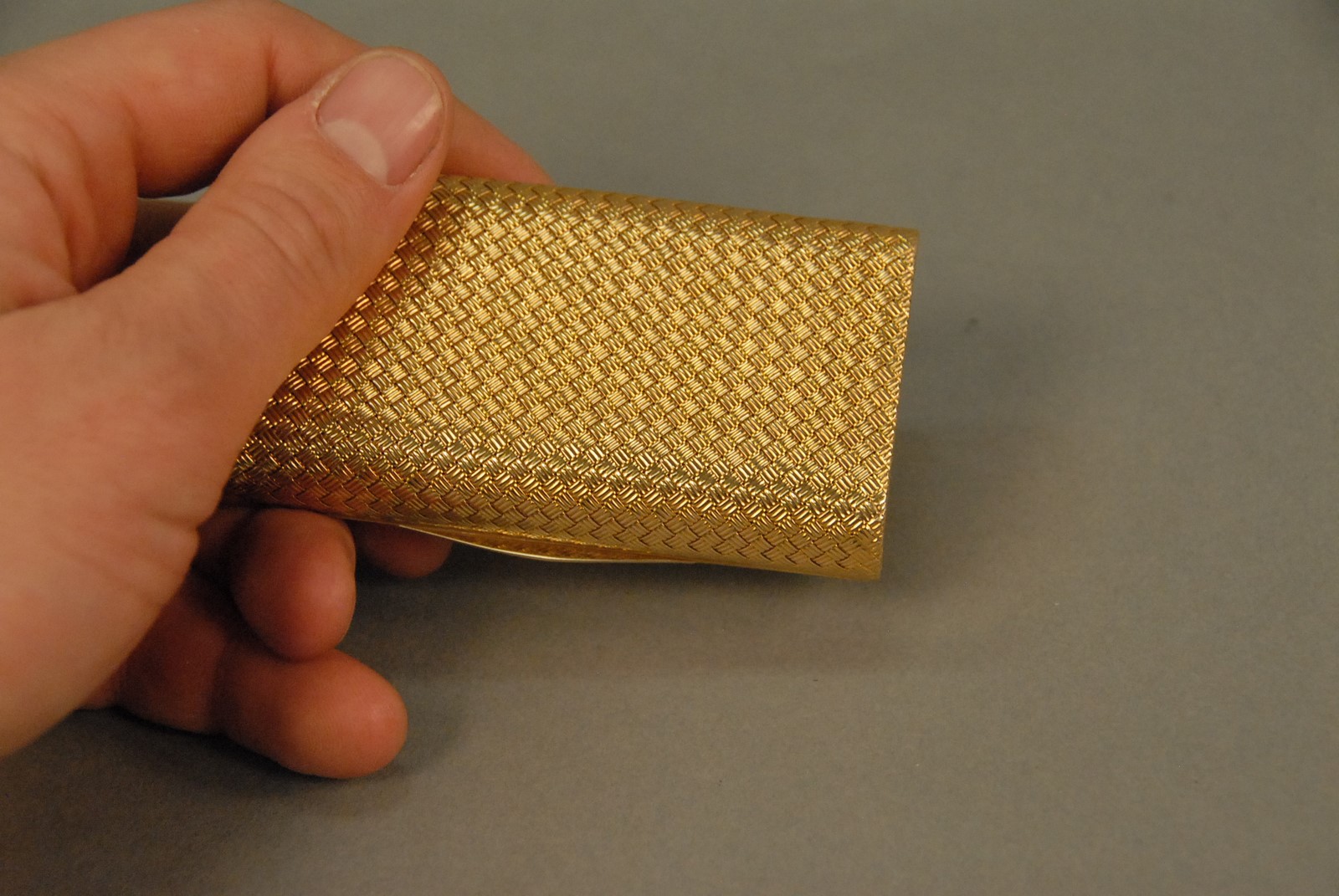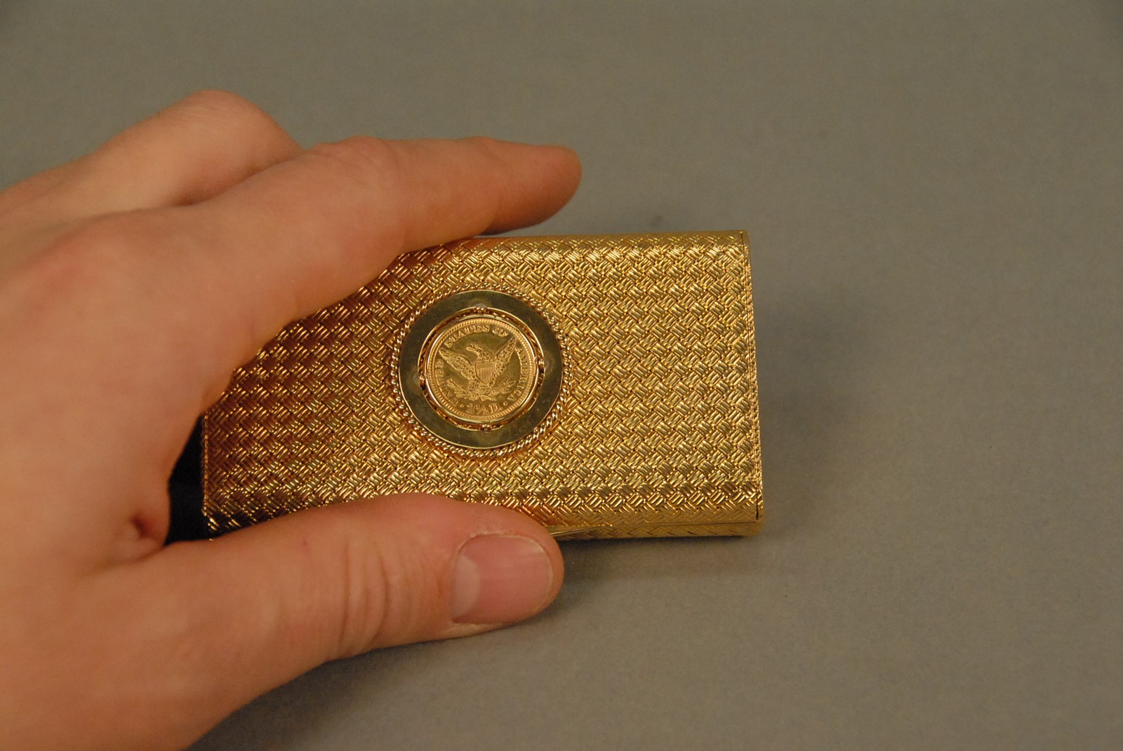 Lot 48: 14K yellow gold woven box with hinged lid, top set with 2 1/2 dollar gold coin, 3 1/2 x 2, 89.4 grams. Provenance: Property from The Estate of Margaret Reventlow of Litchfield, CT
