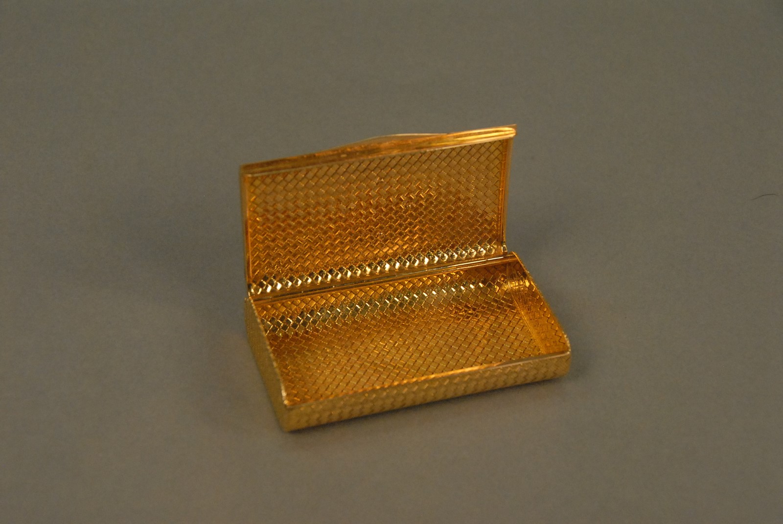 14K yellow gold woven box with hinged lid, top set with 2 1/2 dollar gold coin, 3 1/2 x 2, 89.4 grams. Provenance: Property from The Estate of Margaret Reventlow of Litchfield, CT