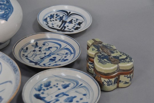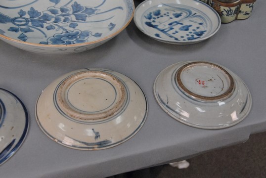 Lot 48: Blue and white Oriental group to include a celadon and blue painted ginger jar, bottle vase, seven small plates, two bowls, a pillow…