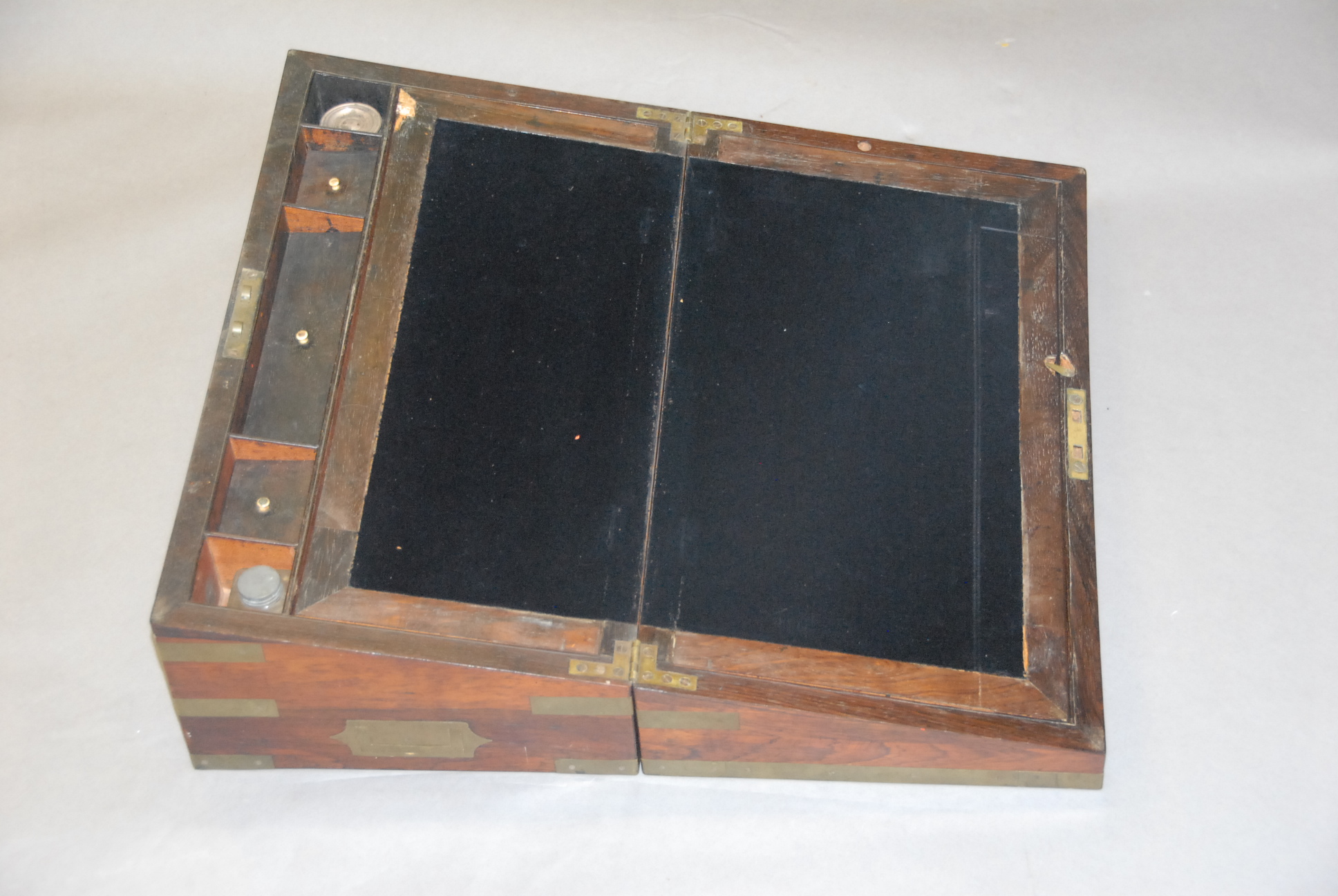 Brass bound rosewood lap desk minor brass missing.