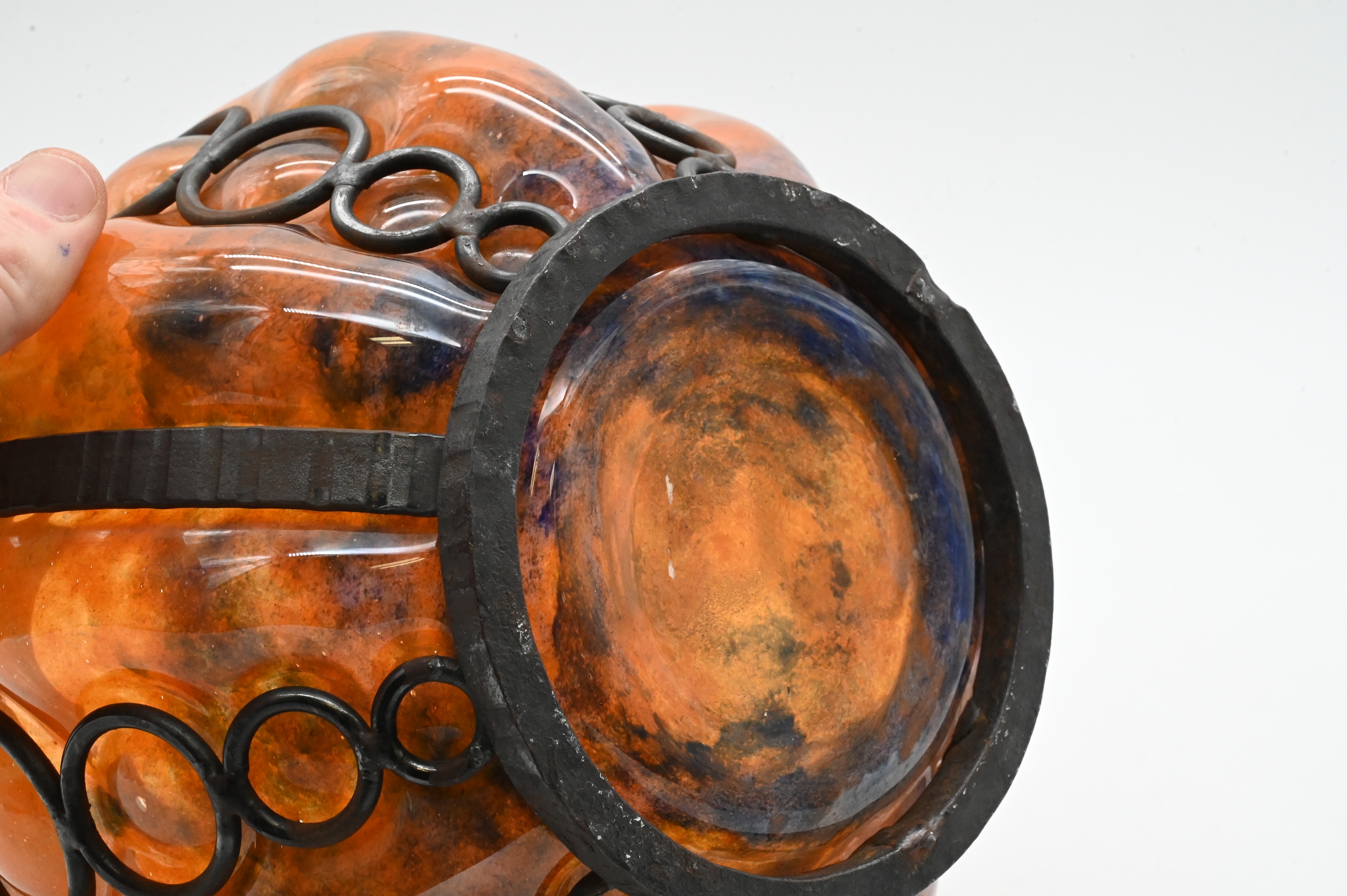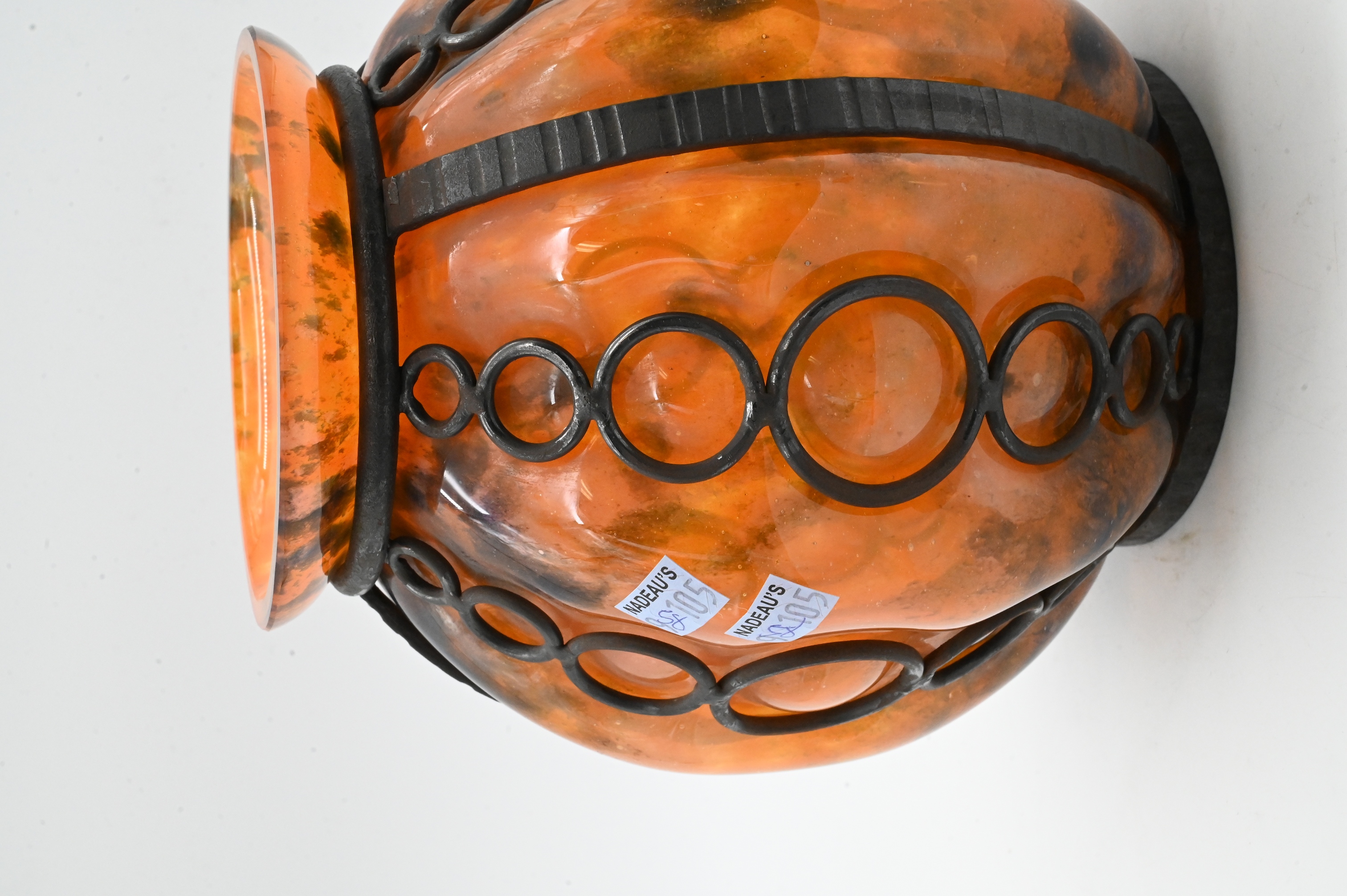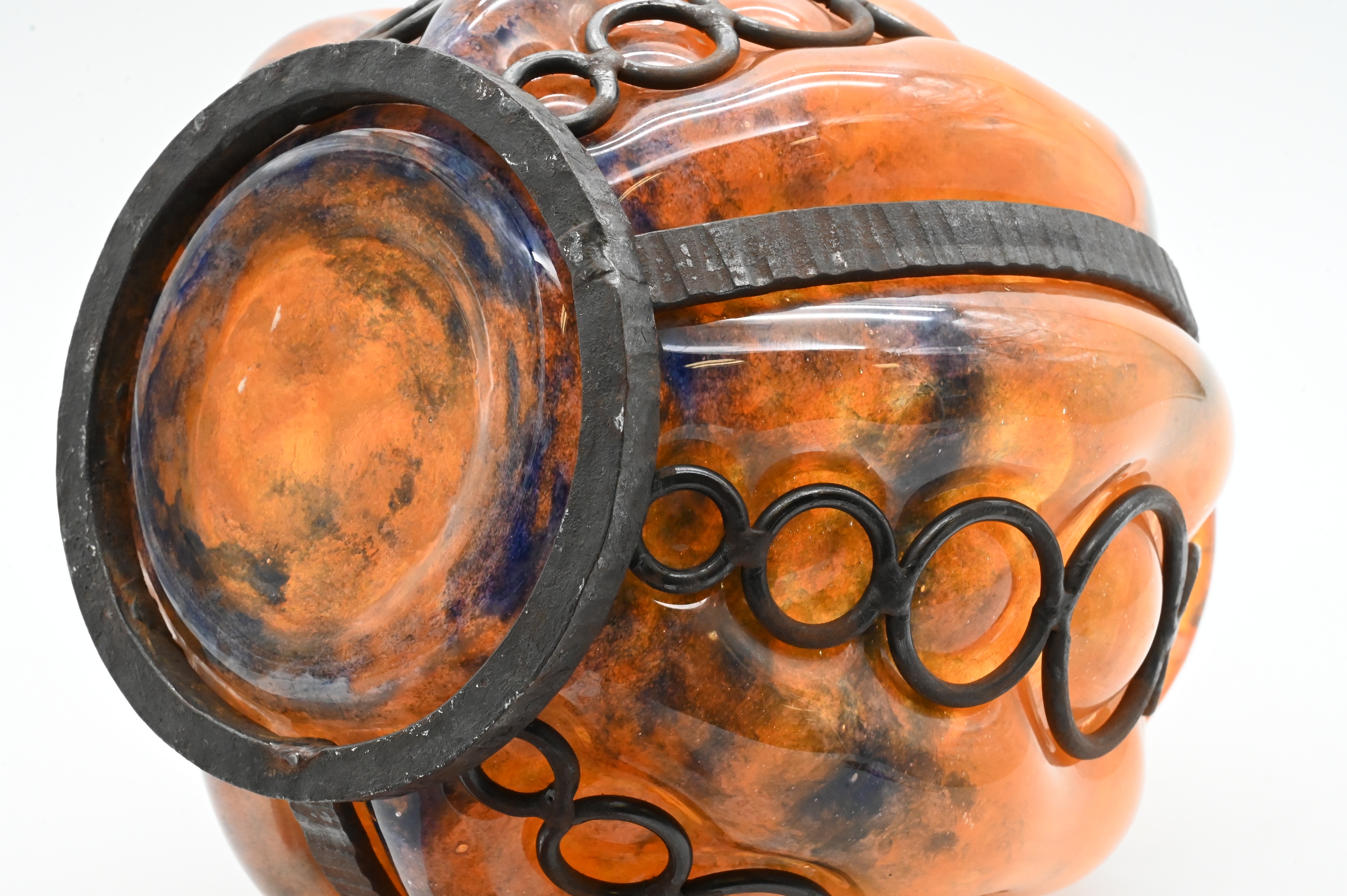 Globular amber-toned art glass vase with mottled coloration, fitted with applied black wrought-iron banding and circular mounts, faintly signed