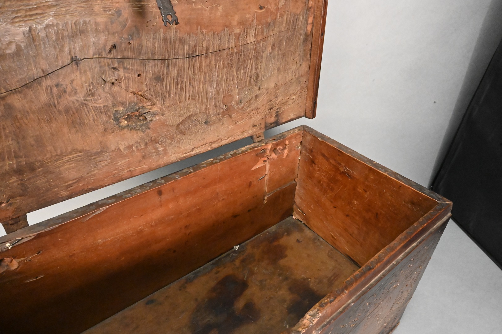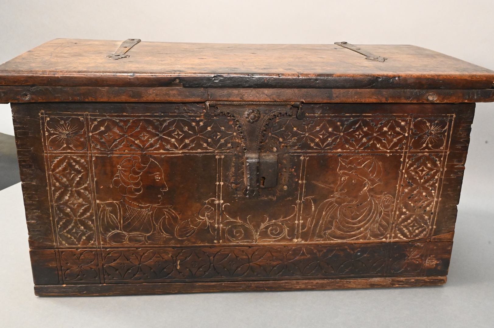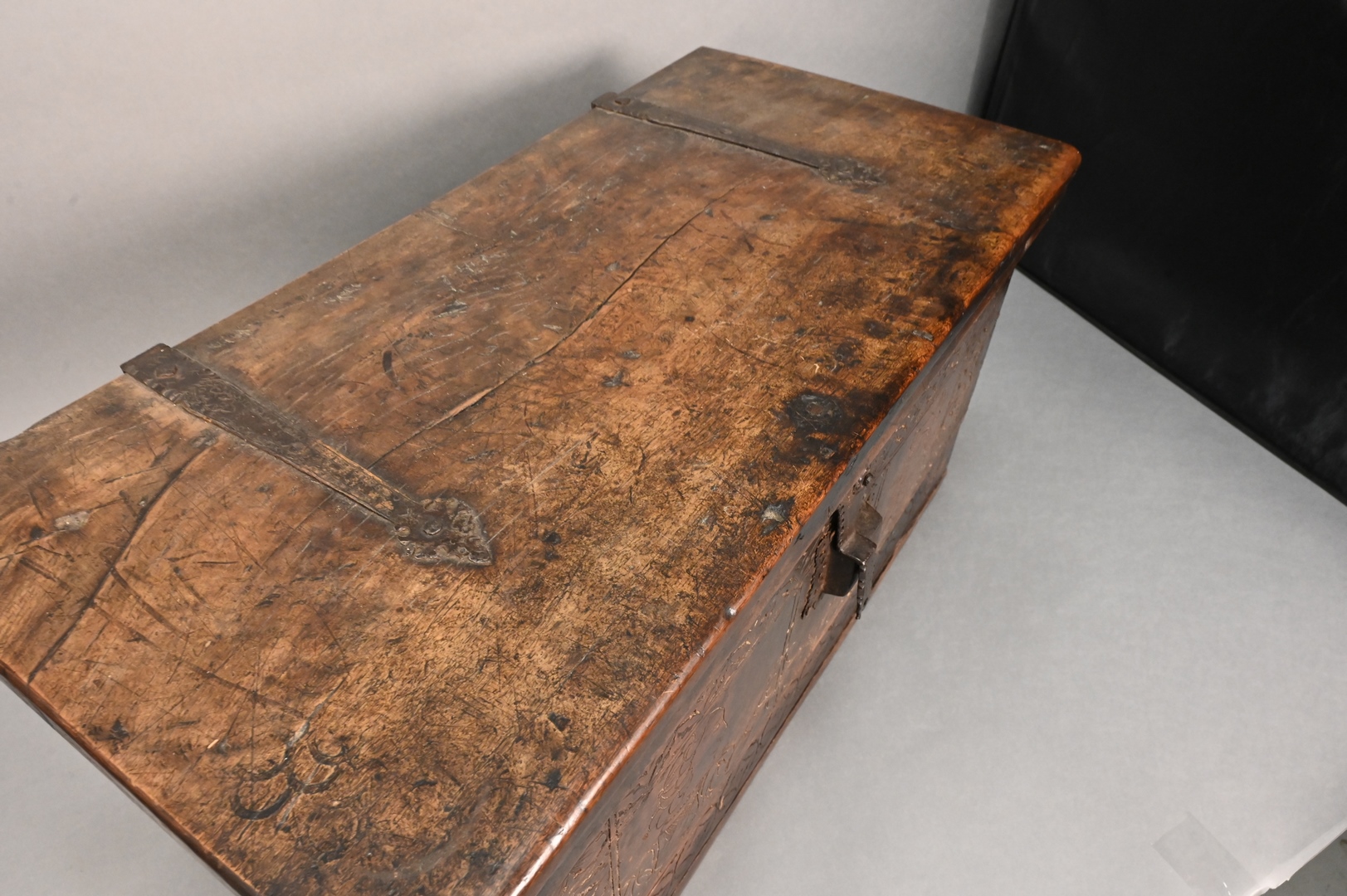 Continental Walnut Lift Top Chest, having embossed iron hinges, iron lock along with carved front depicting man, sword, and woman, sides carved with urn having arrows, probably 17th century, drawer in bottom, drawer restored, height 14 1/2 inches, top 14″ x 28 1/2″. Provenance: Estate of Peter Tillou, Litchfield, Connecticut.