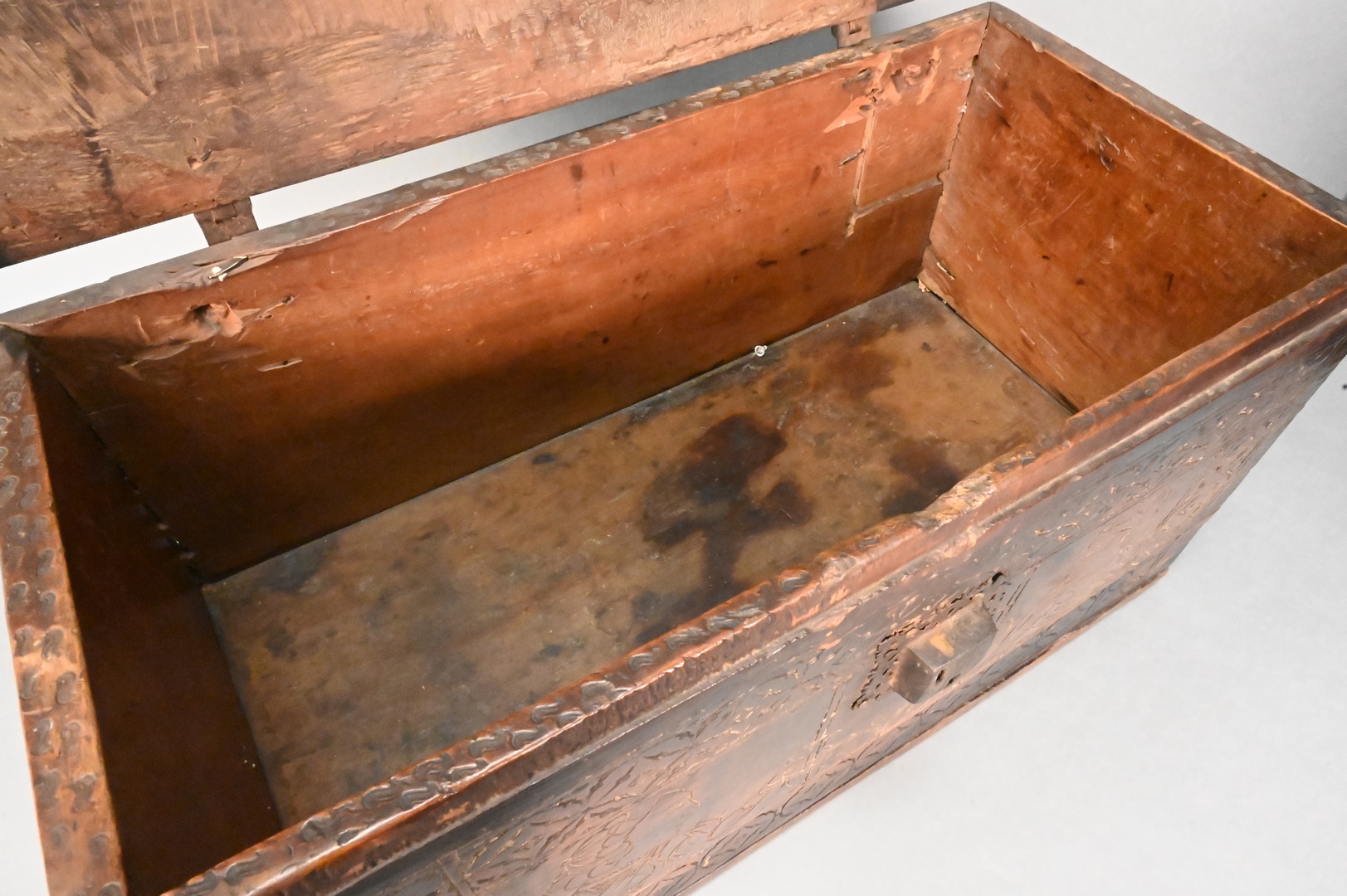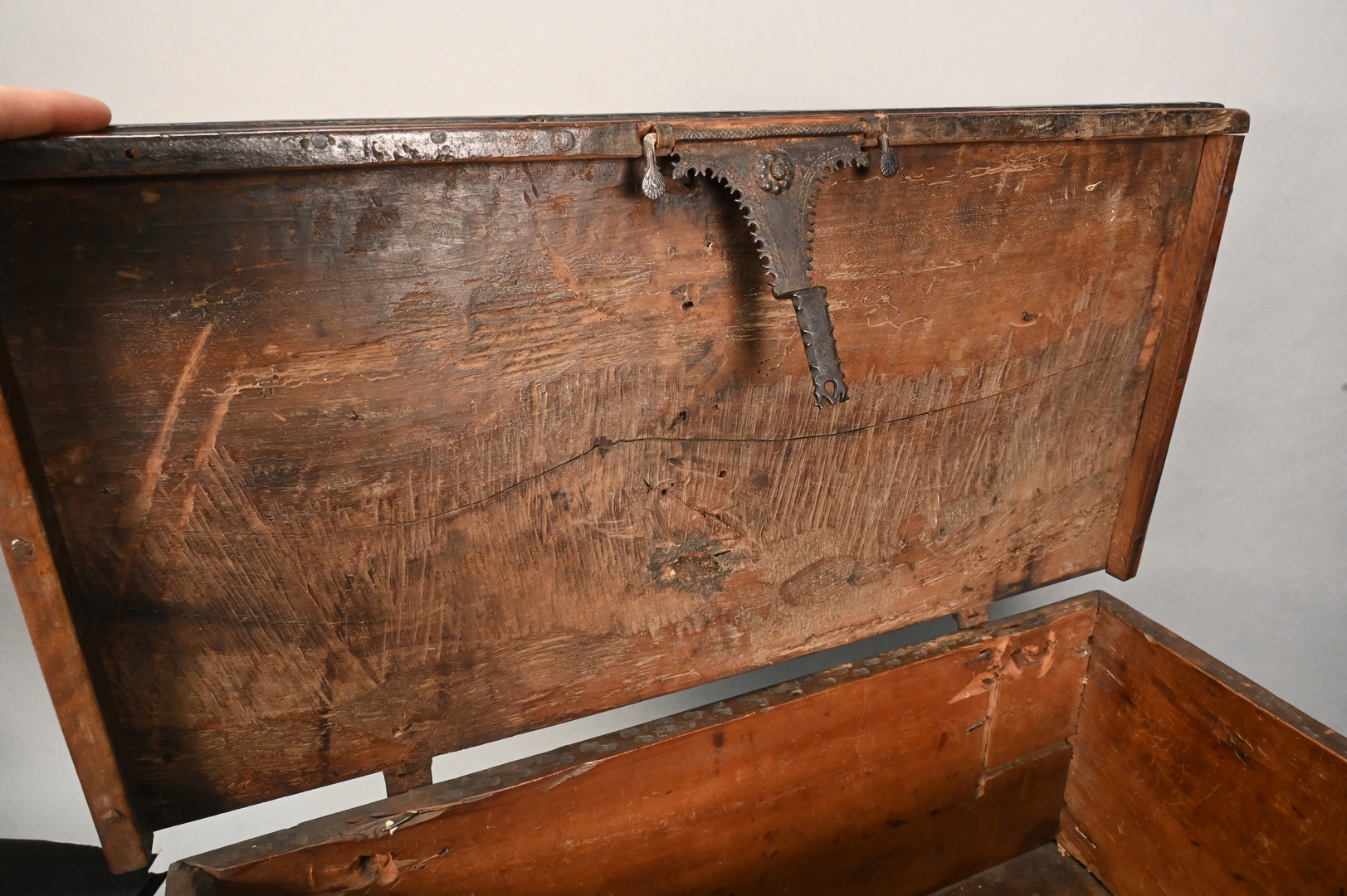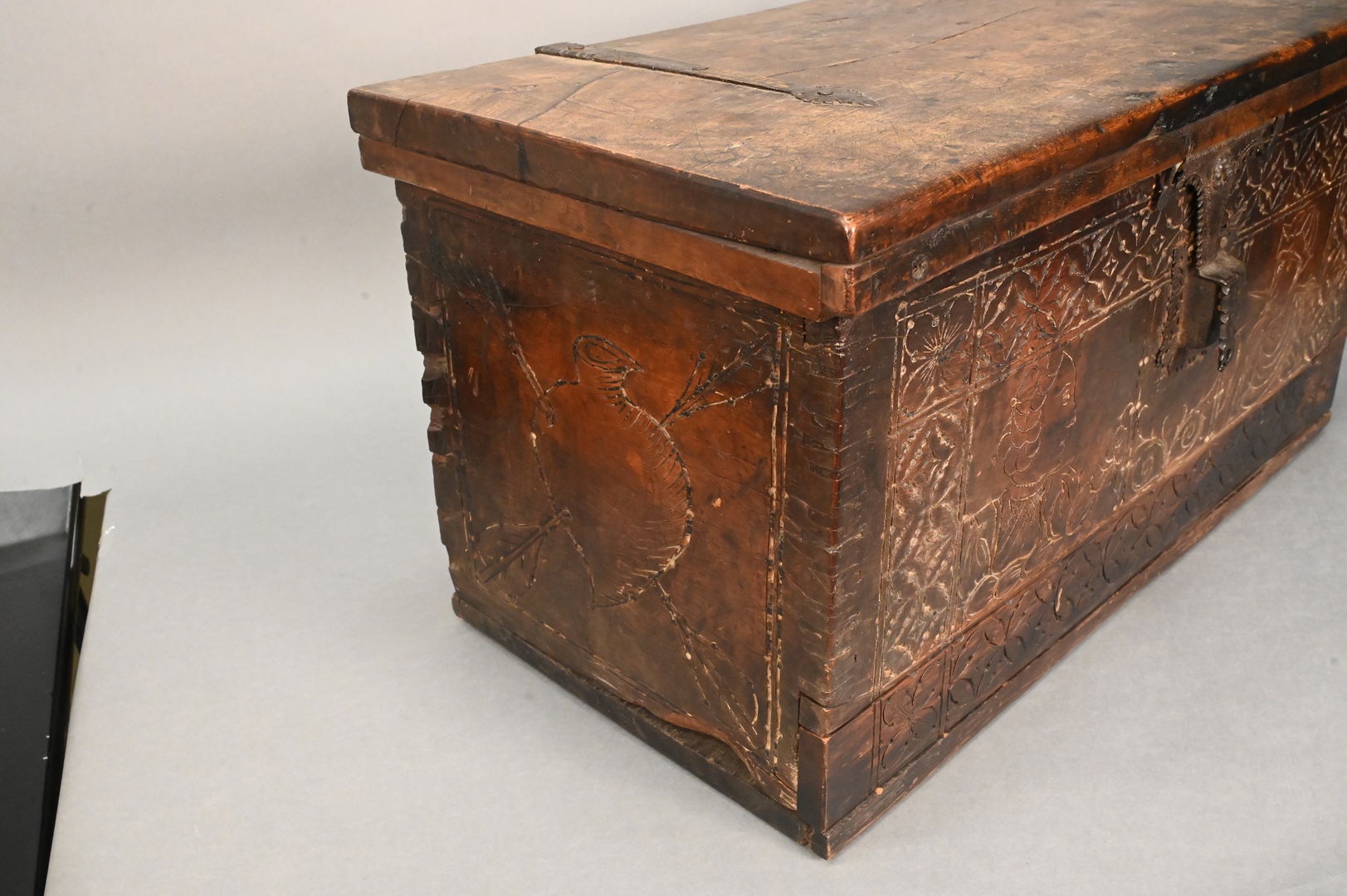 Continental Walnut Lift Top Chest, having embossed iron hinges, iron lock along with carved front depicting man, sword, and woman, sides carved with urn having arrows, probably 17th century, drawer in bottom, drawer restored, height 14 1/2 inches, top 14″ x 28 1/2″. Provenance: Estate of Peter Tillou, Litchfield, Connecticut.