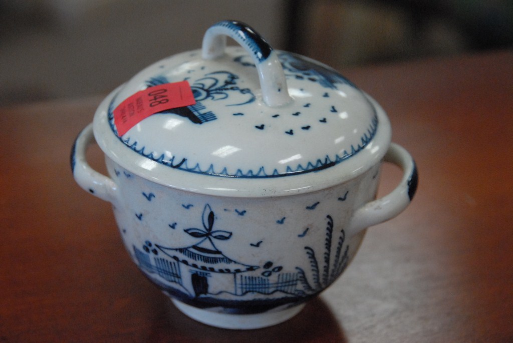 Early English blue decorated covered two handle dish, 19th century.
