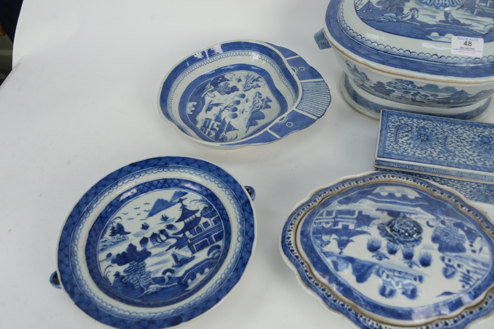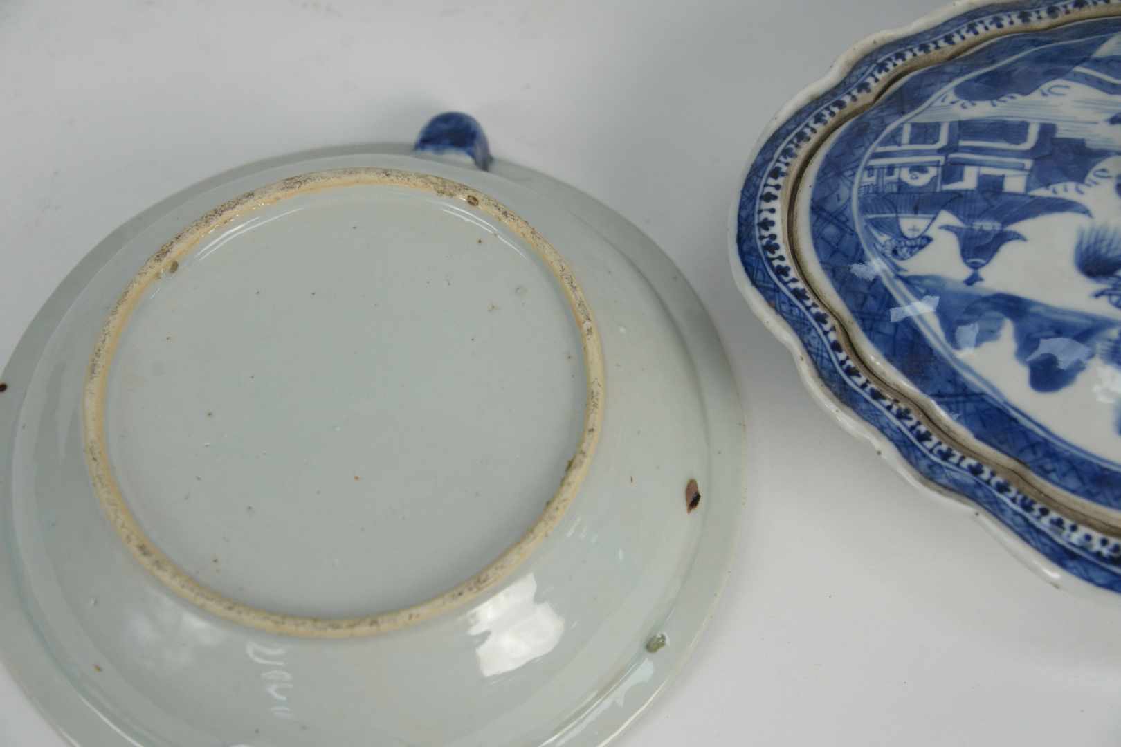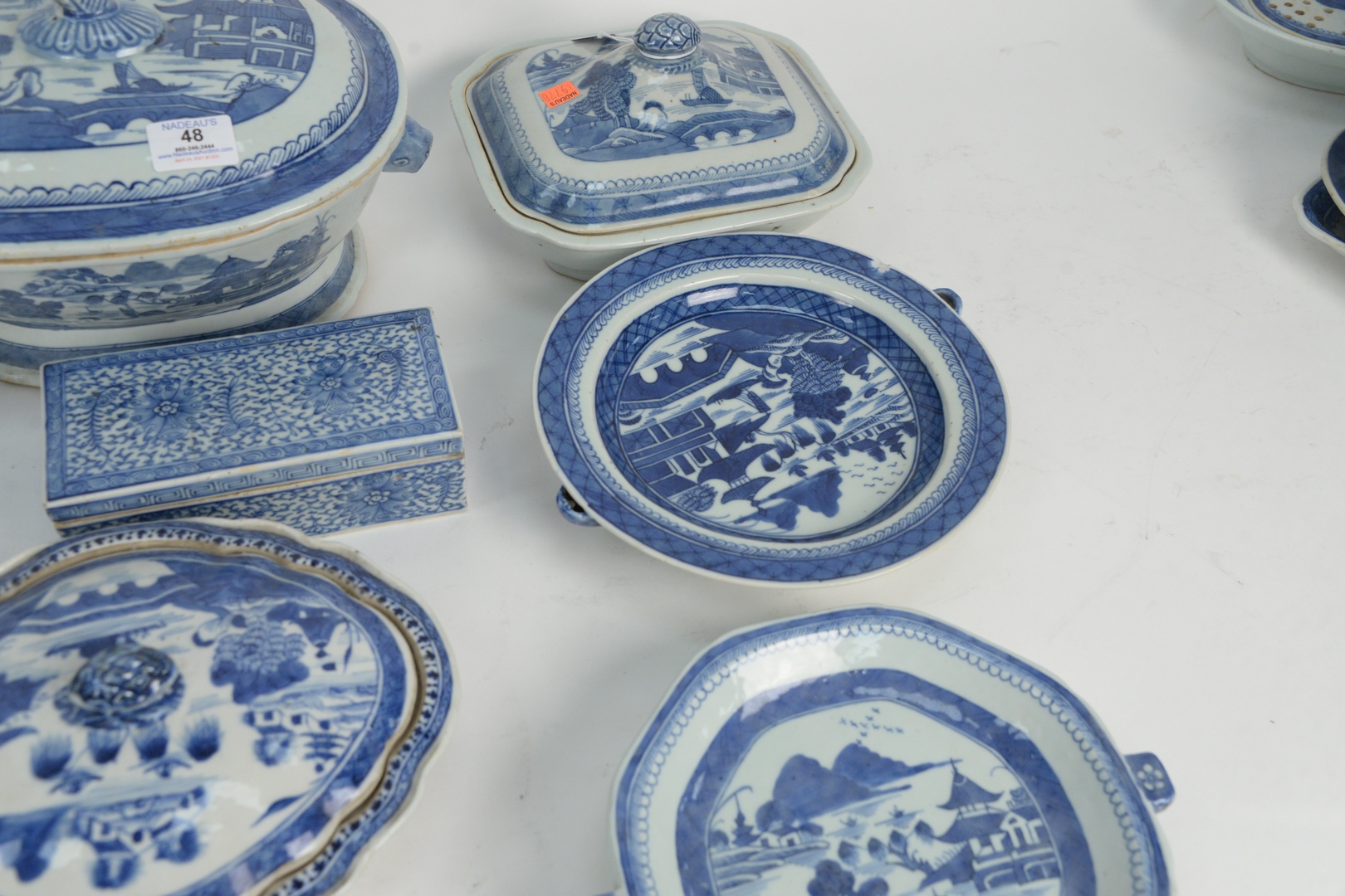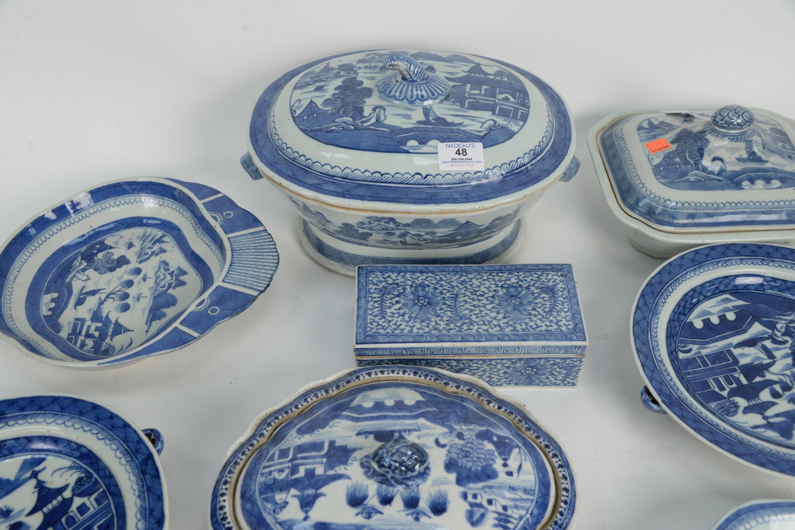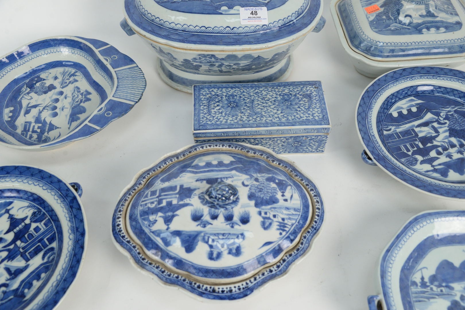 Eight Piece Lot of Canton to include 3 warming plates, 3 covered dishes, 1 covered box, largest height 7 inches, length 12 inches. Provenance: From a Newport, Rhode Island historic home, in the same family since 1761.