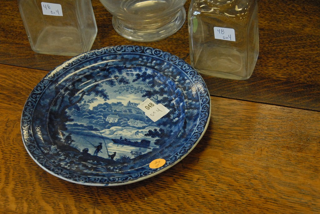 Lot 48: Four piece lot Staffordshire blue and white Clews plate, two early square bottles, and crystal pitcher.
