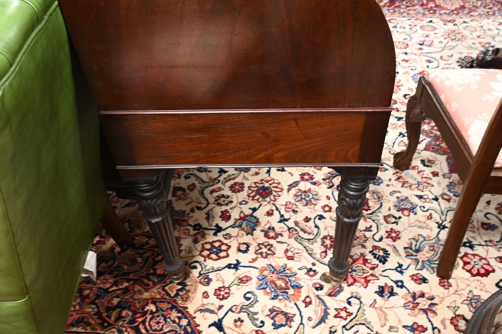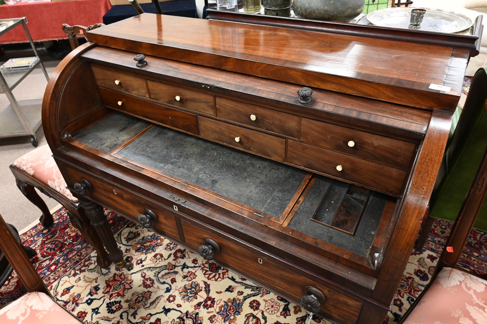 Lot 48: George III Mahogany Cylinder Roll Top Desk, having pull out leather writing surface over two drawers, on turned and fluted legs ending in brass castors, circa 1830, height 42 inches, width 46 inches.