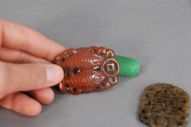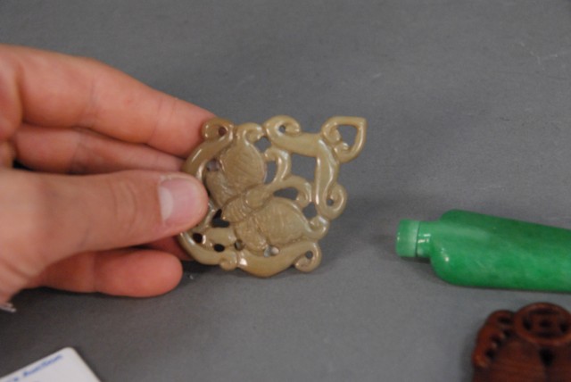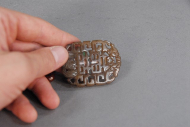Group of 4 hard stone pieces to include 3 reticulated carved pendants and a snuff bottle