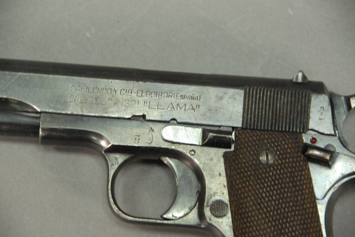 Llama semi-auto pistol, 7.65 mm manufactured 1933-1958, markings indicate manufactured during wartime for Nazi party, right side of frame marked G.e.c.o. indicating issued to civilian contractors I. E. drivers, servants, etc. 266 SN-69846