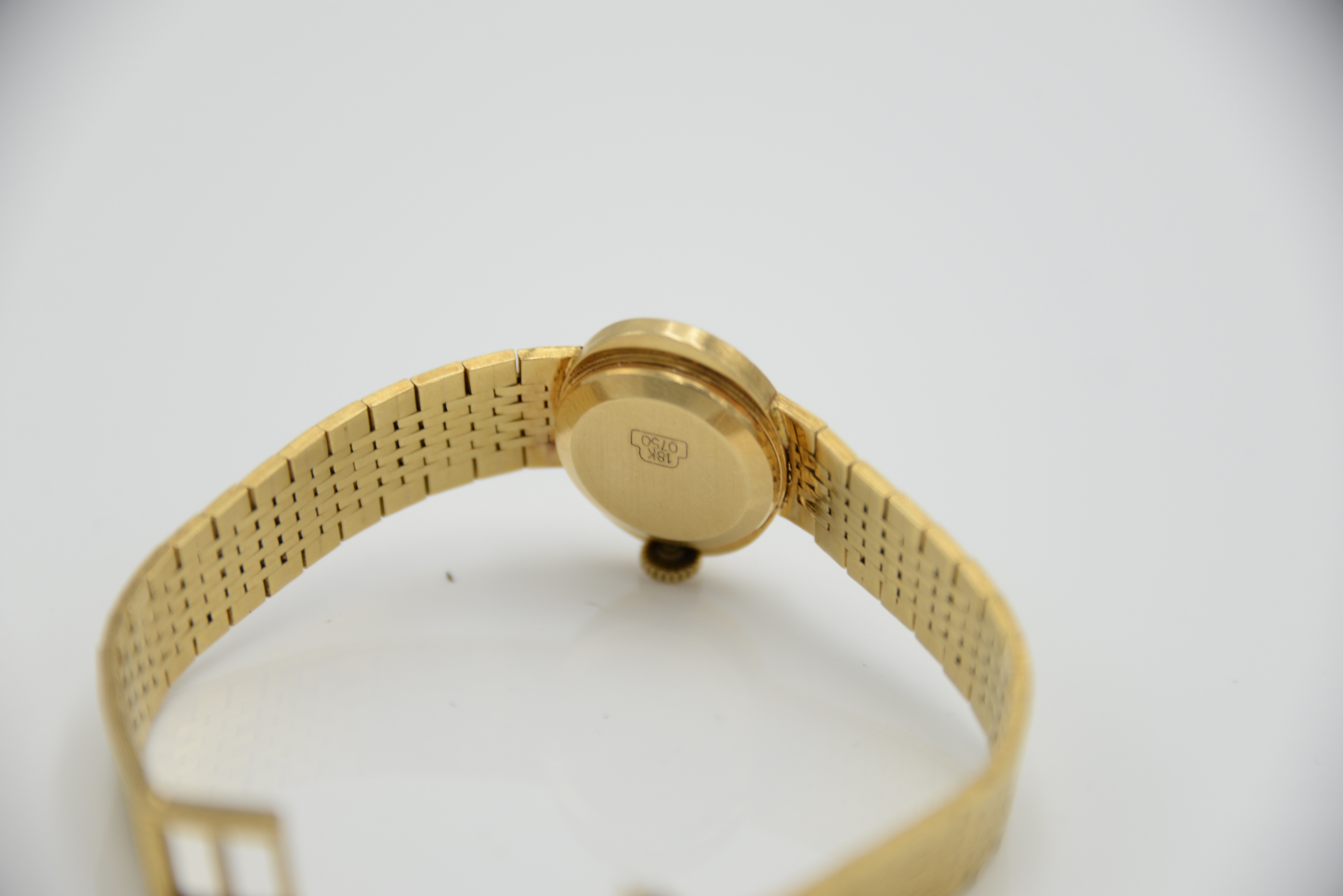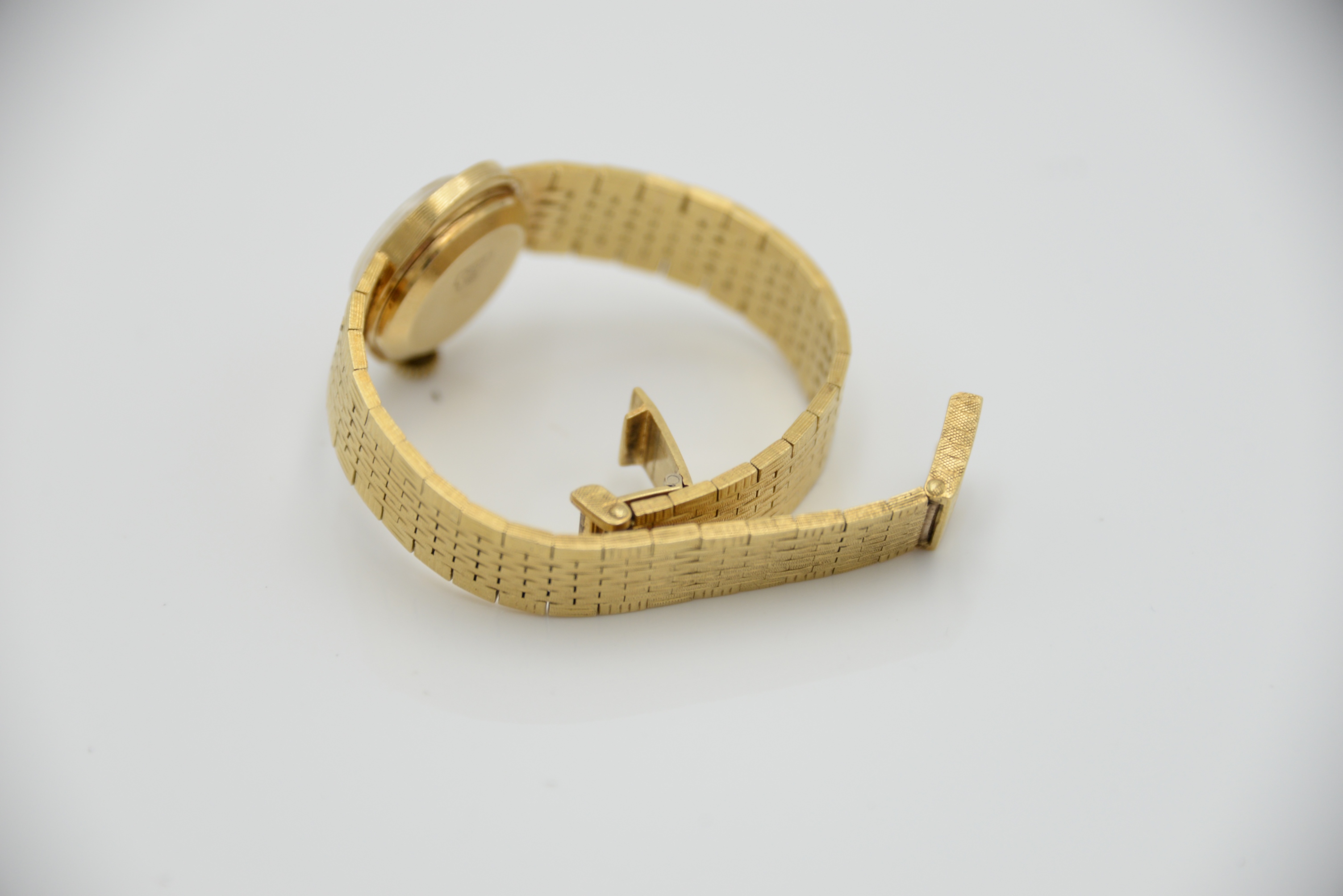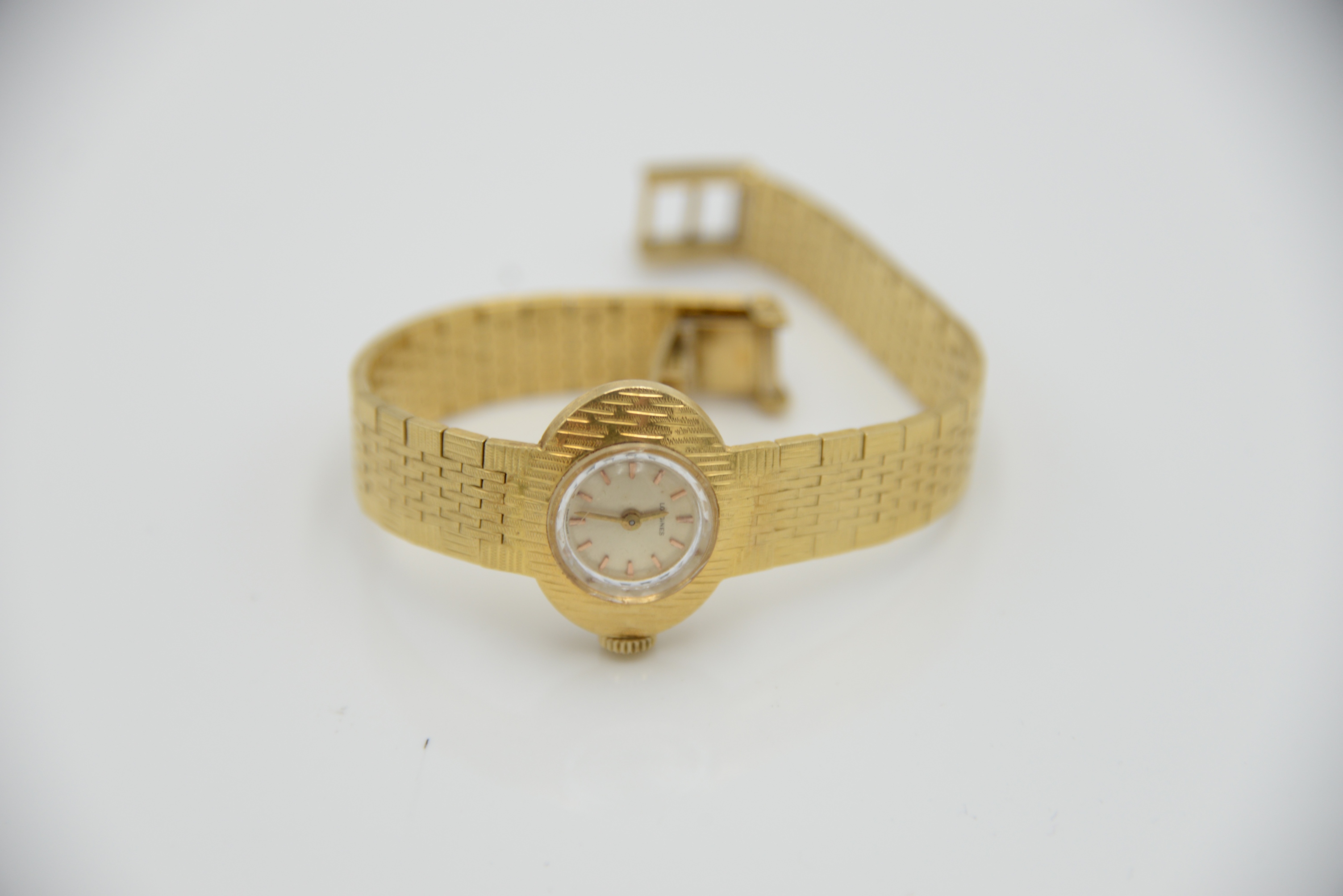 Longines 18 Karat Yellow Gold Ladies Wristwatch having 18 karat yellow gold mesh bracelet 43.16 grams total weight, length 6 3/4 inches.