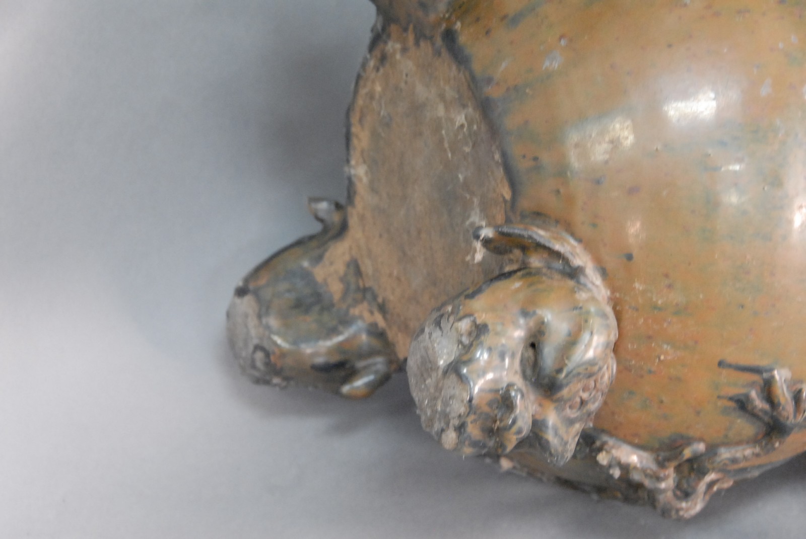 Massive Chinese stoneware censer with applied dragons and lion-head feet, Qing, minor losses.