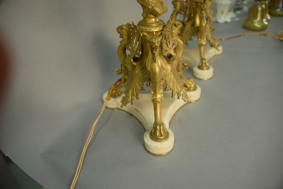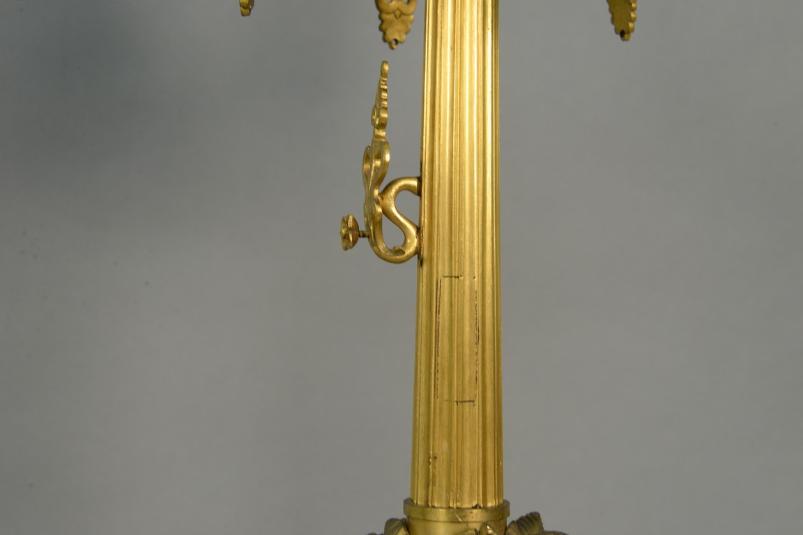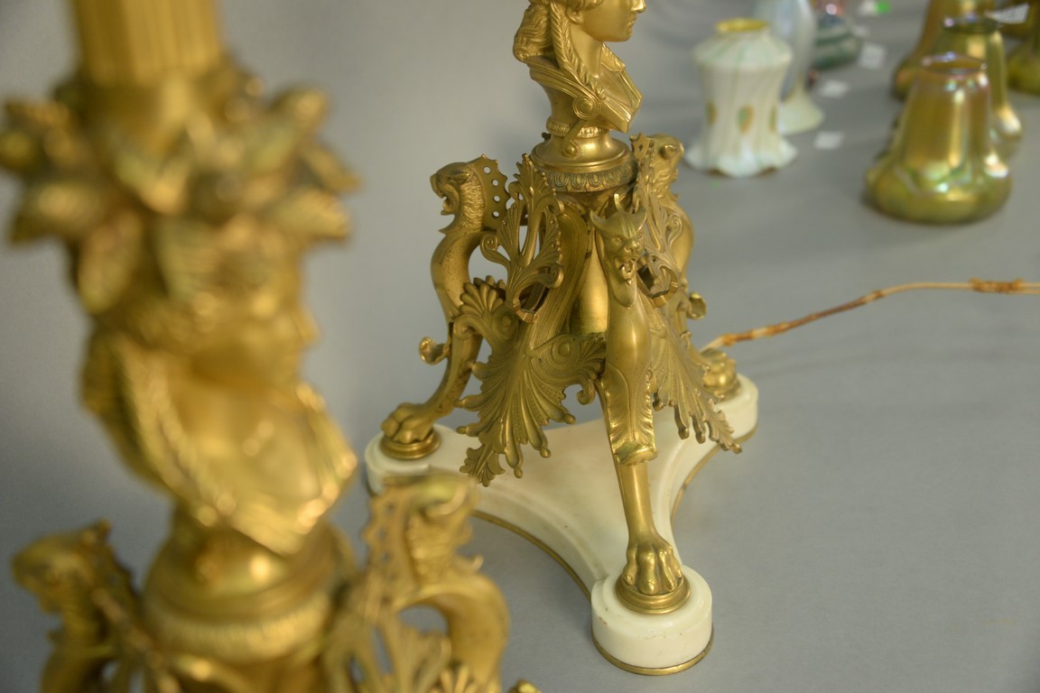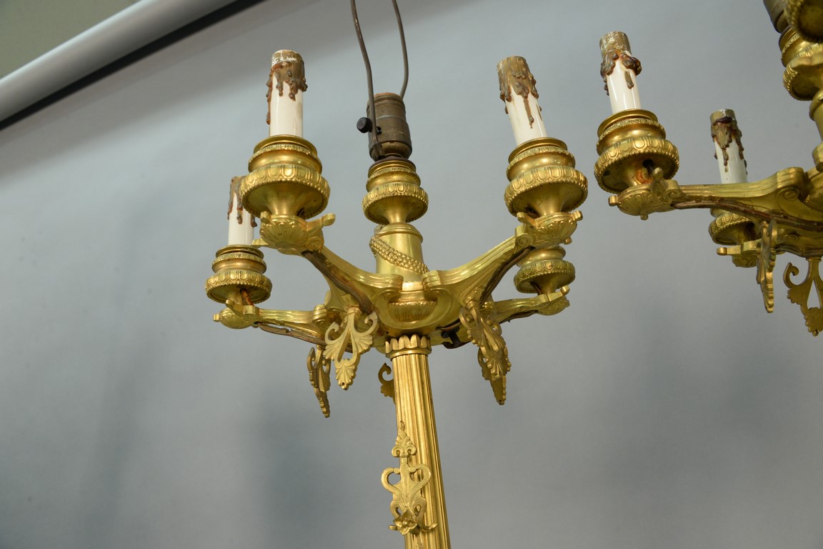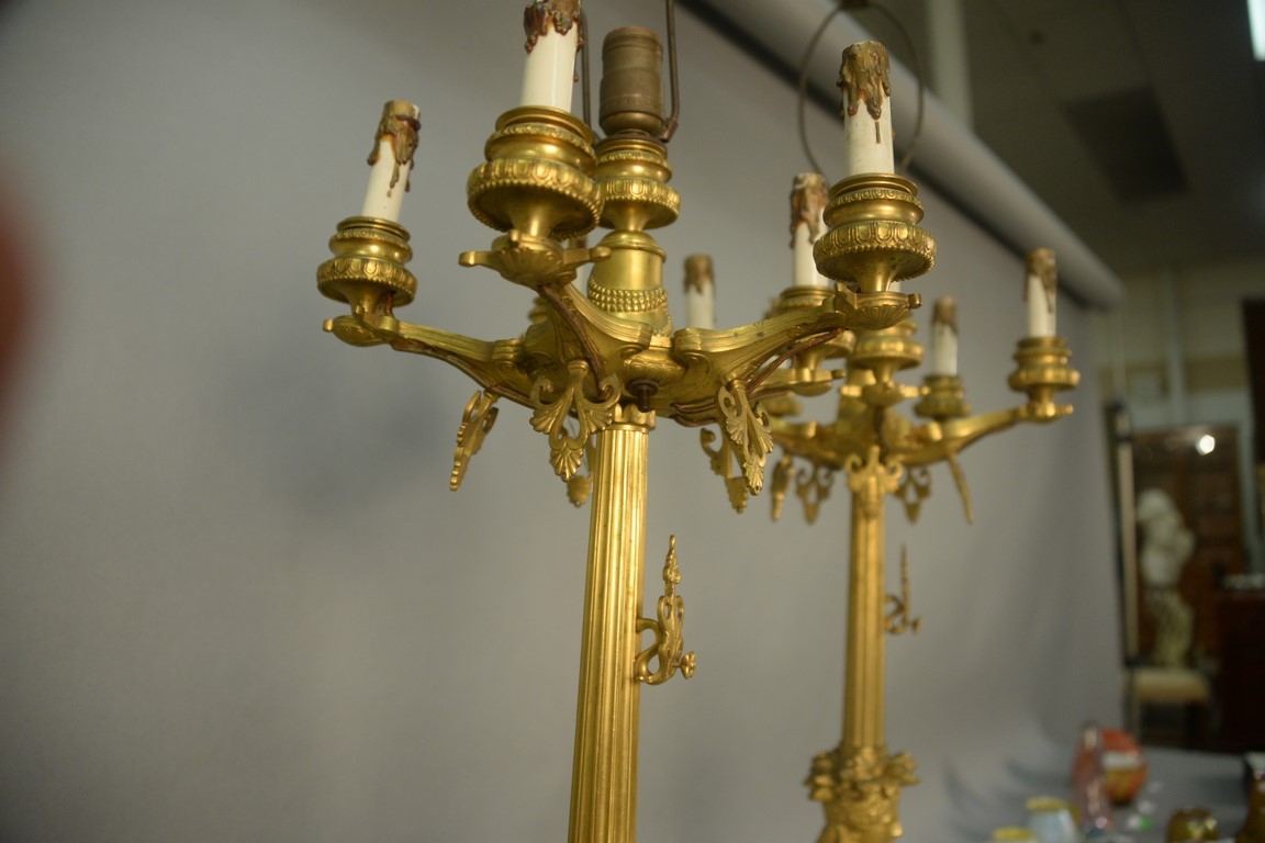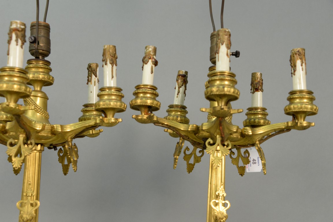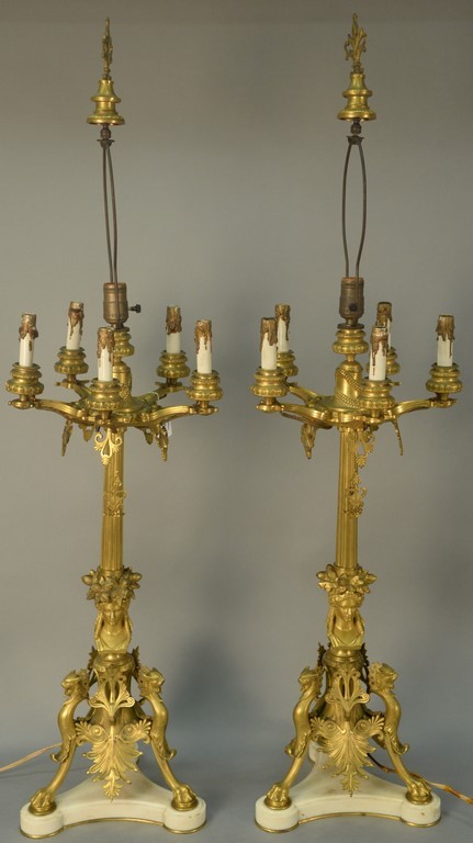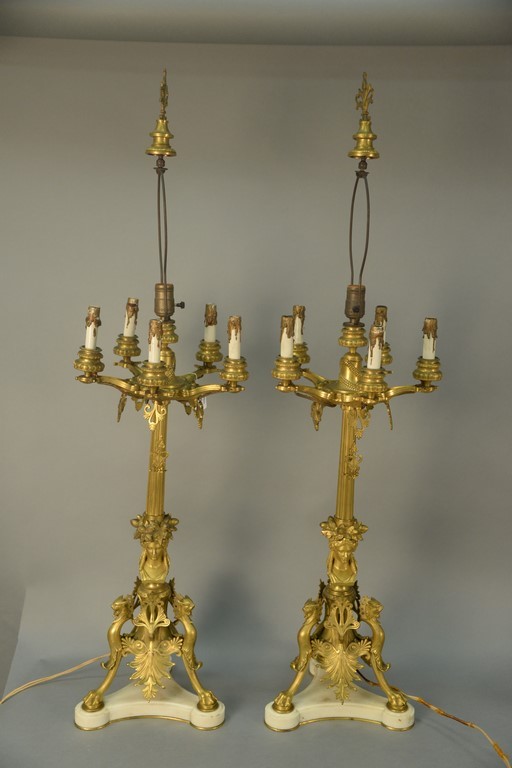 Lot 48: Pair of Napoleon III patinated bronze five light candelabra by Barbedienne, each having five scroll branches terminating with bulbou…