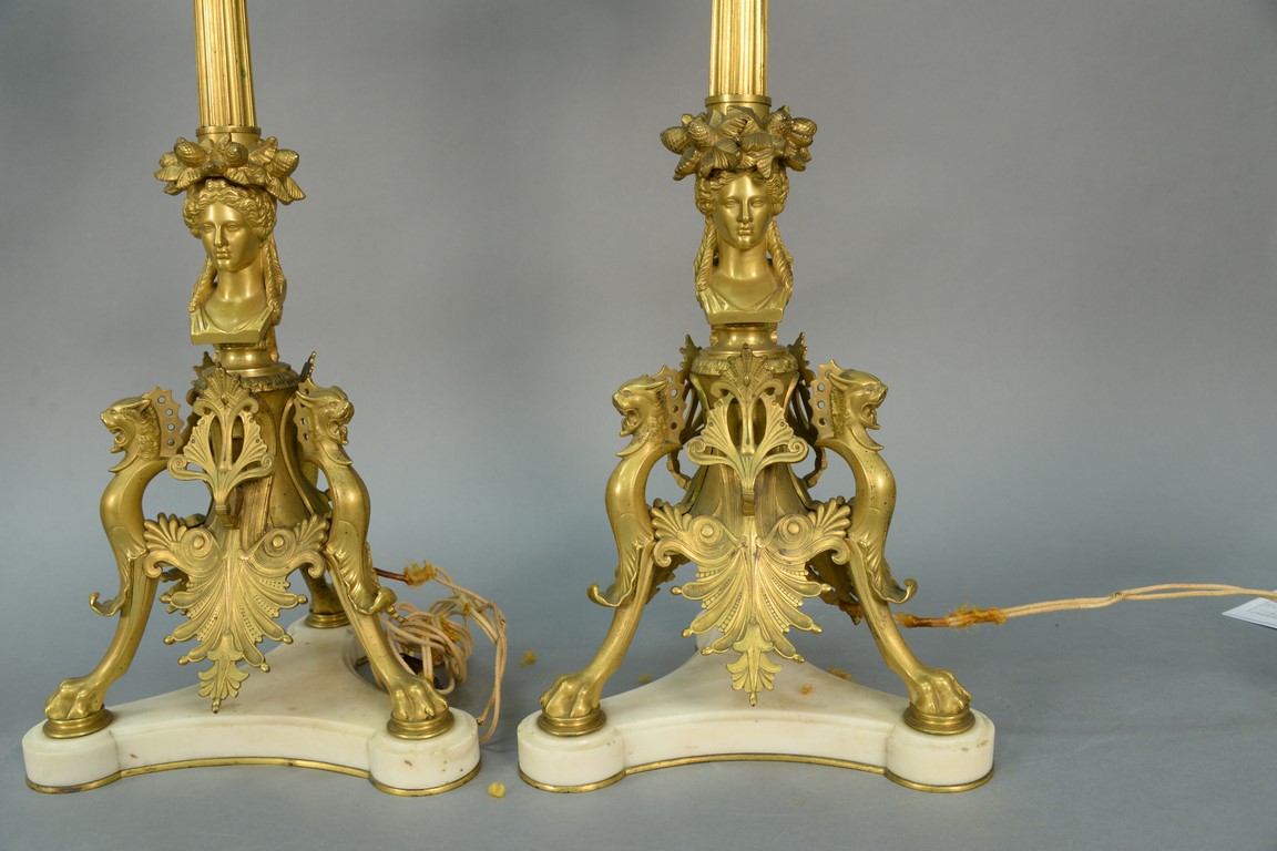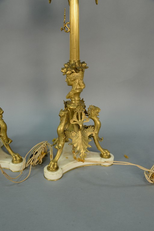 Pair of Napoleon III patinated bronze five light candelabra by Barbedienne, each having five scroll branches terminating with bulbous candle holders above fluted column supported by Classical bust wearing a pine and floral wreath over three griffon triform marble base, signed Barbedienne. ht. 29 1/2in., wd. 12in.