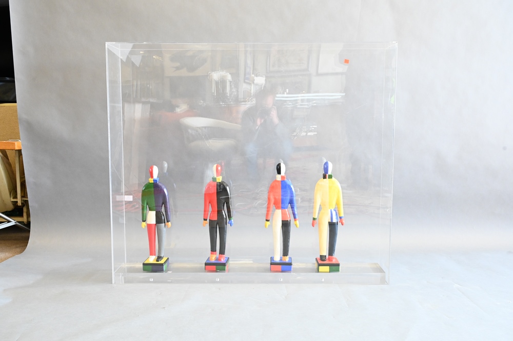 Lot 48: Set of Four Replica Papier Mache Figures of Clowns, each marked on base Guggenheim Museum one circa 1995 and three circa 1996, in large plexiglass case, height of each 19 – 19.5 inches.